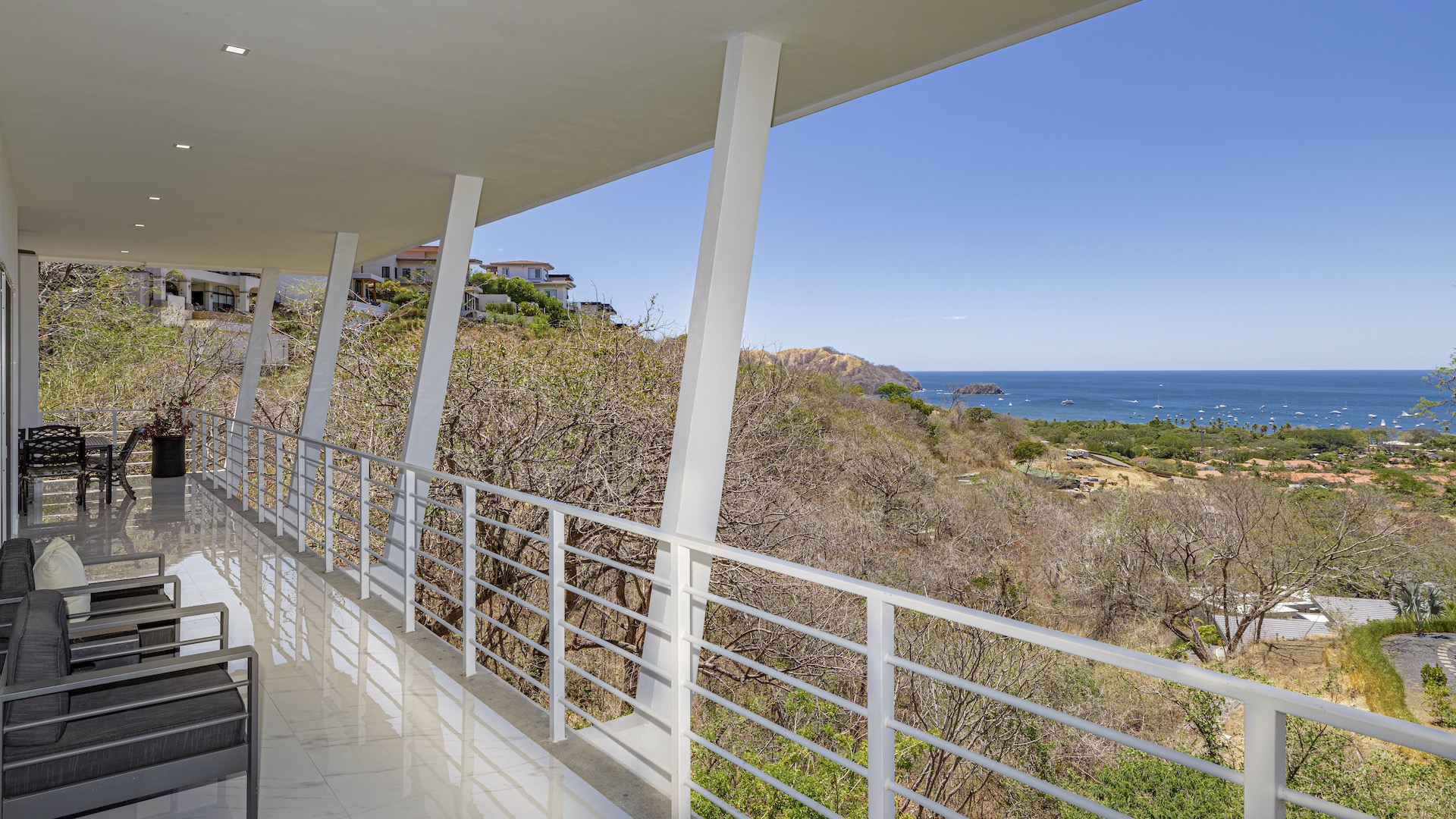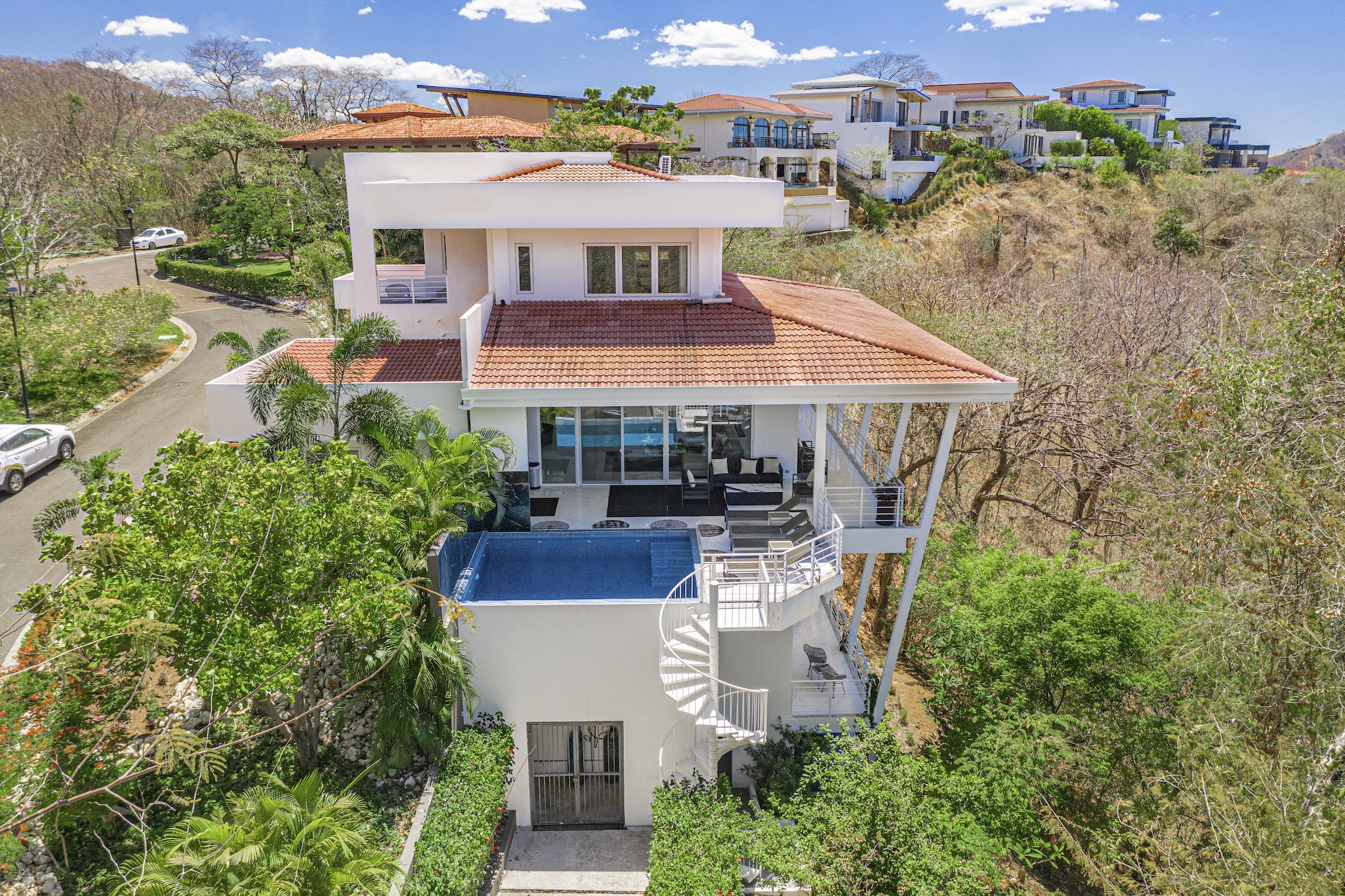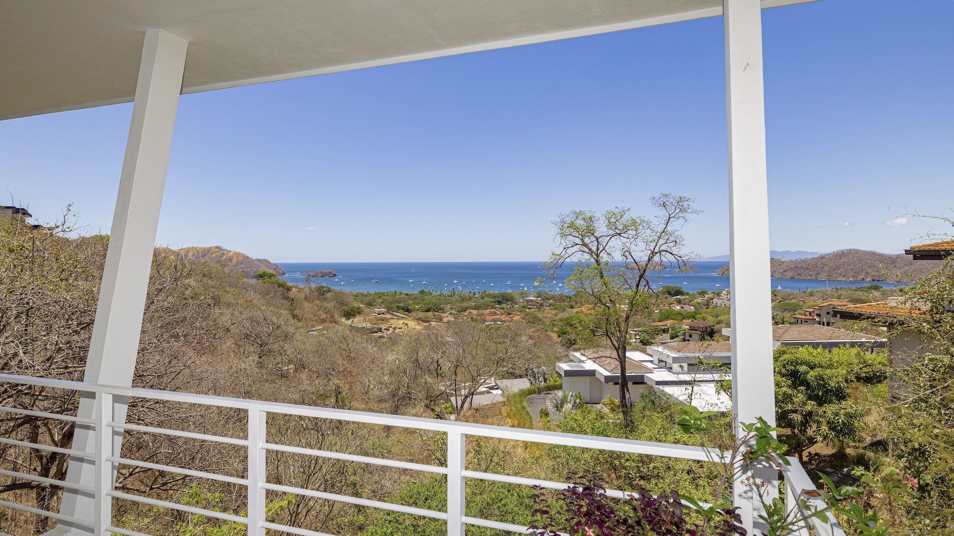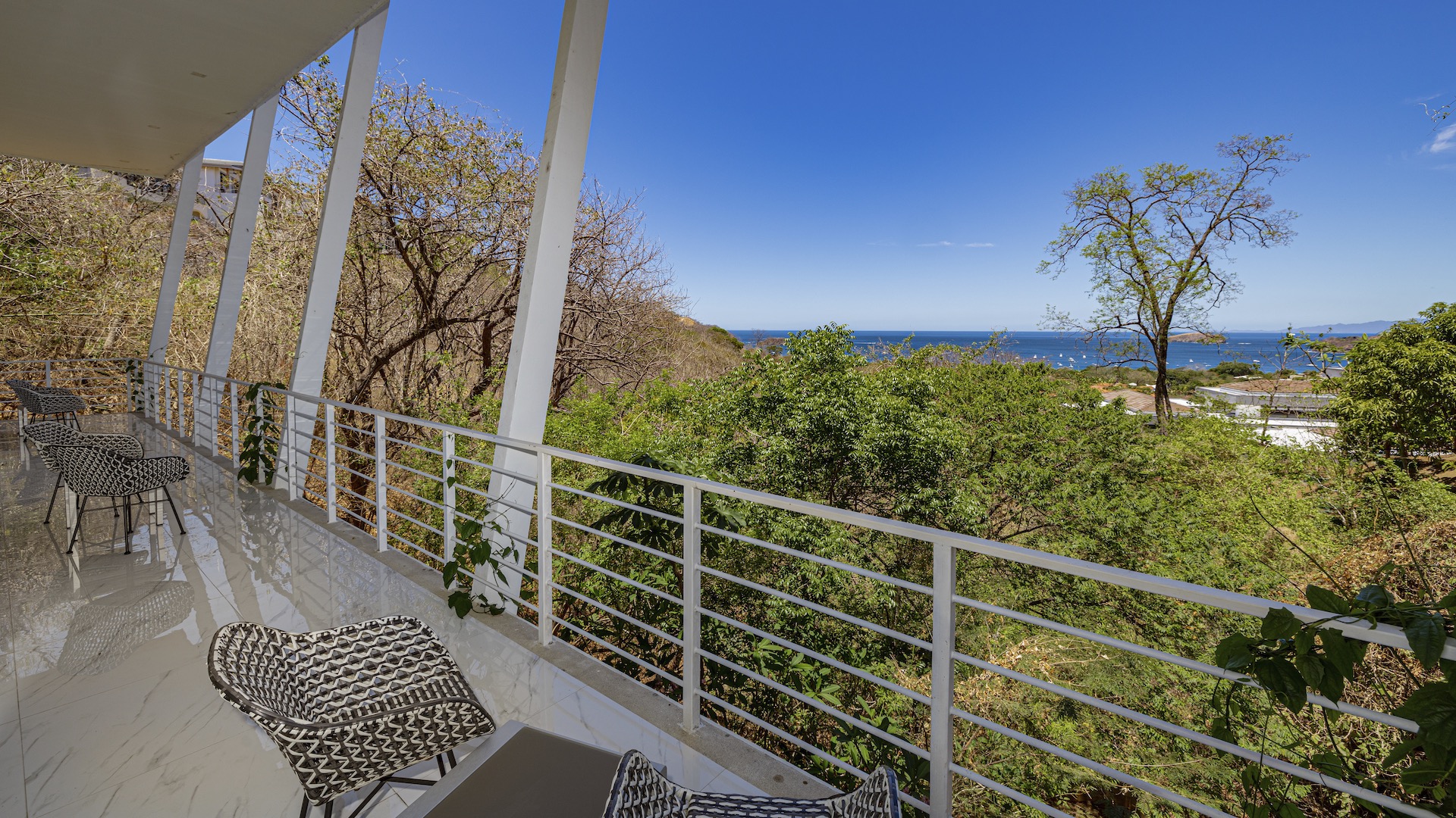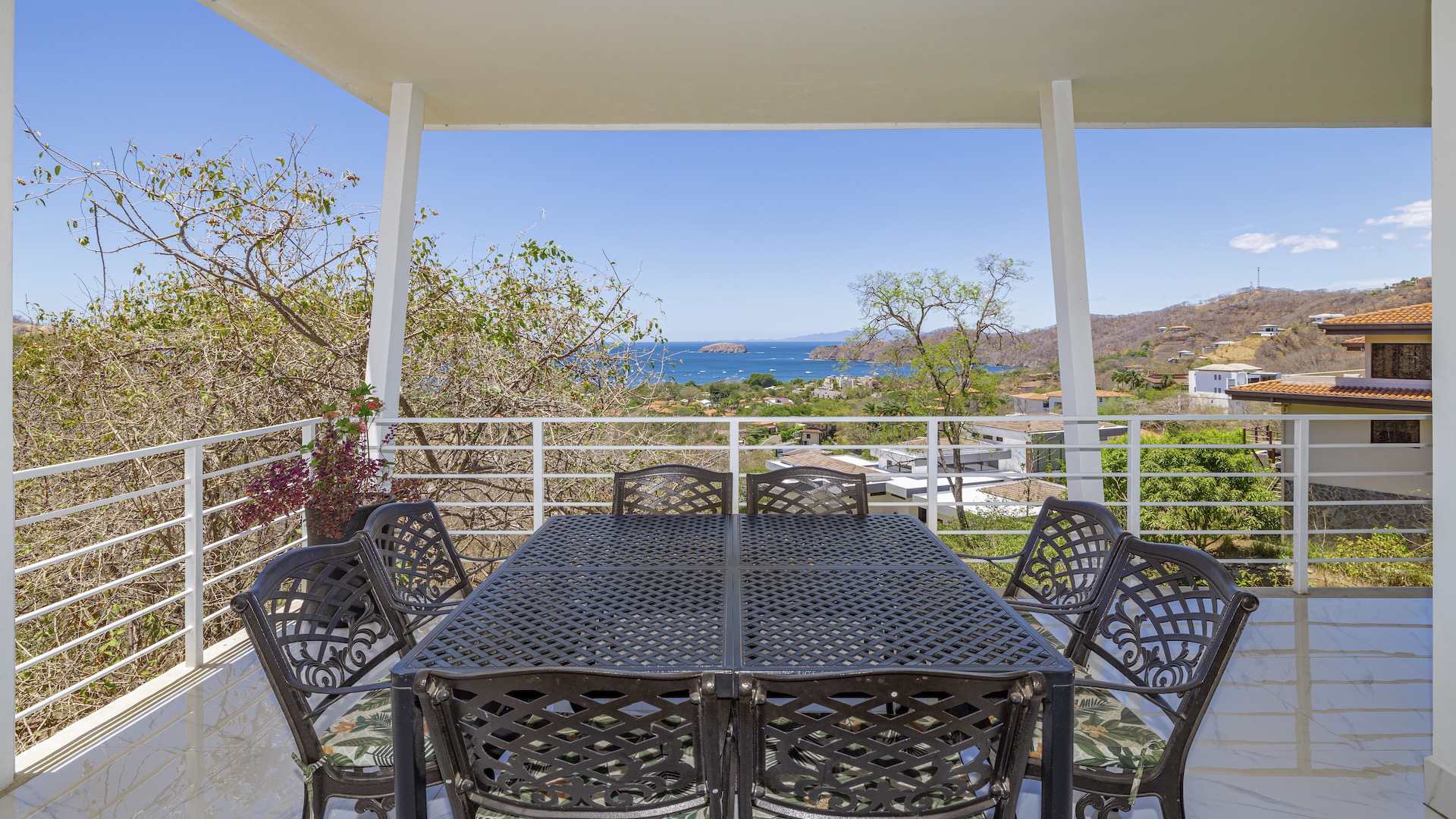 This stunning contemporary ocean-view residence offers an exceptional blend of luxury, comfort, and versatility within the prestigious Pacifico community. Boasting 5,497 total square feet on a 767-square-meter lot, including 3,733 square feet of air-conditioned living space, the fully furnished home features six spacious bedrooms—each with its own private ensuite bathroom—plus an additional full guest bath. The main level showcases an expansive great room where the gourmet kitchen, dining, and living areas seamlessly flow onto a sweeping covered terrace and spectacular ocean-view pool, complete with a sumptuous BBQ and wet bar zone, generous covered lounging spaces, sunning areas, and a separate covered outdoor dining room off the kitchen. This wraparound terrace extends across the entire façade, creating an ideal setting for entertaining and enjoying breathtaking sunsets. Also on the main floor are a full bedroom, two bathrooms, and an attached two-car garage. The upper level hosts two ocean-view bedroom suites, each with private terraces, along with a cozy TV lounge and office nook at the top of the stairs. The lower level offers three additional ocean-view bedroom suites with private terraces and sitting areas, a laundry room, and a spacious family room designed for games and media. Additional off-street parking on the lower level provides convenient access to the main floor via elegant spiral stairs. High-end finishes throughout include imported energy-efficient windows and sliding glass doors, luxury porcelain tile flooring, quartz countertops, and custom cabinetry. As a Pacifico resident, enjoy exclusive access to world-class amenities such as multiple resort-style pools, a private Beach Club with bar and restaurant, a poolside grill, tennis and pickleball courts, and a state-of-the-art fitness center. Ideally located within walking distance of Playa del Coco’s vibrant dining, shopping, and medical services, and just 25 minutes from Guanacaste International Airport (LIR) as well as minutes from the pristine beaches of the Papagayo region, this remarkable property presents an outstanding opportunity to enjoy a dream vacation or retirement home while also generating attractive rental income.