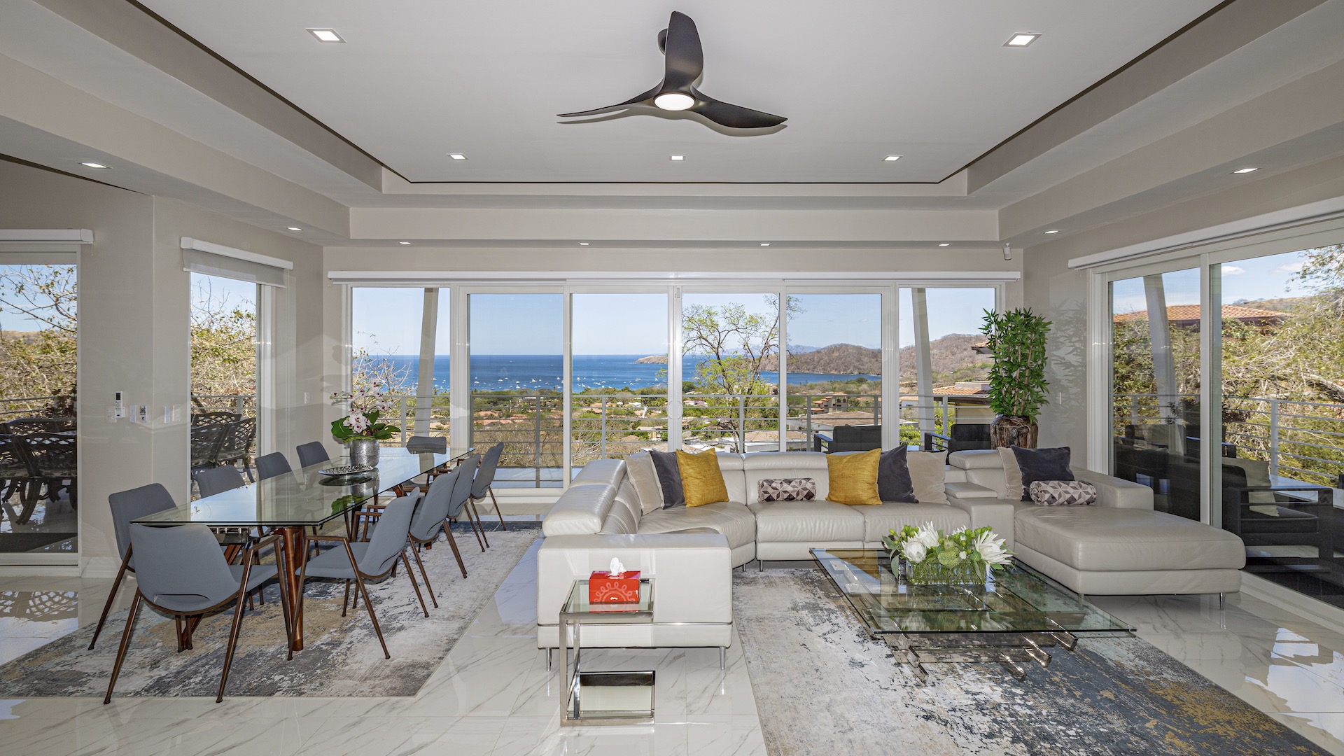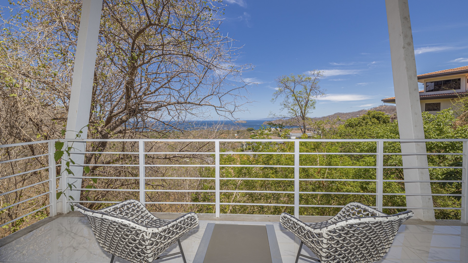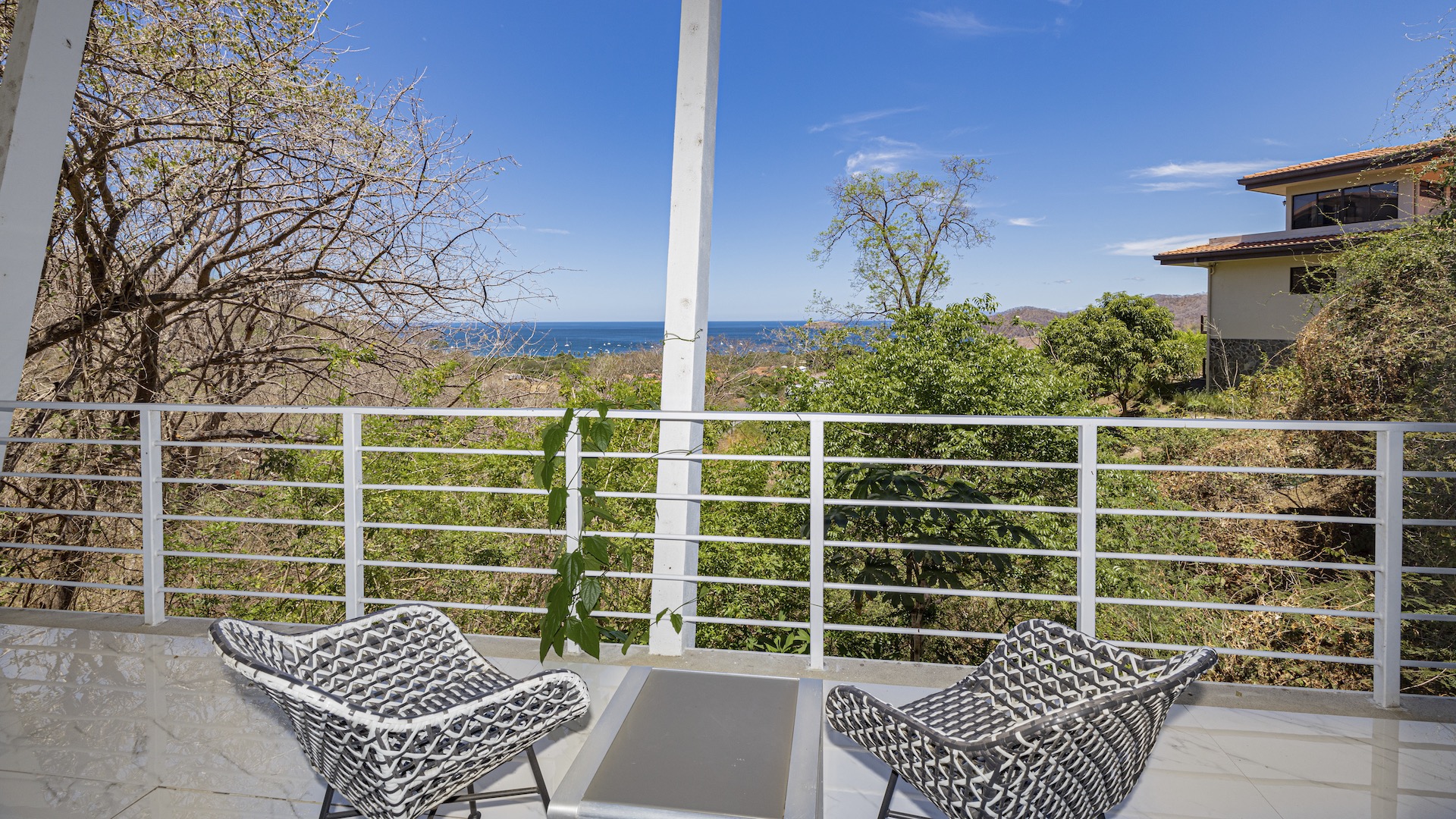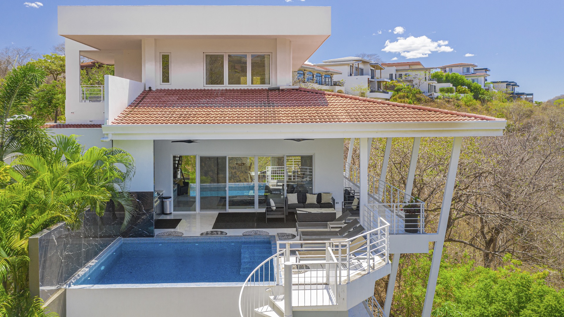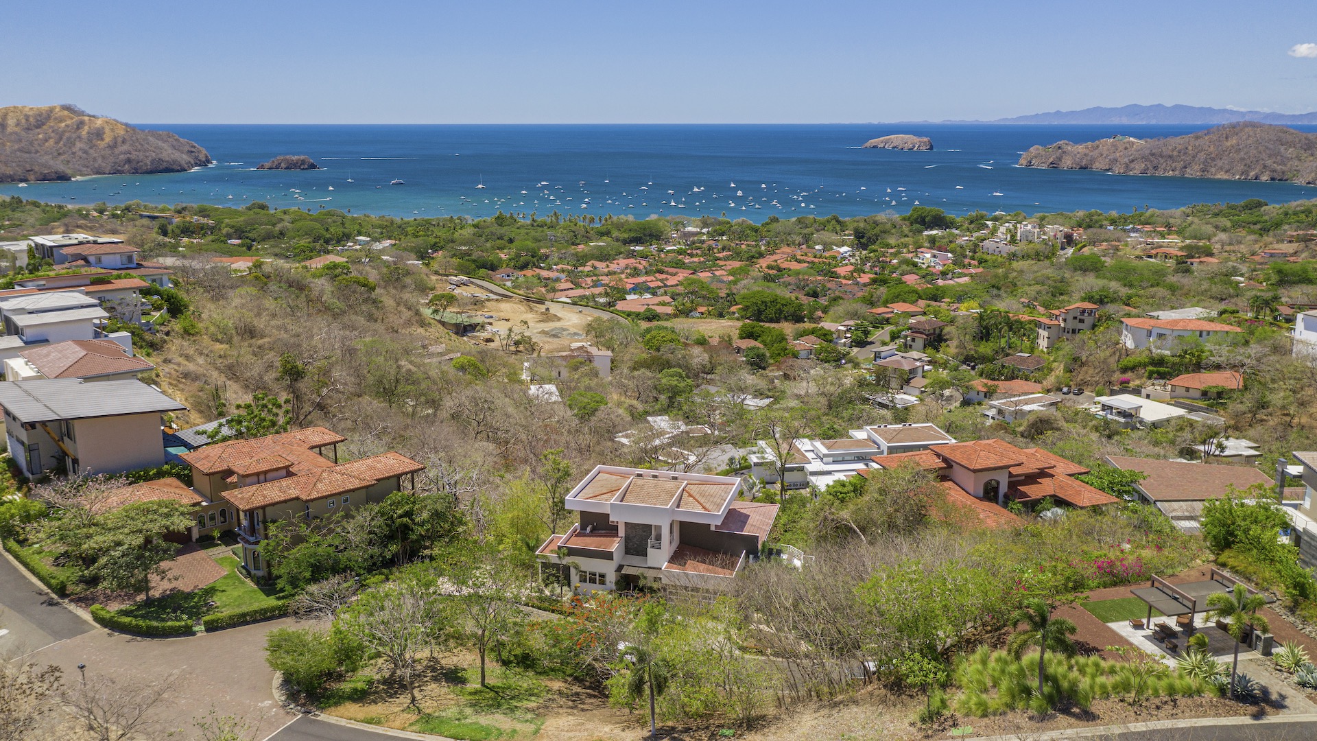 This stunning contemporary ocean-view residence offers an exceptional blend of luxury, comfort, and versatility within the prestigious Pacifico community. Boasting 5,497 total square feet on a 767-square-meter lot, including 3,733 square feet of air-conditioned living space, the fully furnished home features six spacious bedrooms—each with its own private ensuite bathroom—plus an additional full guest bath. The main level showcases an expansive great room where the gourmet kitchen, dining, and living areas seamlessly flow onto a sweeping covered terrace and spectacular ocean-view pool, complete with a sumptuous BBQ and wet bar zone, generous covered lounging spaces, sunning areas, and a separate covered outdoor dining room off the kitchen. This wraparound terrace extends across the entire façade, creating an ideal setting for entertaining and enjoying breathtaking sunsets. Also on the main floor are a full bedroom, two bathrooms, and an attached two-car garage. The upper level hosts two ocean-view bedroom suites, each with private terraces, along with a cozy TV lounge and office nook at the top of the stairs. The lower level offers three additional ocean-view bedroom suites with private terraces and sitting areas, a laundry room, and a spacious family room designed for games and media. Additional off-street parking on the lower level provides convenient access to the main floor via elegant spiral stairs. High-end finishes throughout include imported energy-efficient windows and sliding glass doors, luxury porcelain tile flooring, quartz countertops, and custom cabinetry. As a Pacifico resident, enjoy exclusive access to world-class amenities such as multiple resort-style pools, a private Beach Club with bar and restaurant, a poolside grill, tennis and pickleball courts, and a state-of-the-art fitness center. Ideally located within walking distance of Playa del Coco’s vibrant dining, shopping, and medical services, and just 25 minutes from Guanacaste International Airport (LIR) as well as minutes from the pristine beaches of the Papagayo region, this remarkable property presents an outstanding opportunity to enjoy a dream vacation or retirement home while also generating attractive rental income.
