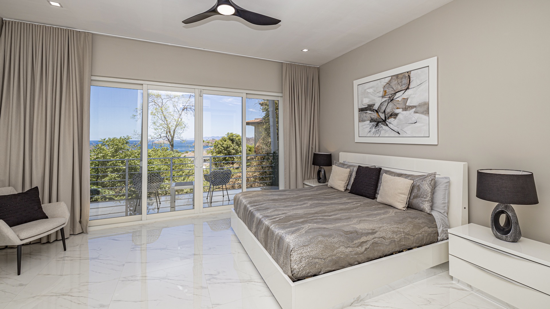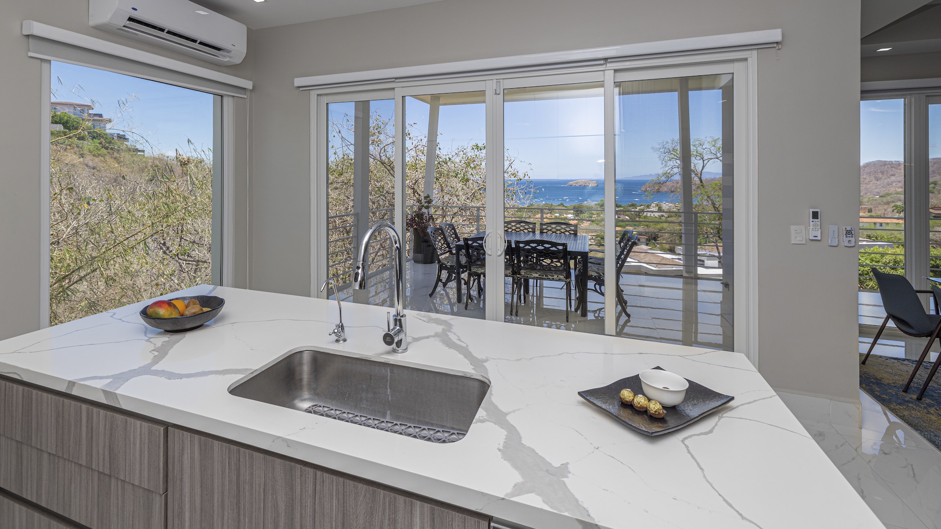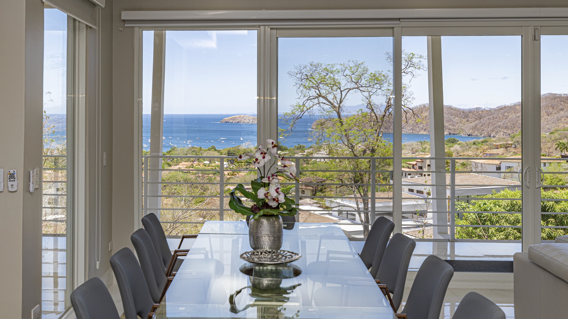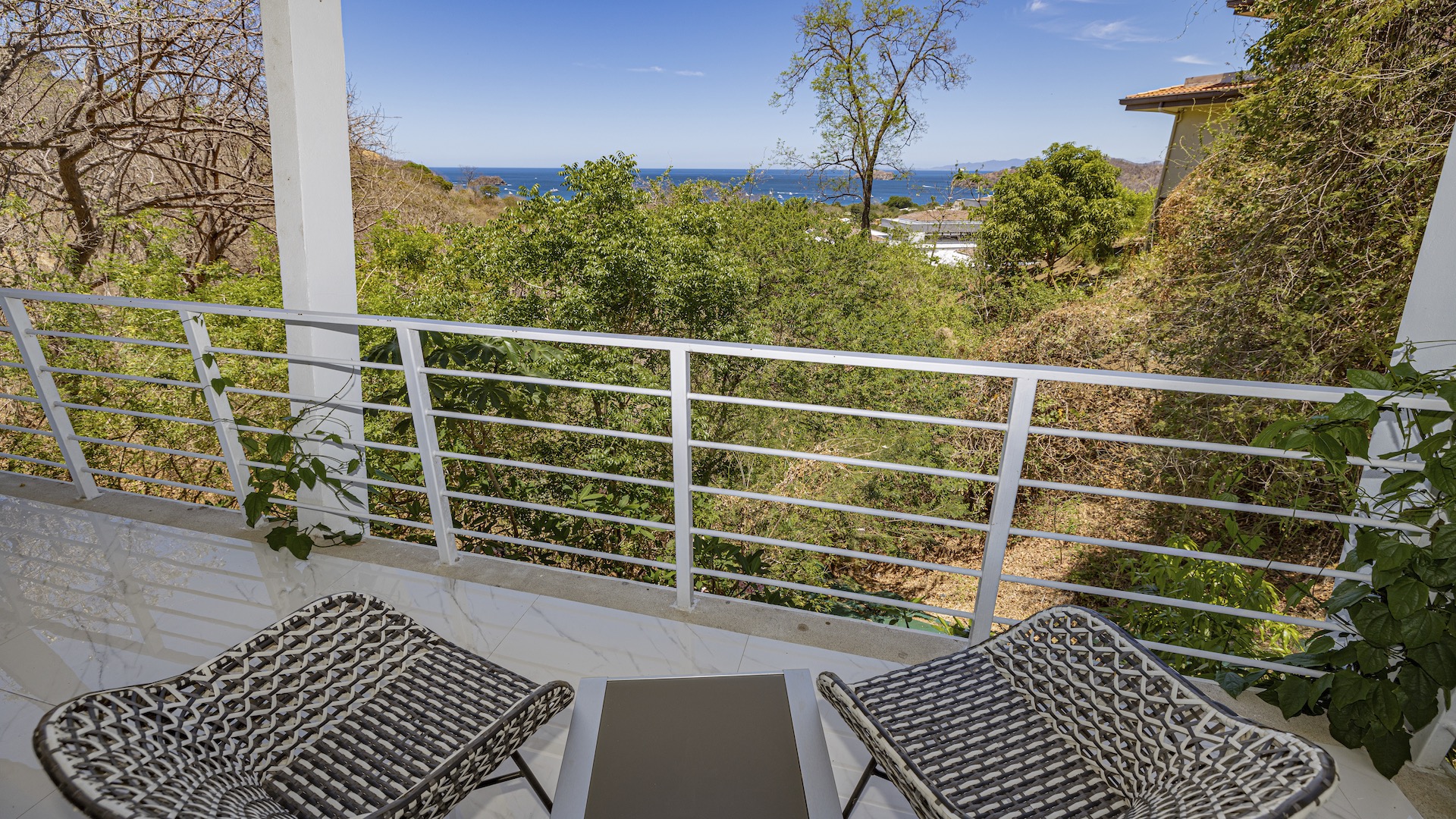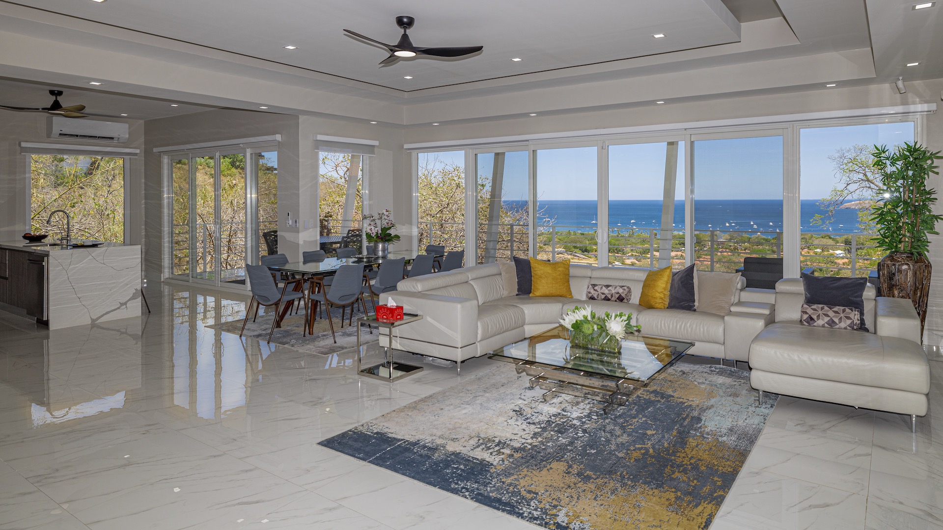This stunning contemporary ocean-view residence offers an exceptional blend of luxury, comfort, and versatility within the prestigious Pacifico community. Boasting 5,497 total square feet on a 767-square-meter lot, including 3,733 square feet of air-conditioned living space, the fully furnished home features six spacious bedrooms—each with its own private ensuite bathroom—plus an additional full guest bath. The main level showcases an expansive great room where the gourmet kitchen, dining, and living areas seamlessly flow onto a sweeping covered terrace and spectacular ocean-view pool, complete with a sumptuous BBQ and wet bar zone, generous covered lounging spaces, sunning areas, and a separate covered outdoor dining room off the kitchen. This wraparound terrace extends across the entire façade, creating an ideal setting for entertaining and enjoying breathtaking sunsets. Also on the main floor are a full bedroom, two bathrooms, and an attached two-car garage. The upper level hosts two ocean-view bedroom suites, each with private terraces, along with a cozy TV lounge and office nook at the top of the stairs. The lower level offers three additional ocean-view bedroom suites with private terraces and sitting areas, a laundry room, and a spacious family room designed for games and media. Additional off-street parking on the lower level provides convenient access to the main floor via elegant spiral stairs. High-end finishes throughout include imported energy-efficient windows and sliding glass doors, luxury porcelain tile flooring, quartz countertops, and custom cabinetry. As a Pacifico resident, enjoy exclusive access to world-class amenities such as multiple resort-style pools, a private Beach Club with bar and restaurant, a poolside grill, tennis and pickleball courts, and a state-of-the-art fitness center. Ideally located within walking distance of Playa del Coco’s vibrant dining, shopping, and medical services, and just 25 minutes from Guanacaste International Airport (LIR) as well as minutes from the pristine beaches of the Papagayo region, this remarkable property presents an outstanding opportunity to enjoy a dream vacation or retirement home while also generating attractive rental income.