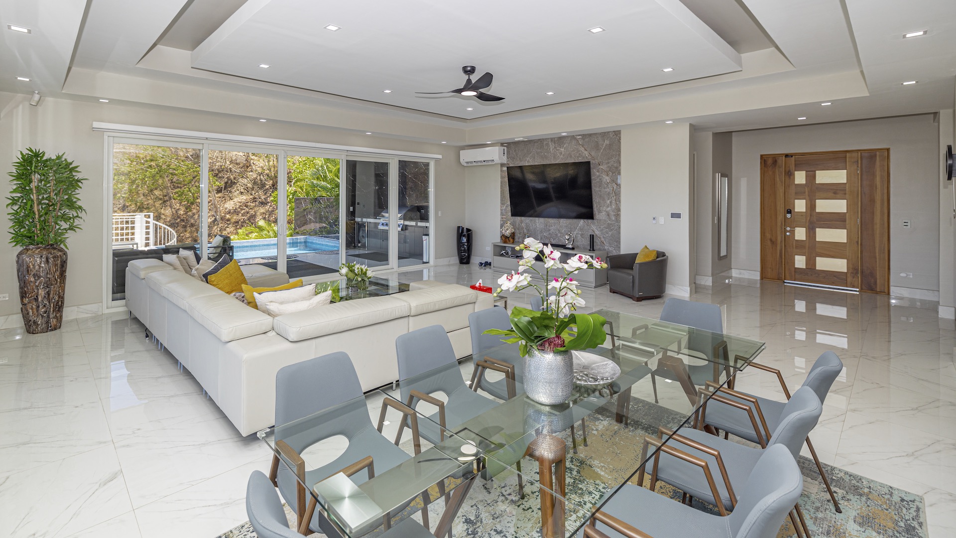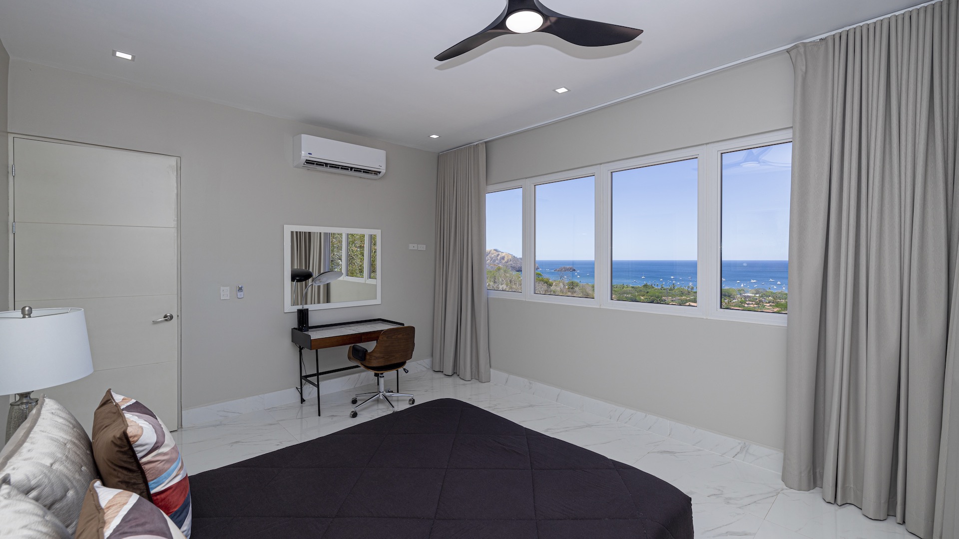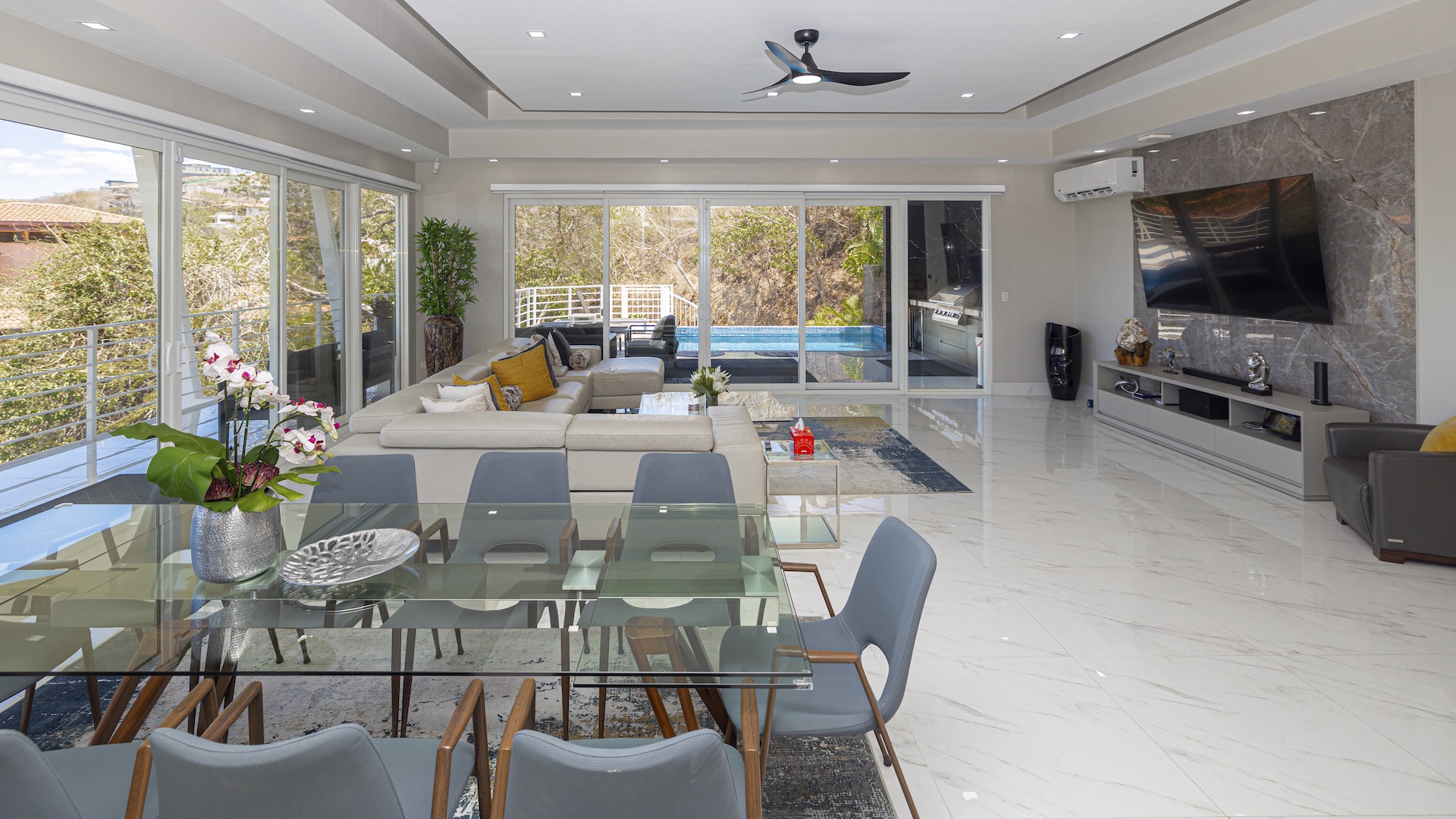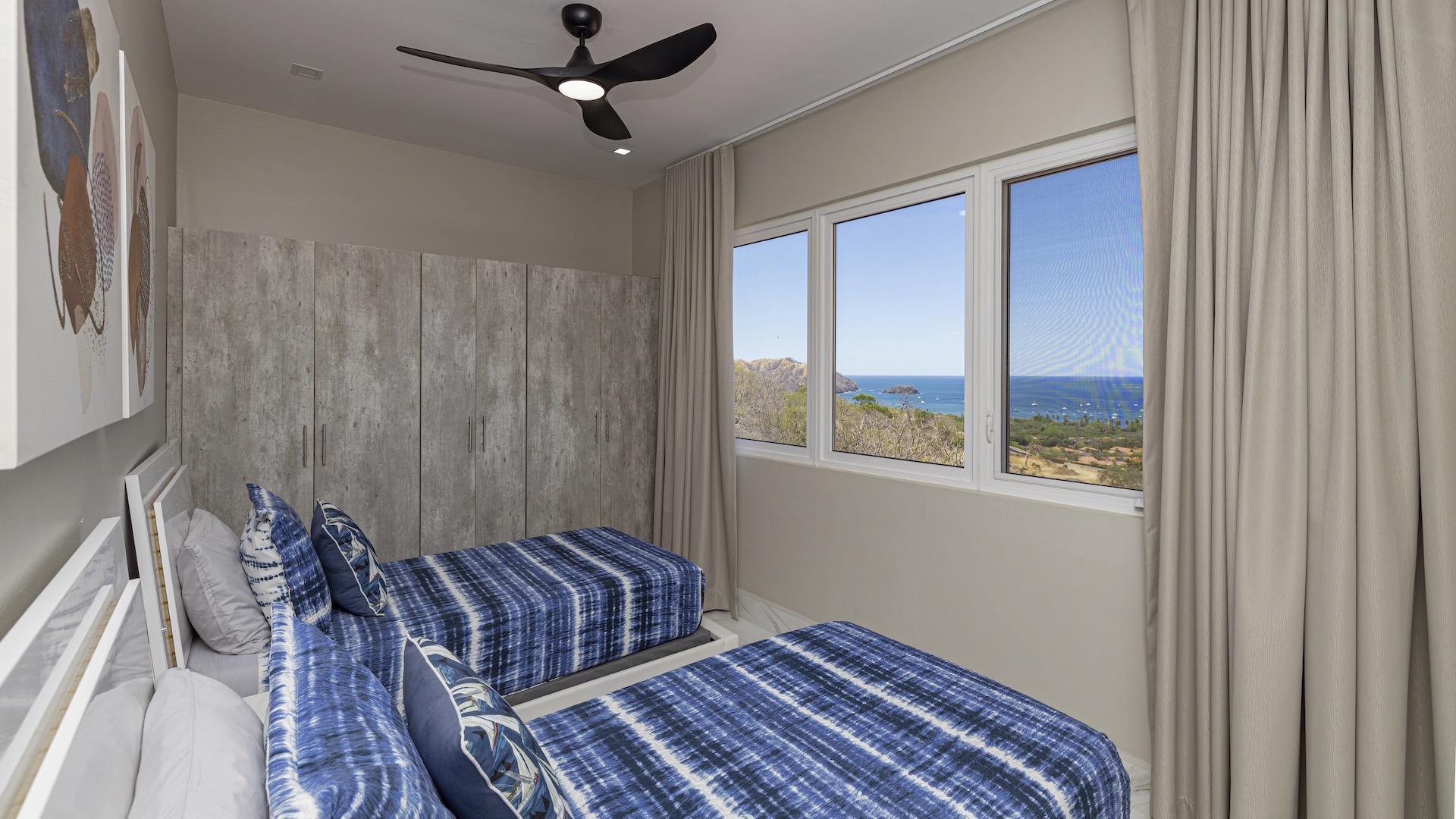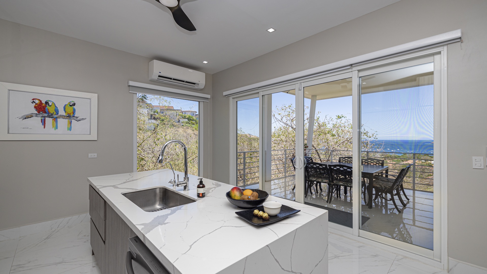 This stunning contemporary ocean-view residence offers an exceptional blend of luxury, comfort, and versatility within the prestigious Pacifico community. Boasting 5,497 total square feet on a 767-square-meter lot, including 3,733 square feet of air-conditioned living space, the fully furnished home features six spacious bedrooms—each with its own private ensuite bathroom—plus an additional full guest bath. The main level showcases an expansive great room where the gourmet kitchen, dining, and living areas seamlessly flow onto a sweeping covered terrace and spectacular ocean-view pool, complete with a sumptuous BBQ and wet bar zone, generous covered lounging spaces, sunning areas, and a separate covered outdoor dining room off the kitchen. This wraparound terrace extends across the entire façade, creating an ideal setting for entertaining and enjoying breathtaking sunsets. Also on the main floor are a full bedroom, two bathrooms, and an attached two-car garage. The upper level hosts two ocean-view bedroom suites, each with private terraces, along with a cozy TV lounge and office nook at the top of the stairs. The lower level offers three additional ocean-view bedroom suites with private terraces and sitting areas, a laundry room, and a spacious family room designed for games and media. Additional off-street parking on the lower level provides convenient access to the main floor via elegant spiral stairs. High-end finishes throughout include imported energy-efficient windows and sliding glass doors, luxury porcelain tile flooring, quartz countertops, and custom cabinetry. As a Pacifico resident, enjoy exclusive access to world-class amenities such as multiple resort-style pools, a private Beach Club with bar and restaurant, a poolside grill, tennis and pickleball courts, and a state-of-the-art fitness center. Ideally located within walking distance of Playa del Coco’s vibrant dining, shopping, and medical services, and just 25 minutes from Guanacaste International Airport (LIR) as well as minutes from the pristine beaches of the Papagayo region, this remarkable property presents an outstanding opportunity to enjoy a dream vacation or retirement home while also generating attractive rental income.