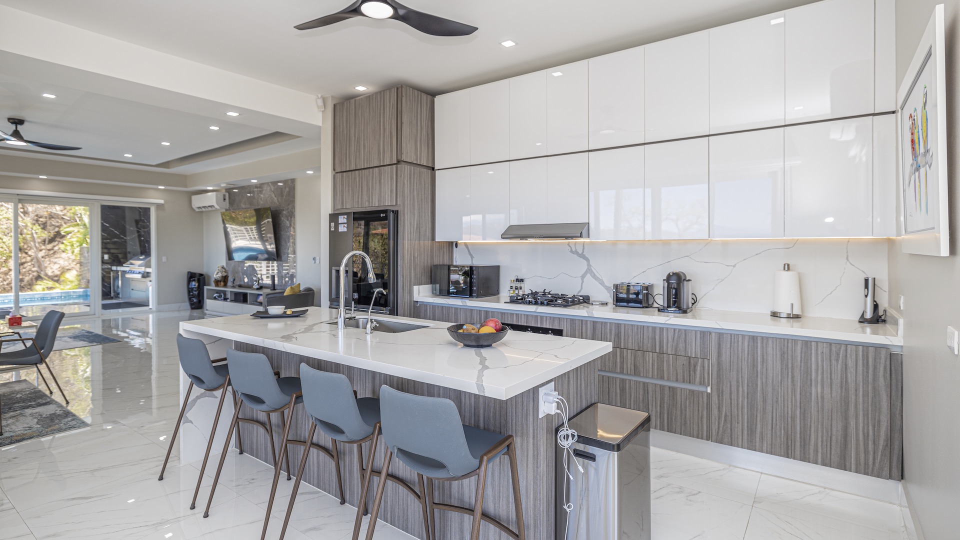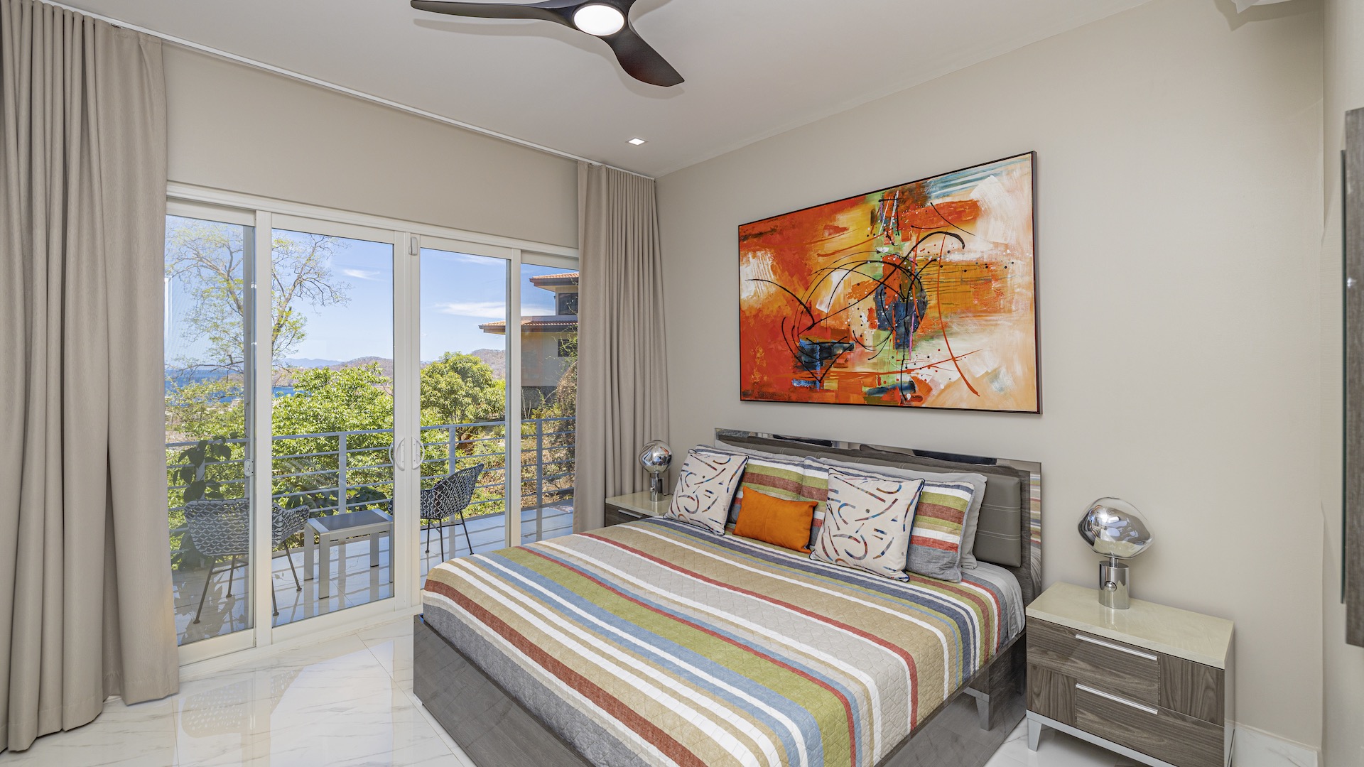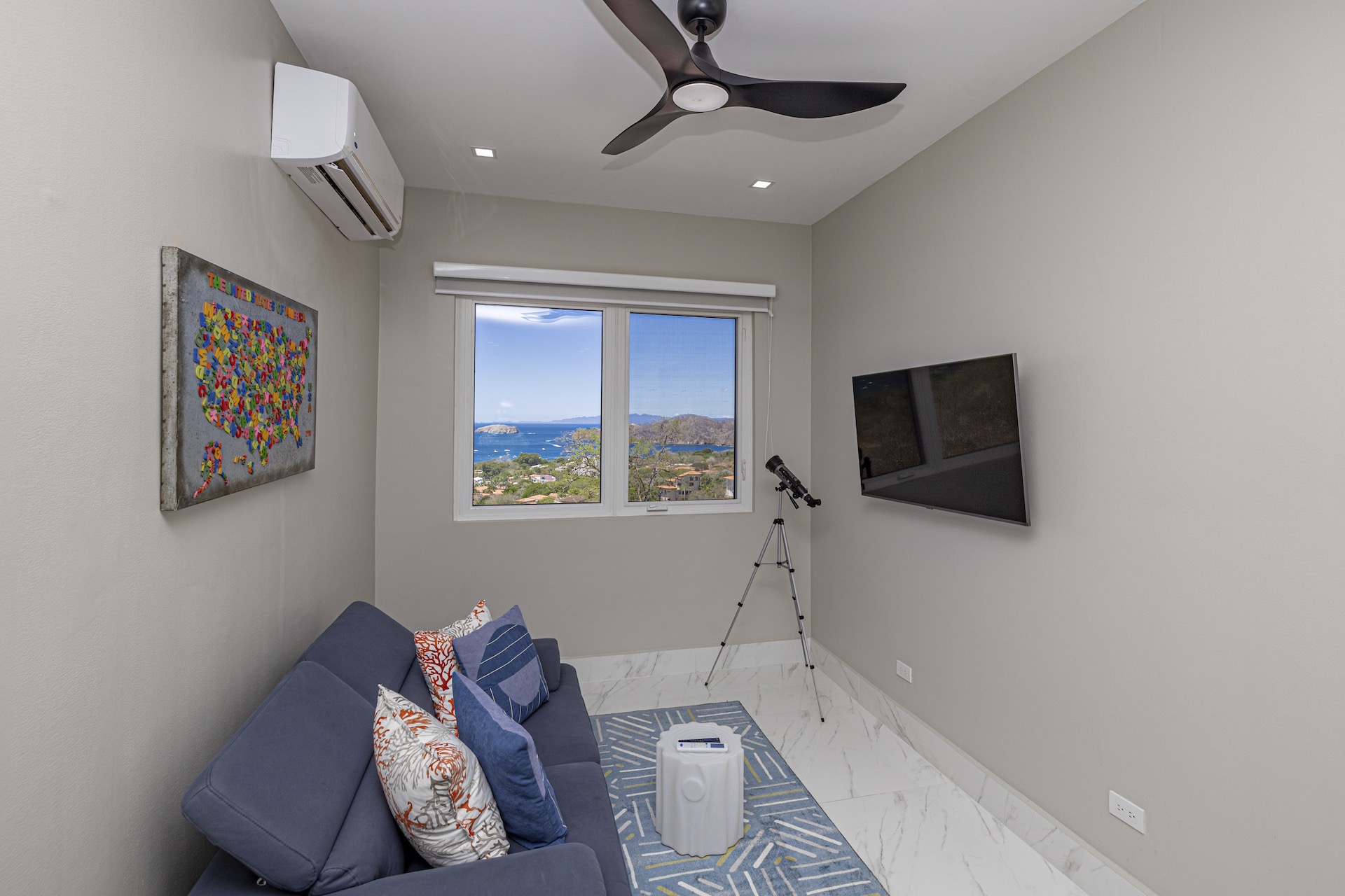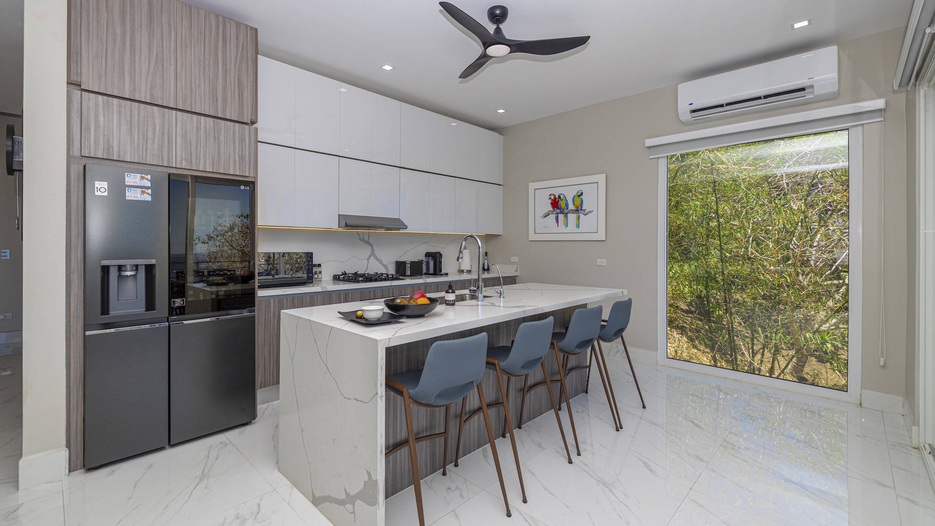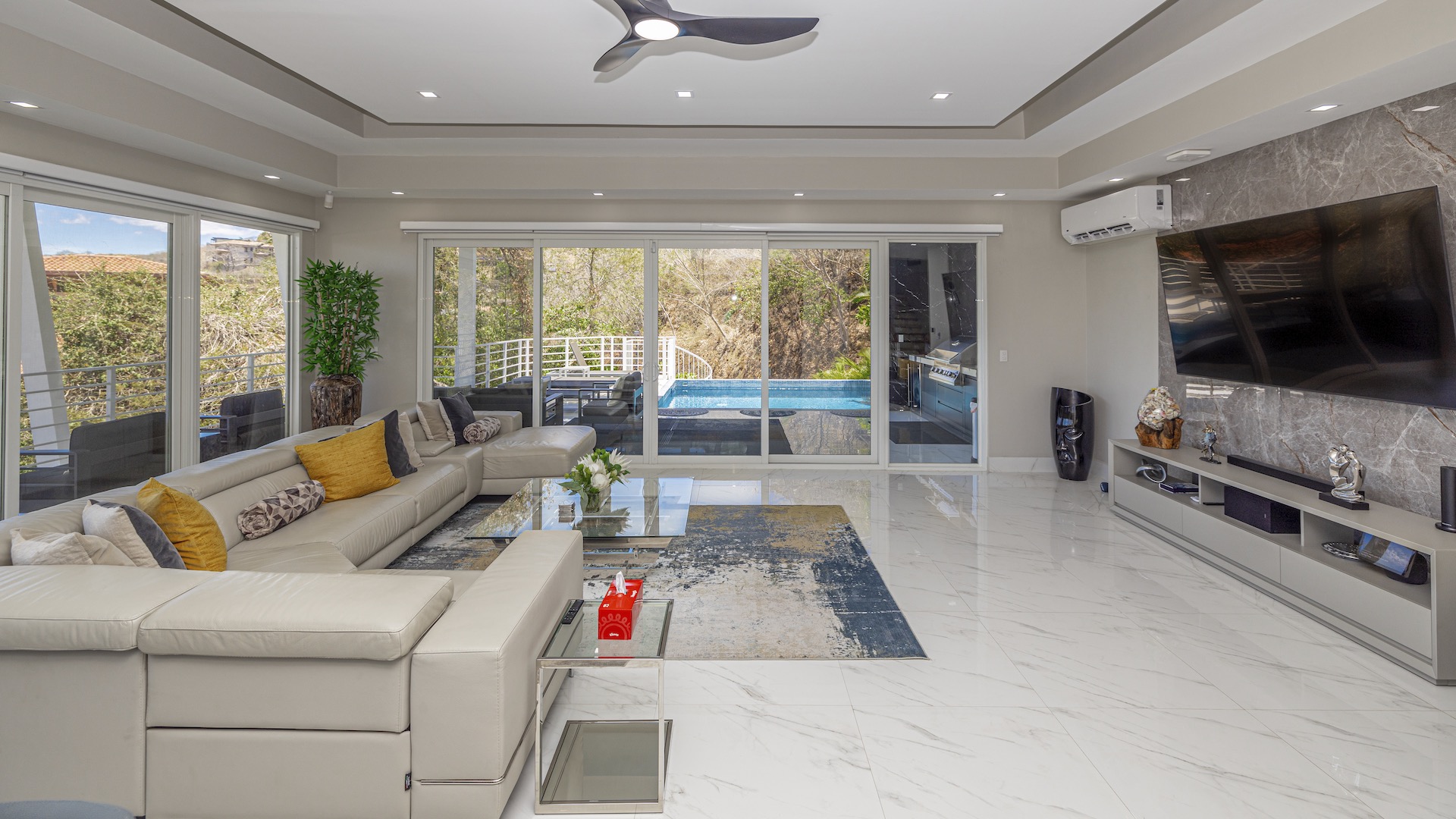 This stunning contemporary ocean-view residence offers an exceptional blend of luxury, comfort, and versatility within the prestigious Pacifico community. Boasting 5,497 total square feet on a 767-square-meter lot, including 3,733 square feet of air-conditioned living space, the fully furnished home features six spacious bedrooms—each with its own private ensuite bathroom—plus an additional full guest bath. The main level showcases an expansive great room where the gourmet kitchen, dining, and living areas seamlessly flow onto a sweeping covered terrace and spectacular ocean-view pool, complete with a sumptuous BBQ and wet bar zone, generous covered lounging spaces, sunning areas, and a separate covered outdoor dining room off the kitchen. This wraparound terrace extends across the entire façade, creating an ideal setting for entertaining and enjoying breathtaking sunsets. Also on the main floor are a full bedroom, two bathrooms, and an attached two-car garage. The upper level hosts two ocean-view bedroom suites, each with private terraces, along with a cozy TV lounge and office nook at the top of the stairs. The lower level offers three additional ocean-view bedroom suites with private terraces and sitting areas, a laundry room, and a spacious family room designed for games and media. Additional off-street parking on the lower level provides convenient access to the main floor via elegant spiral stairs. High-end finishes throughout include imported energy-efficient windows and sliding glass doors, luxury porcelain tile flooring, quartz countertops, and custom cabinetry. As a Pacifico resident, enjoy exclusive access to world-class amenities such as multiple resort-style pools, a private Beach Club with bar and restaurant, a poolside grill, tennis and pickleball courts, and a state-of-the-art fitness center. Ideally located within walking distance of Playa del Coco’s vibrant dining, shopping, and medical services, and just 25 minutes from Guanacaste International Airport (LIR) as well as minutes from the pristine beaches of the Papagayo region, this remarkable property presents an outstanding opportunity to enjoy a dream vacation or retirement home while also generating attractive rental income.