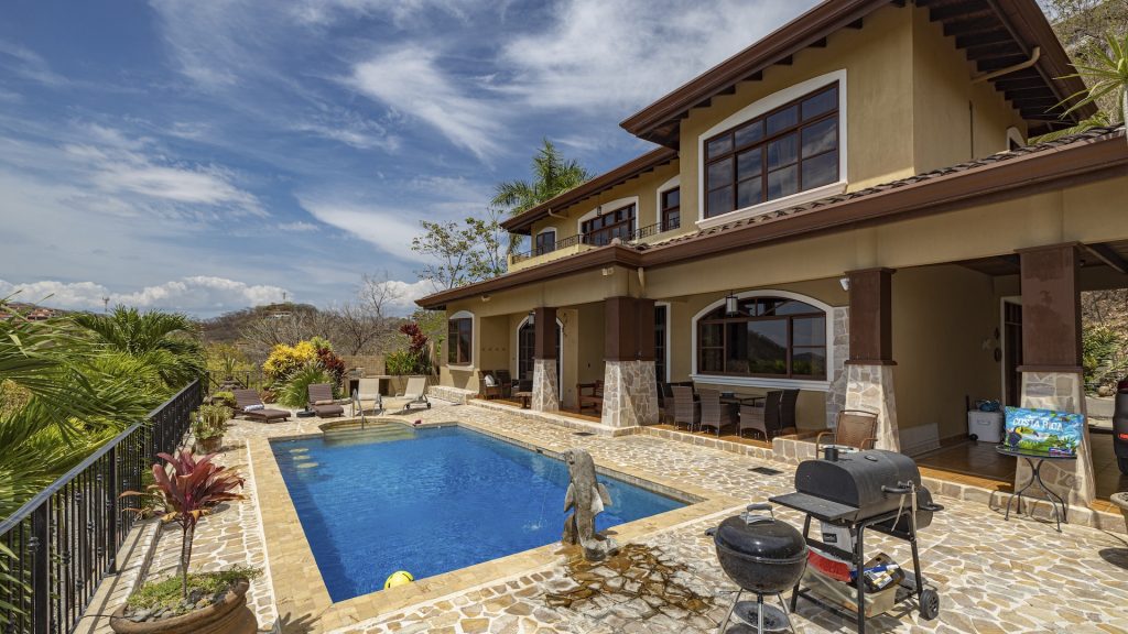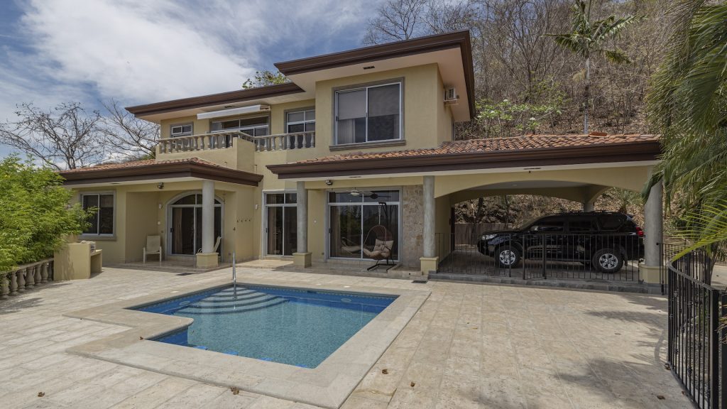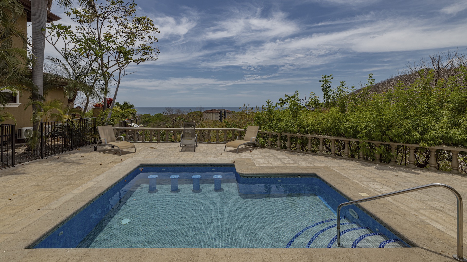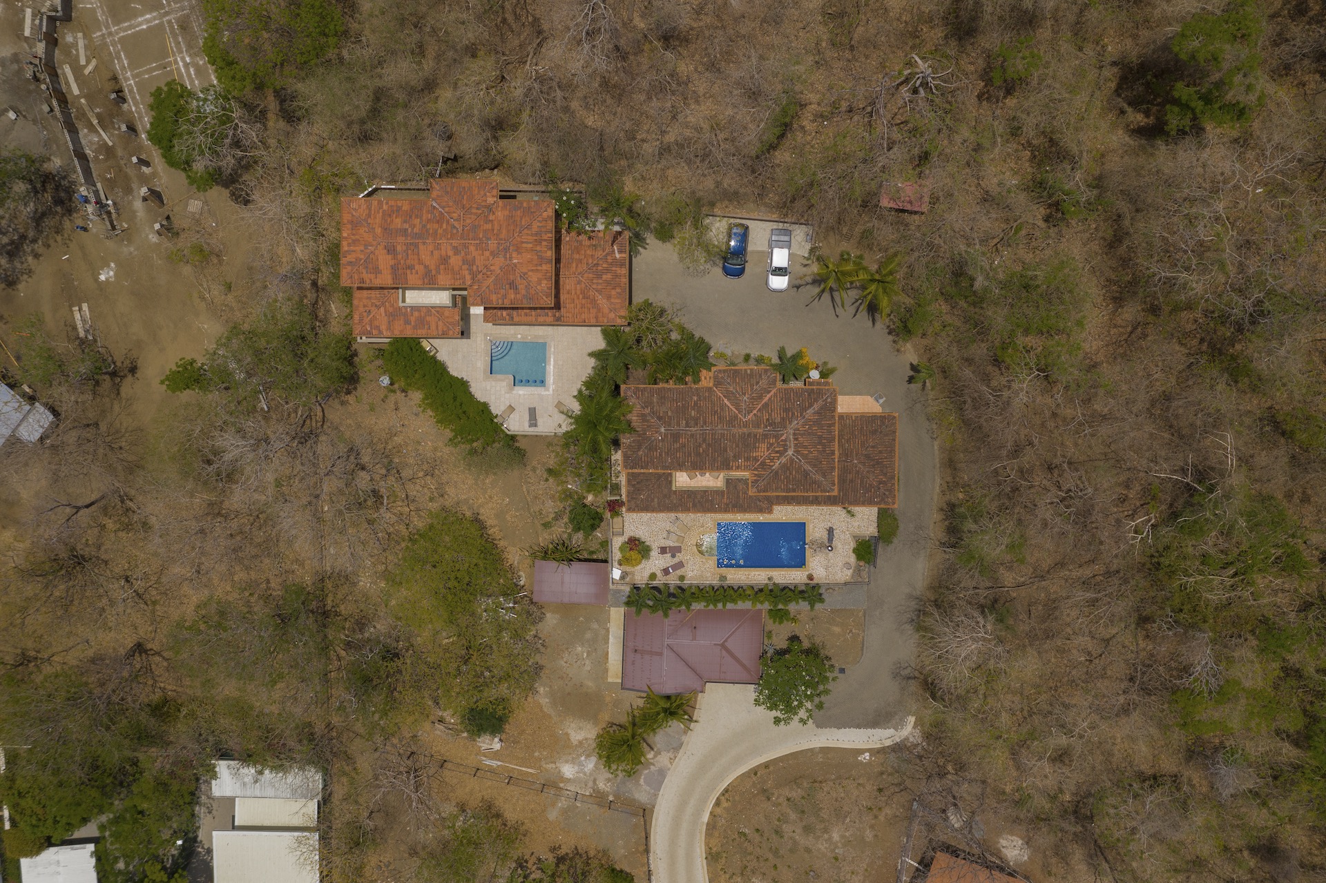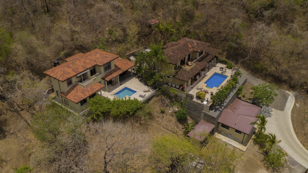 Two – 3 Bedroom, 3 Bathroom Ocean View Homes With Huge Terraces and 2 Pools. These two furnished ocean view homes comprise a one of a kind property with over an acre (4,586 Square Meters) of fully fenced and gated land surrounded by upscale ocean view home developments. Enjoy the cache of the neighborhood but not be tied to an HOA payment or rules. A short driveway leads up to the parking area in back of the two separate homes with the guest house and garage down below. Each home measures approximately 2,100 square feet for a total of 5,200 square feet and each has an attached carport and plenty overflow parking. Both houses have the same layout with different finishes and feature the living room, dining area and kitchen on the main floor along with a bedroom and ensuite bathroom, a nicely sized laundry room and half bathroom. Both feature large ocean view terraces and luxury sized pools. The second floor is the same layout as well with 2 bedrooms and 2 full bathrooms and walk out ocean view terraces from the master bedrooms. There is a full guest house or caretakers quarters down below with a full kitchen and living area, a bedroom and bathroom. This property is perfect for a vacation rental juggernaut or ideal as a family compound. Right between the upscale developments of Palo Alto and Monte Bello. A short drive to Playa Hermosa Beach and just 20 minutes to the Liberia International Airport and just minutes to various beaches, private hospitals, all services, restaurants, nightlife and watersports of the area. Move in Today