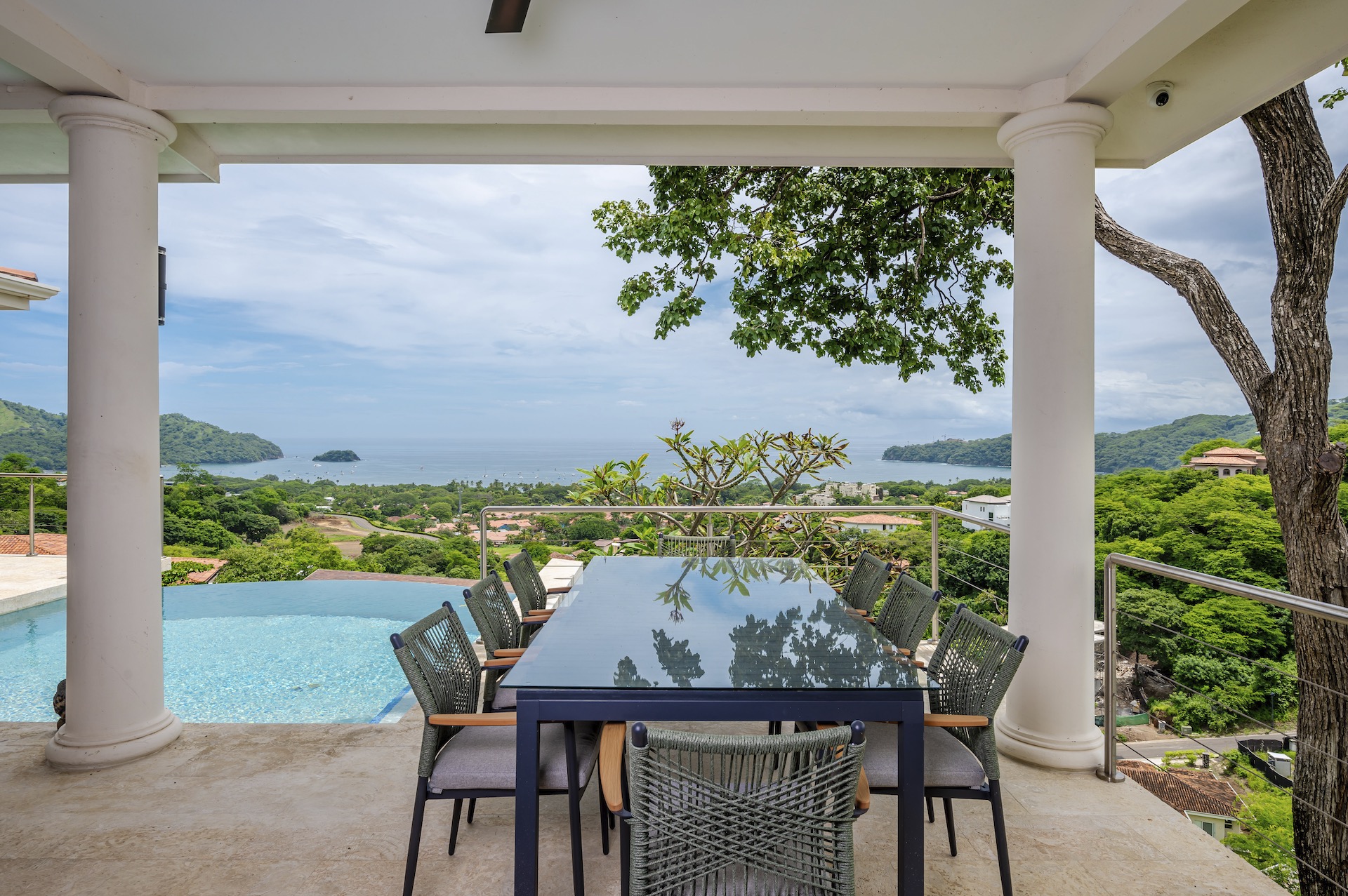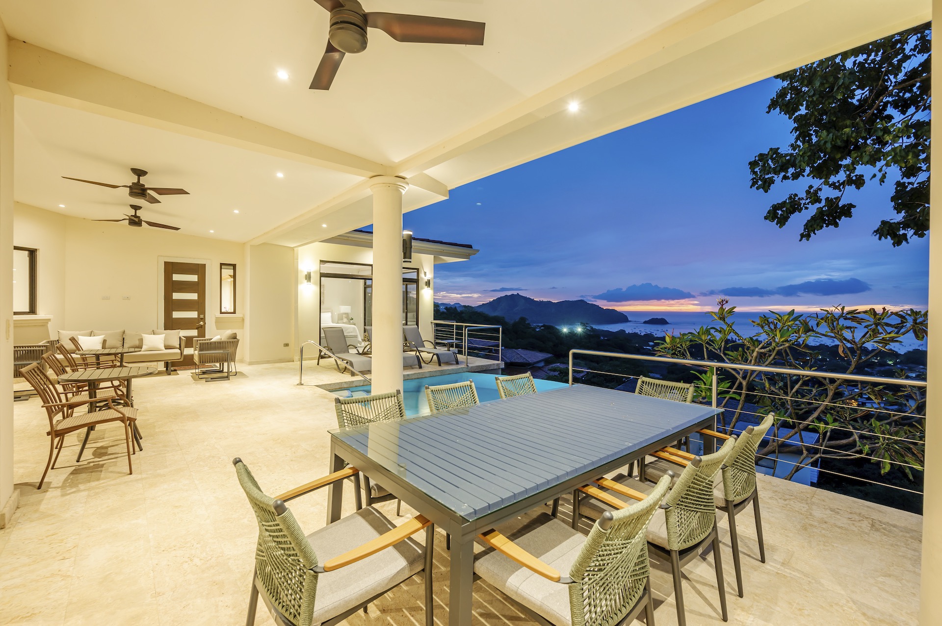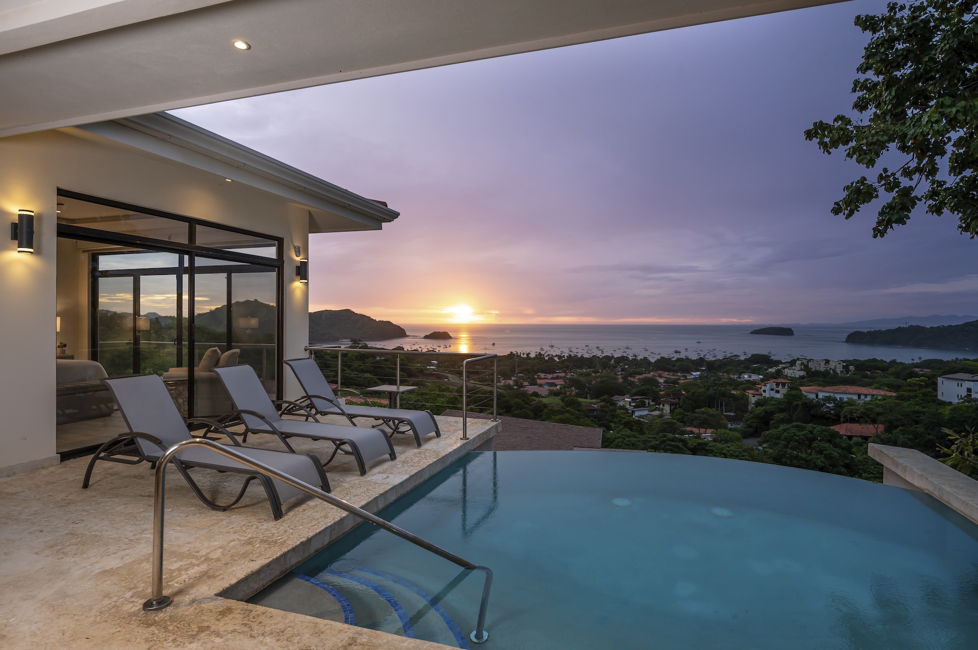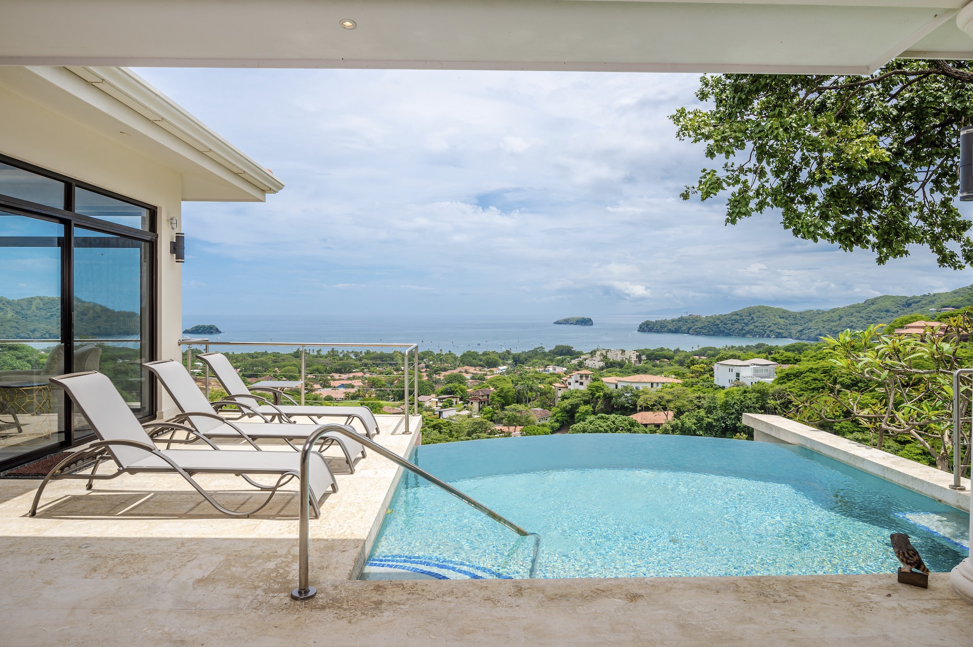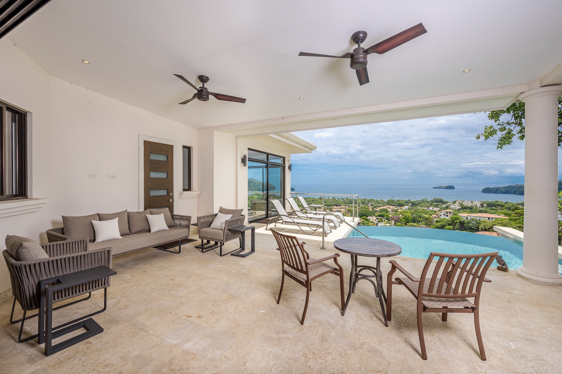 This beautifully designed luxury residence offers 3,109 air-conditioned square feet and 4,929 total square feet including expansive outdoor living areas and an attached two-car garage and bonus carport, perfectly blending comfort, elegance, and coastal sophistication. The home features four spacious bedrooms, each with its own ensuite bathroom, including two ocean-view bedrooms on the main level with direct access to the terrace, and two additional ocean-view bedrooms upstairs that share a generous panoramic terrace. The open-concept great room seamlessly connects the living and dining areas to the stunning ocean-view pool terrace, where an infinity-edge pool, outdoor dining space, and dedicated BBQ zone create an ideal setting for entertaining or relaxing against a breathtaking backdrop; thoughtfully designed, the terrace provides welcome afternoon shade, allowing for comfortable enjoyment of the ample outdoor living spaces throughout the day while still capturing the stunning ocean views and awe inspiring sunsets. The well-appointed kitchen centers around a large island and is complemented by an oversized laundry and pantry combination, offering both functionality and style. Ideally located just minutes from the vibrant beach communities of Playas del Coco and nearby coastal towns, this home provides convenient access to a full range of services including shopping, dining, nightlife, watersports, and medical and dental care, and is only 25 minutes from Guanacaste International Airport (LIR). Owners also enjoy access to Pacifico’s exceptional amenities, including the exclusive Pacifico Beach Club, offering direct access to the sandy shores, oceanfront dining, and resort-style pools and lounge areas—completing a truly elevated coastal lifestyle.