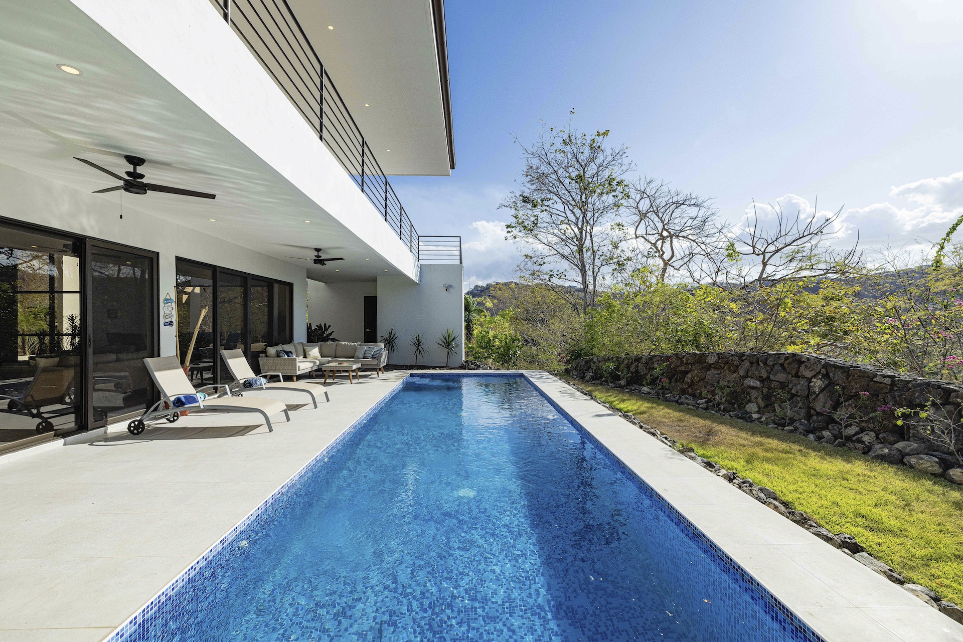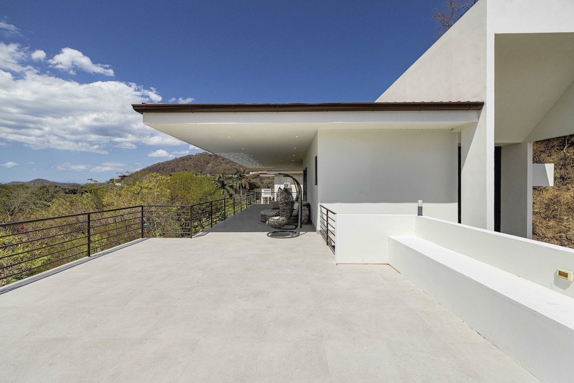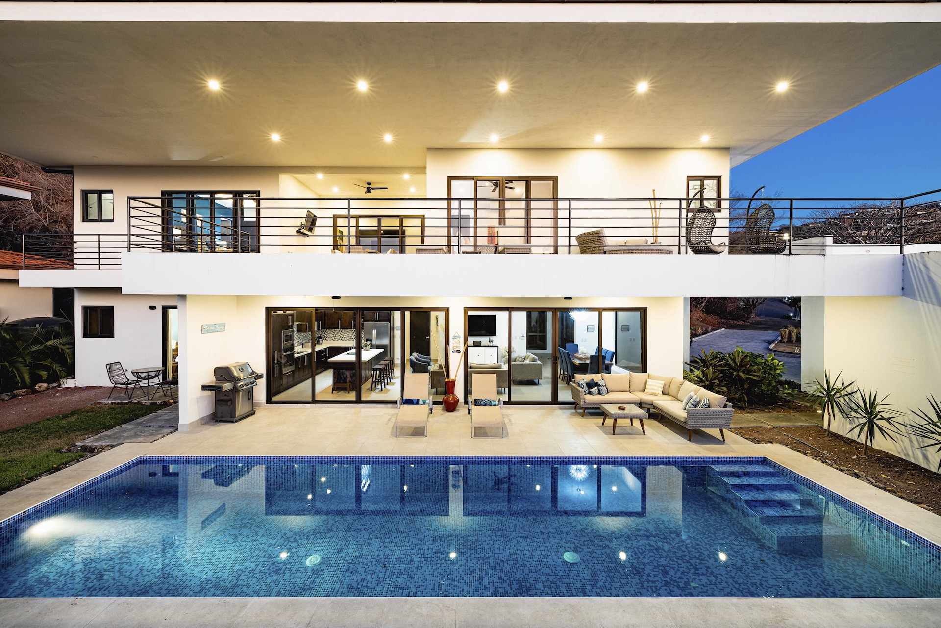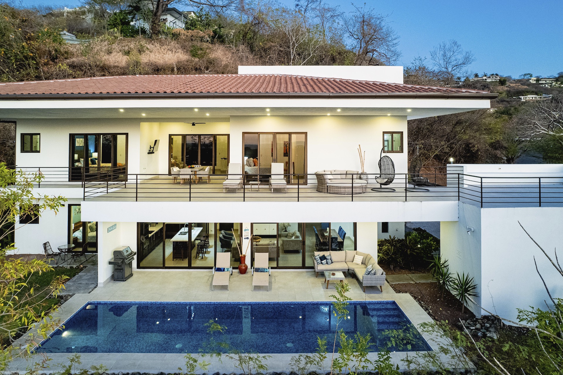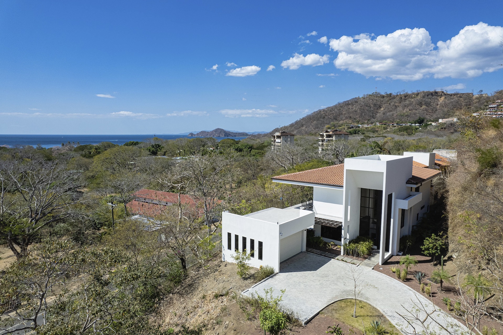 Experience refined coastal living in this brand-new ocean view estate inside the coveted Monte Bello in Playa Hermosa, offering 3 bedrooms, 3.5 baths, a huge private pool, attached 2-car garage, and an impressive 3,628 total square feet of thoughtfully designed space. Privately positioned on an estate-sized lot of nearly half an acre (1,612 square meters), the home is accessed by a winding driveway framed by mature tropical trees, setting a tone of tranquility from the moment you arrive. The main level unfolds into an immense great room where living, dining, and a beautifully appointed kitchen blend seamlessly, flowing onto expansive covered terraces that embrace the large rectangular pool, BBQ area, and private yard—perfect for effortless indoor-outdoor entertaining. A spacious guest suite with ensuite bath, private terrace, and direct pool access anchors the first floor, complemented by a half bath and laundry room. Upstairs, every room enjoys captivating ocean views, including two massive master suites that open onto a sweeping covered terrace, plus an additional bonus terrace above the garage ideal for sunset lounging. Built and furnished with exceptional attention to detail, the residence showcases porcelain tile flooring throughout, quartz countertops, custom hardwood doors and cabinetry, and a classic ceramic tile roof. With 2,302 square feet of air-conditioned interior living space, owners enjoy rock-solid infrastructure, low density surroundings, and close proximity to the sands of Playa Hermosa Beach, the conveniences of Liberia and its international airport, as well as dining, nightlife, and watersports—while still savoring the serenity of a private hideaway. Whether envisioned as a luxurious vacation retreat, full-time residence, or income-producing investment, this is the dream home you have been planning—make your move to paradise today.