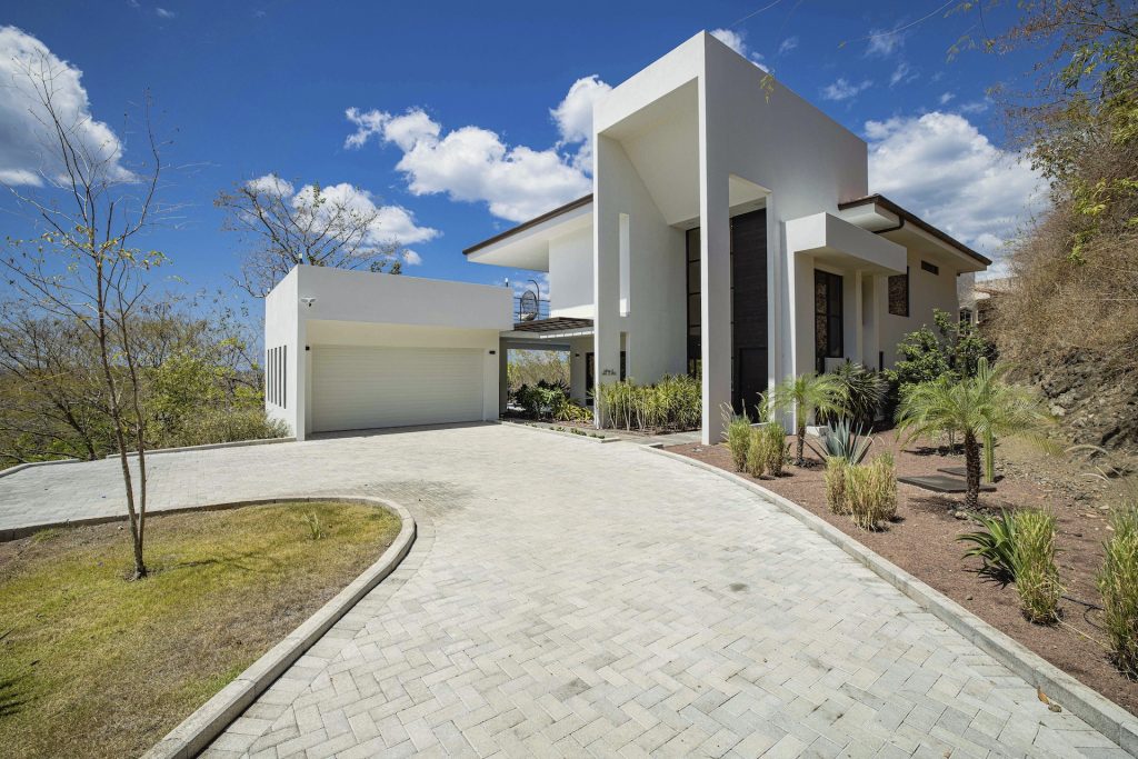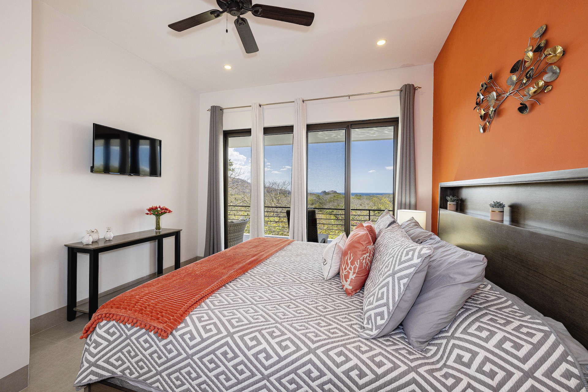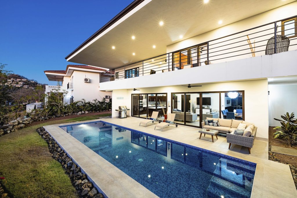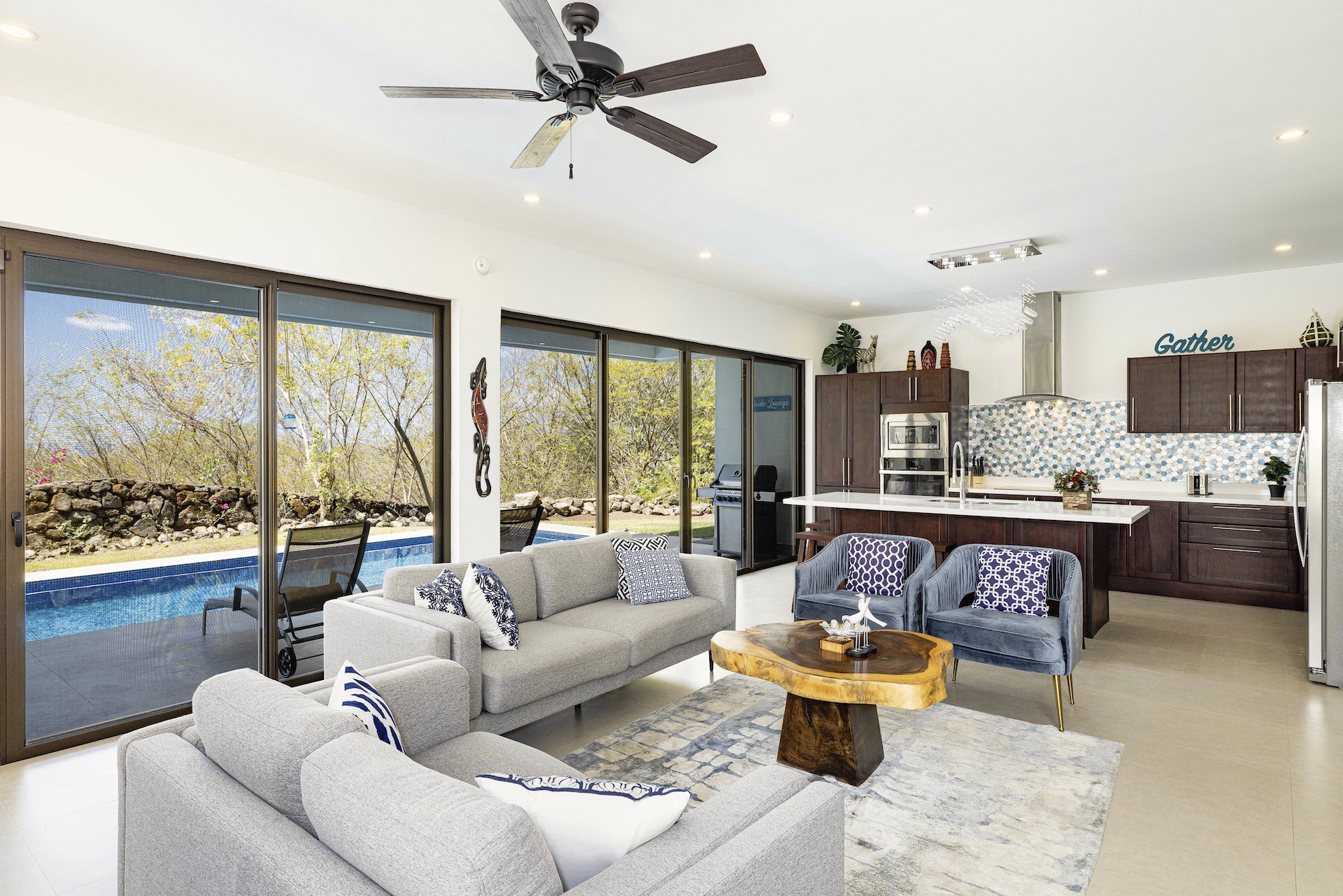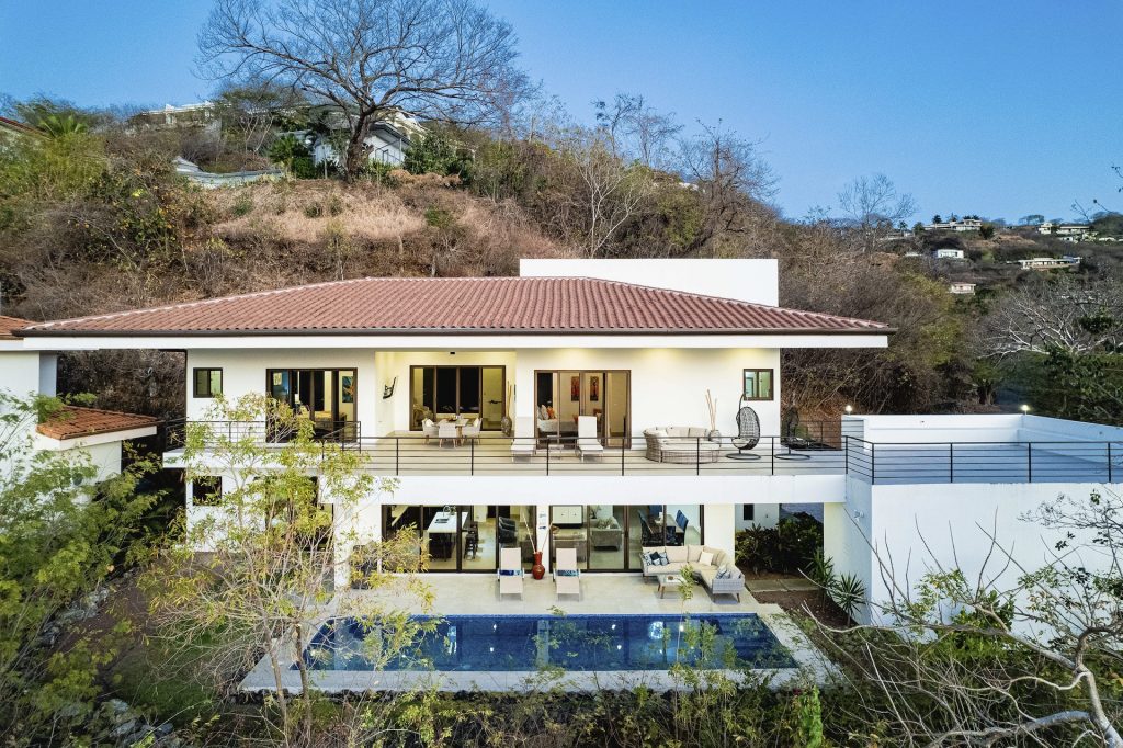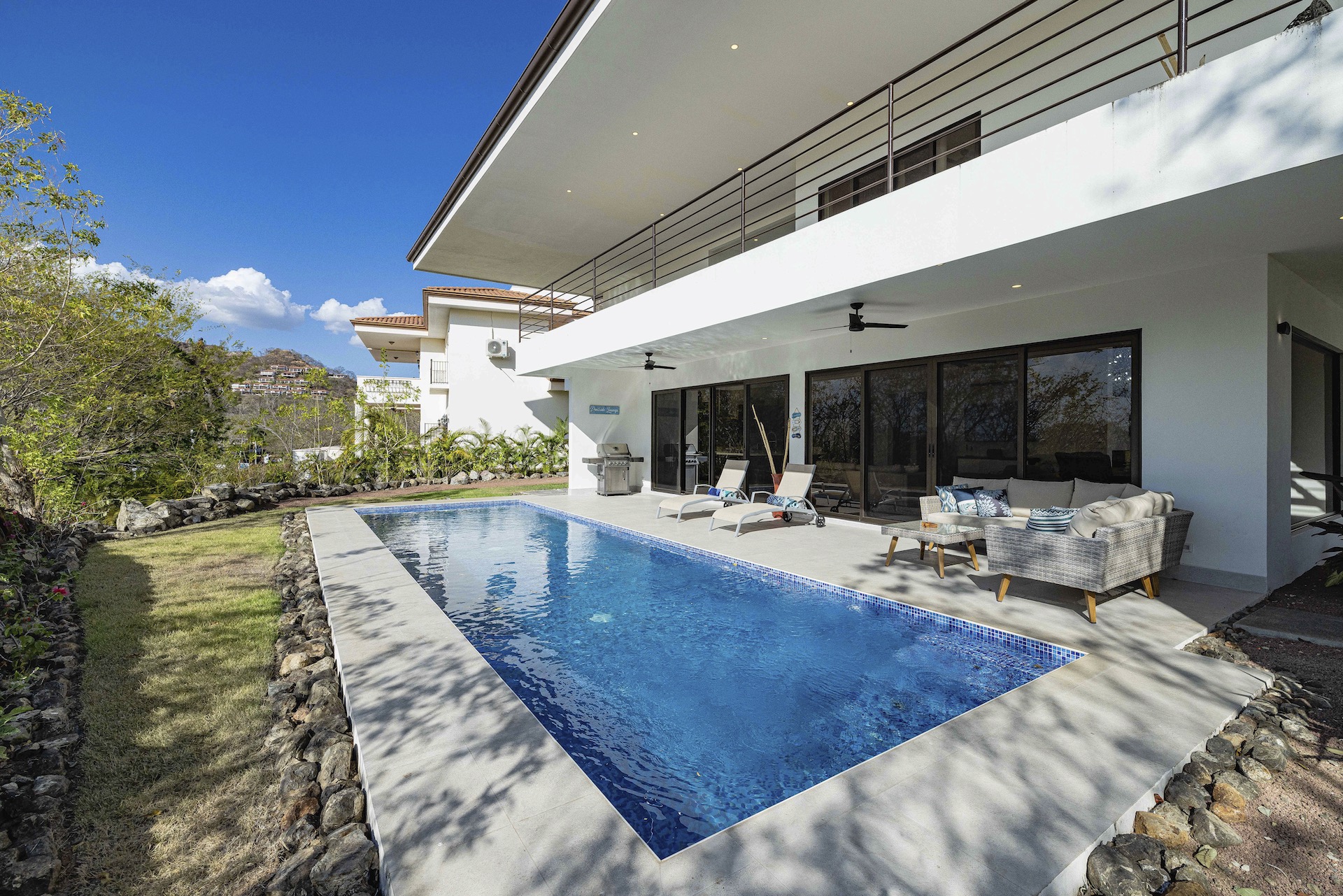Experience refined coastal living in this brand-new ocean view estate inside the coveted Monte Bello in Playa Hermosa, offering 3 bedrooms, 3.5 baths, a huge private pool, attached 2-car garage, and an impressive 3,628 total square feet of thoughtfully designed space. Privately positioned on an estate-sized lot of nearly half an acre (1,612 square meters), the home is accessed by a winding driveway framed by mature tropical trees, setting a tone of tranquility from the moment you arrive. The main level unfolds into an immense great room where living, dining, and a beautifully appointed kitchen blend seamlessly, flowing onto expansive covered terraces that embrace the large rectangular pool, BBQ area, and private yard—perfect for effortless indoor-outdoor entertaining. A spacious guest suite with ensuite bath, private terrace, and direct pool access anchors the first floor, complemented by a half bath and laundry room. Upstairs, every room enjoys captivating ocean views, including two massive master suites that open onto a sweeping covered terrace, plus an additional bonus terrace above the garage ideal for sunset lounging. Built and furnished with exceptional attention to detail, the residence showcases porcelain tile flooring throughout, quartz countertops, custom hardwood doors and cabinetry, and a classic ceramic tile roof. With 2,302 square feet of air-conditioned interior living space, owners enjoy rock-solid infrastructure, low density surroundings, and close proximity to the sands of Playa Hermosa Beach, the conveniences of Liberia and its international airport, as well as dining, nightlife, and watersports—while still savoring the serenity of a private hideaway. Whether envisioned as a luxurious vacation retreat, full-time residence, or income-producing investment, this is the dream home you have been planning—make your move to paradise today.