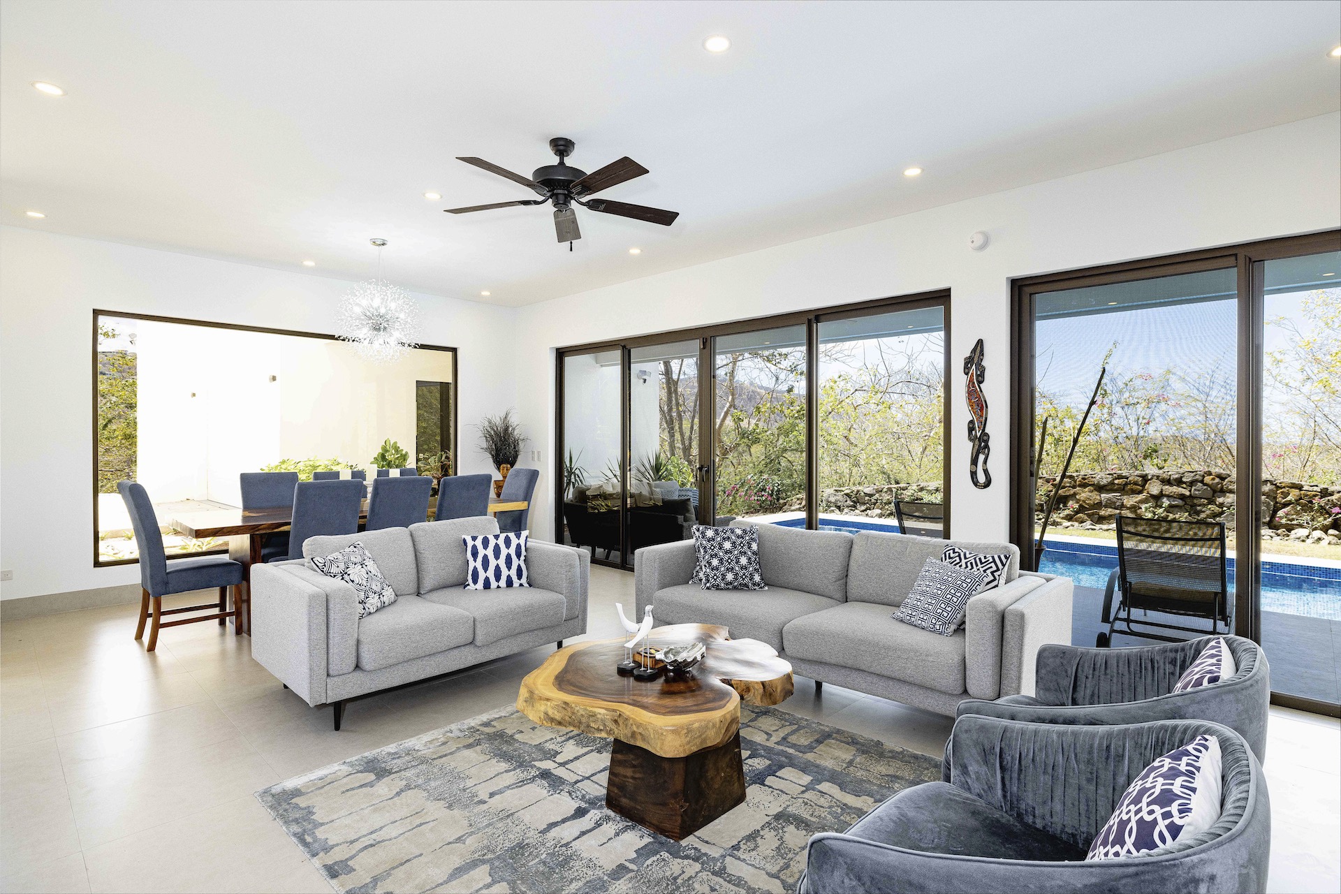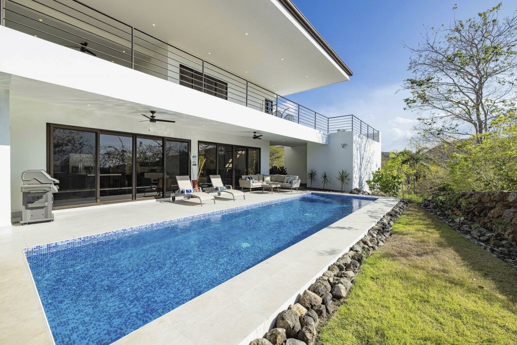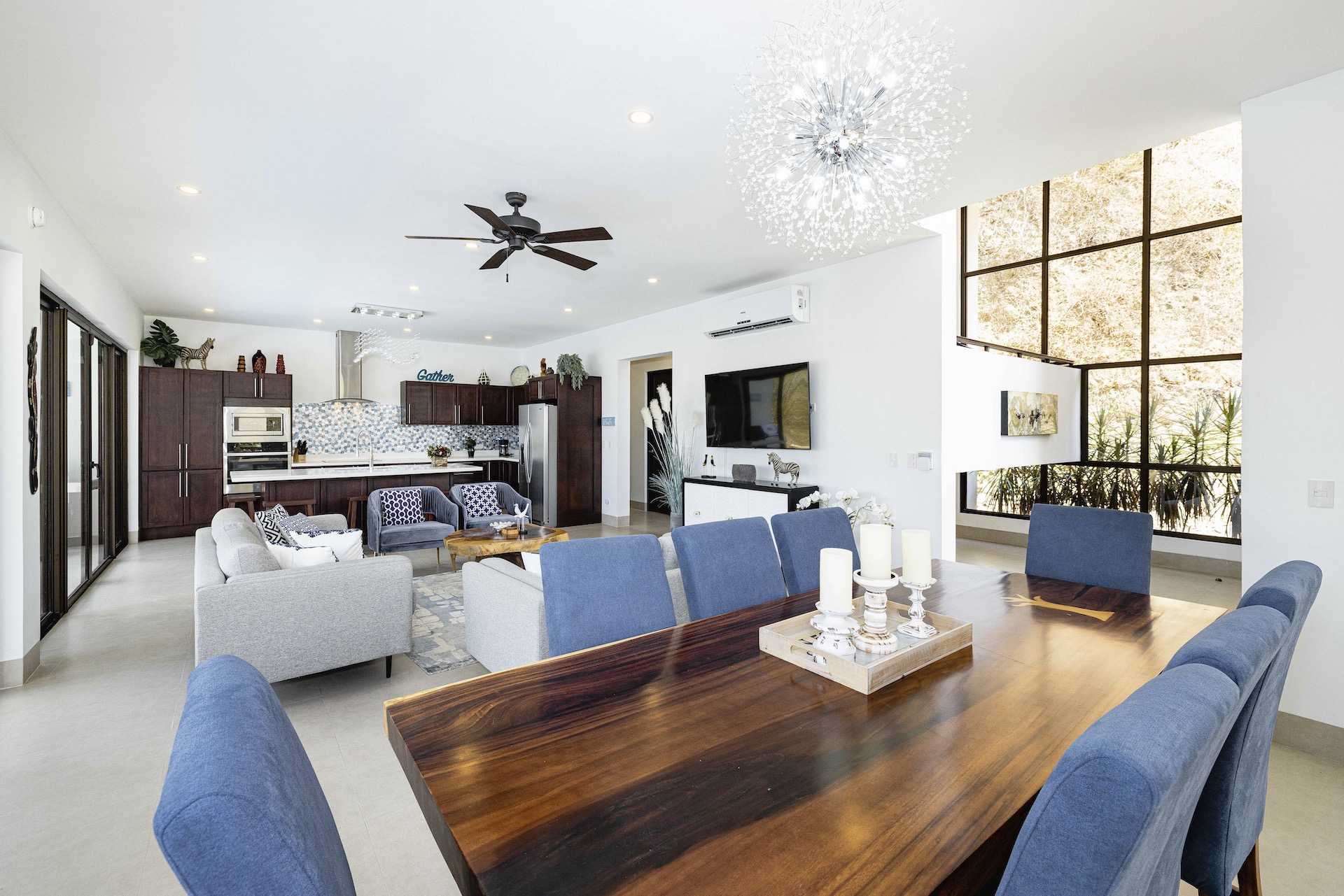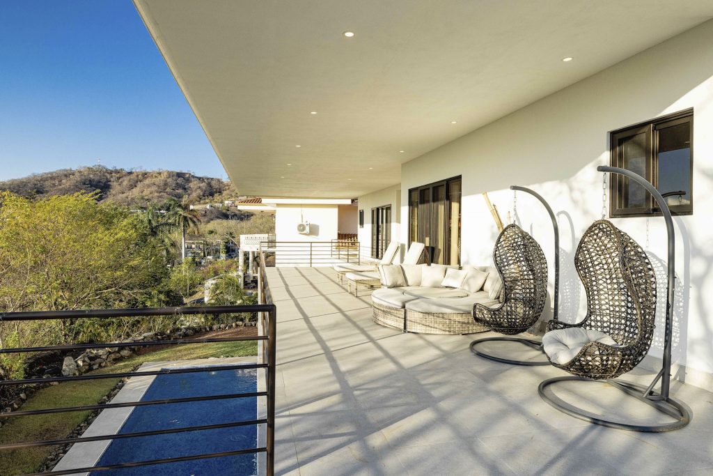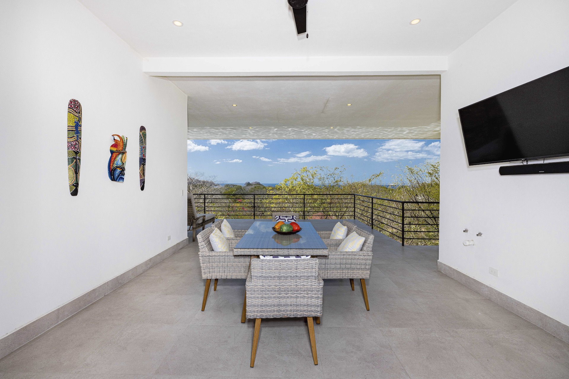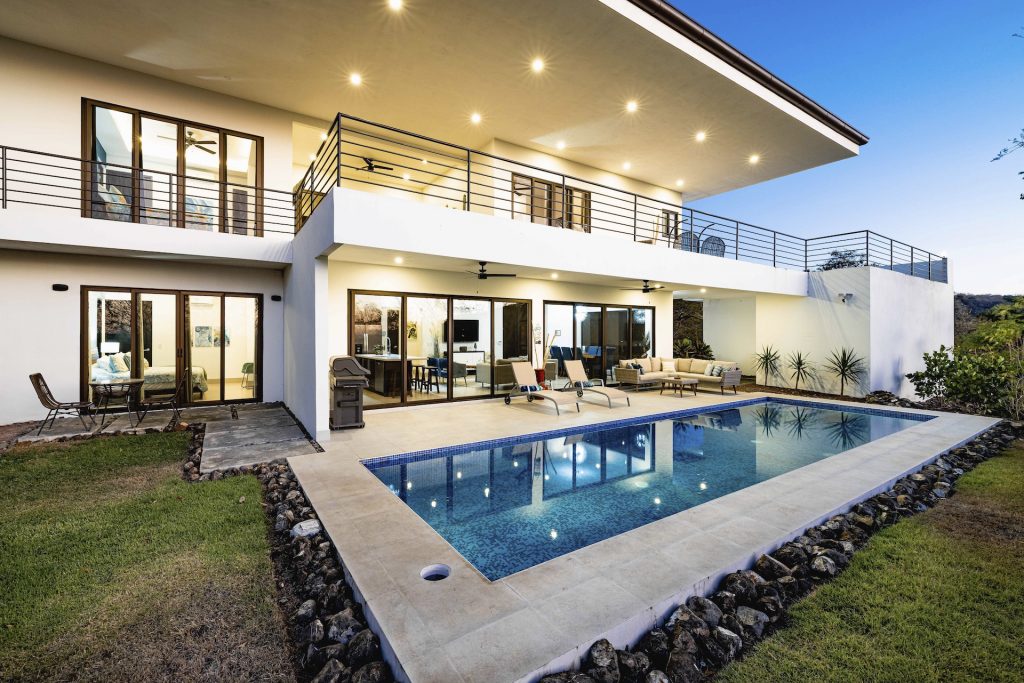 Experience refined coastal living in this brand-new ocean view estate inside the coveted Monte Bello in Playa Hermosa, offering 3 bedrooms, 3.5 baths, a huge private pool, attached 2-car garage, and an impressive 3,628 total square feet of thoughtfully designed space. Privately positioned on an estate-sized lot of nearly half an acre (1,612 square meters), the home is accessed by a winding driveway framed by mature tropical trees, setting a tone of tranquility from the moment you arrive. The main level unfolds into an immense great room where living, dining, and a beautifully appointed kitchen blend seamlessly, flowing onto expansive covered terraces that embrace the large rectangular pool, BBQ area, and private yard—perfect for effortless indoor-outdoor entertaining. A spacious guest suite with ensuite bath, private terrace, and direct pool access anchors the first floor, complemented by a half bath and laundry room. Upstairs, every room enjoys captivating ocean views, including two massive master suites that open onto a sweeping covered terrace, plus an additional bonus terrace above the garage ideal for sunset lounging. Built and furnished with exceptional attention to detail, the residence showcases porcelain tile flooring throughout, quartz countertops, custom hardwood doors and cabinetry, and a classic ceramic tile roof. With 2,302 square feet of air-conditioned interior living space, owners enjoy rock-solid infrastructure, low density surroundings, and close proximity to the sands of Playa Hermosa Beach, the conveniences of Liberia and its international airport, as well as dining, nightlife, and watersports—while still savoring the serenity of a private hideaway. Whether envisioned as a luxurious vacation retreat, full-time residence, or income-producing investment, this is the dream home you have been planning—make your move to paradise today.