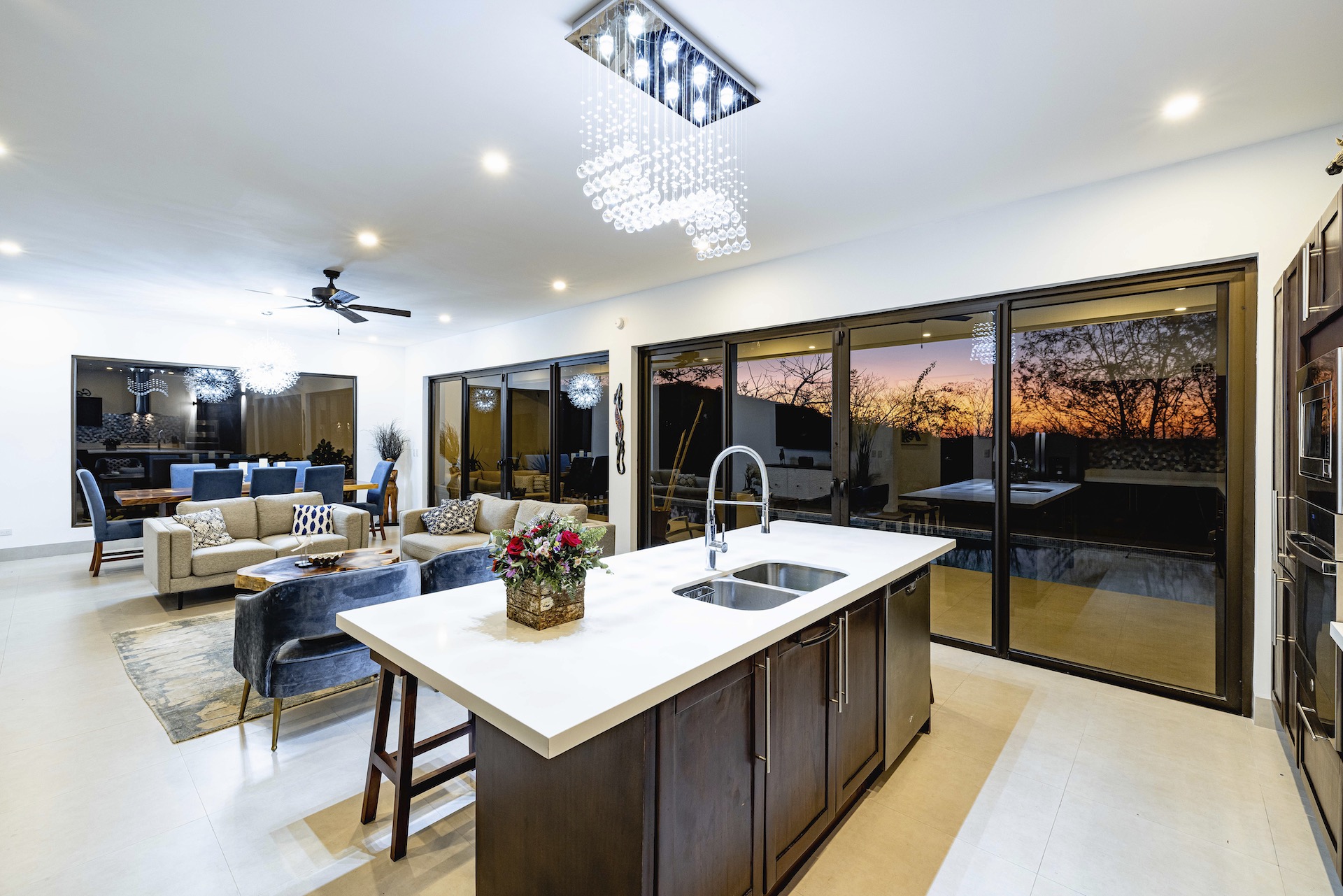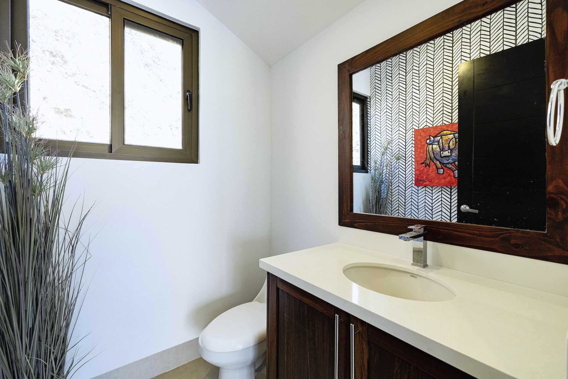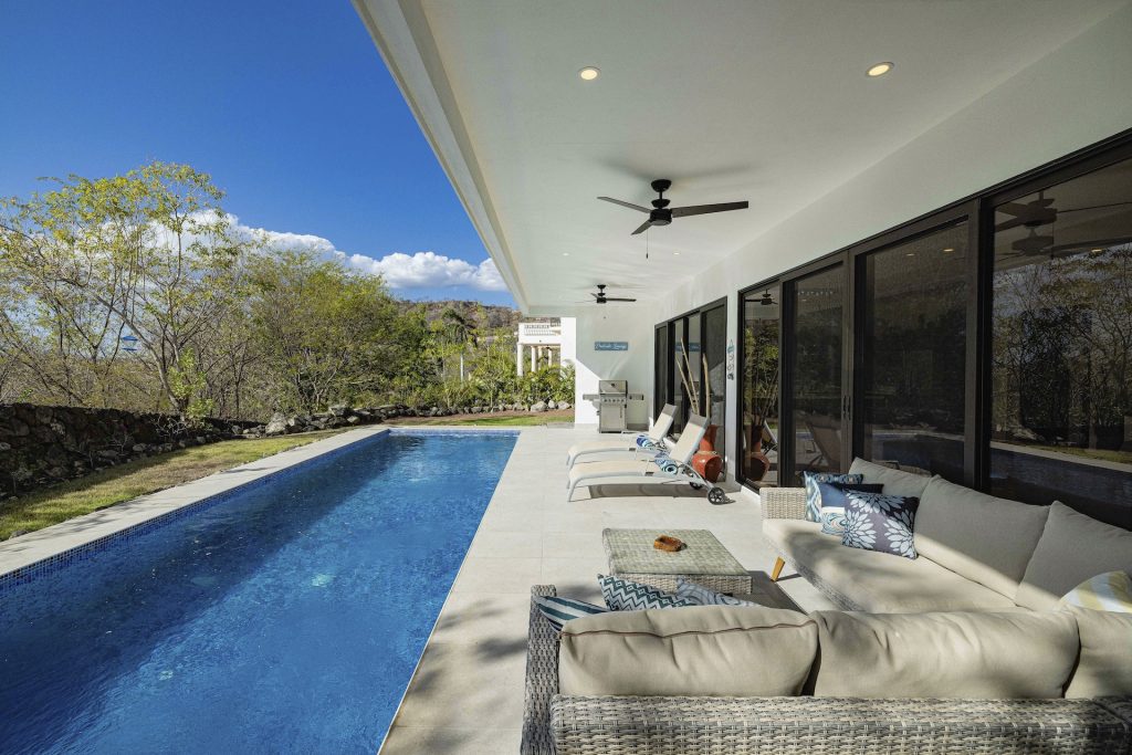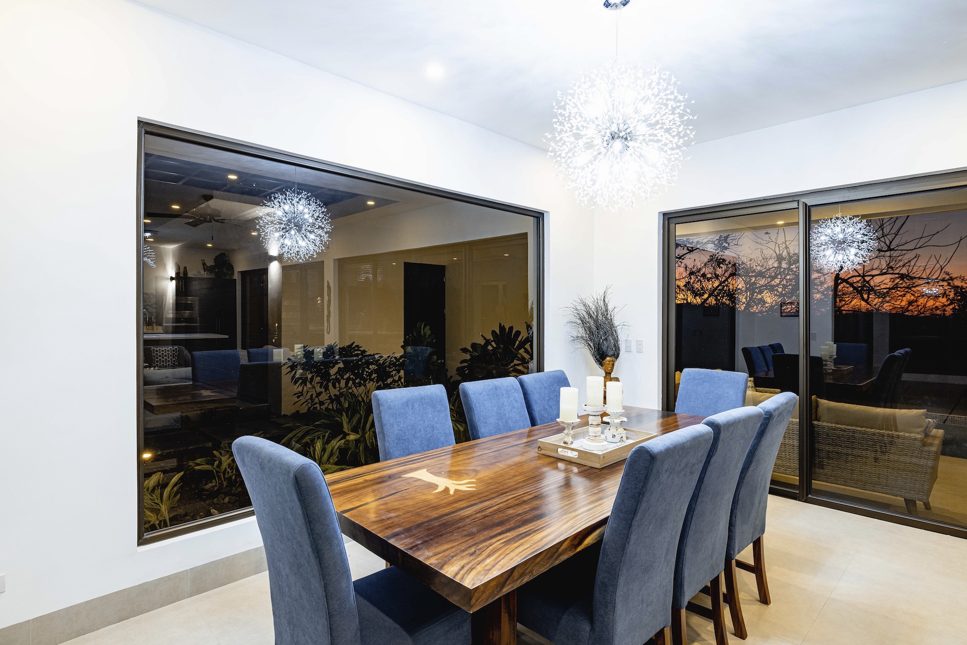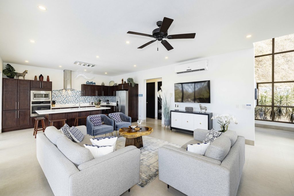 Experience refined coastal living in this brand-new ocean view estate inside the coveted Monte Bello in Playa Hermosa, offering 3 bedrooms, 3.5 baths, a huge private pool, attached 2-car garage, and an impressive 3,628 total square feet of thoughtfully designed space. Privately positioned on an estate-sized lot of nearly half an acre (1,612 square meters), the home is accessed by a winding driveway framed by mature tropical trees, setting a tone of tranquility from the moment you arrive. The main level unfolds into an immense great room where living, dining, and a beautifully appointed kitchen blend seamlessly, flowing onto expansive covered terraces that embrace the large rectangular pool, BBQ area, and private yard—perfect for effortless indoor-outdoor entertaining. A spacious guest suite with ensuite bath, private terrace, and direct pool access anchors the first floor, complemented by a half bath and laundry room. Upstairs, every room enjoys captivating ocean views, including two massive master suites that open onto a sweeping covered terrace, plus an additional bonus terrace above the garage ideal for sunset lounging. Built and furnished with exceptional attention to detail, the residence showcases porcelain tile flooring throughout, quartz countertops, custom hardwood doors and cabinetry, and a classic ceramic tile roof. With 2,302 square feet of air-conditioned interior living space, owners enjoy rock-solid infrastructure, low density surroundings, and close proximity to the sands of Playa Hermosa Beach, the conveniences of Liberia and its international airport, as well as dining, nightlife, and watersports—while still savoring the serenity of a private hideaway. Whether envisioned as a luxurious vacation retreat, full-time residence, or income-producing investment, this is the dream home you have been planning—make your move to paradise today.