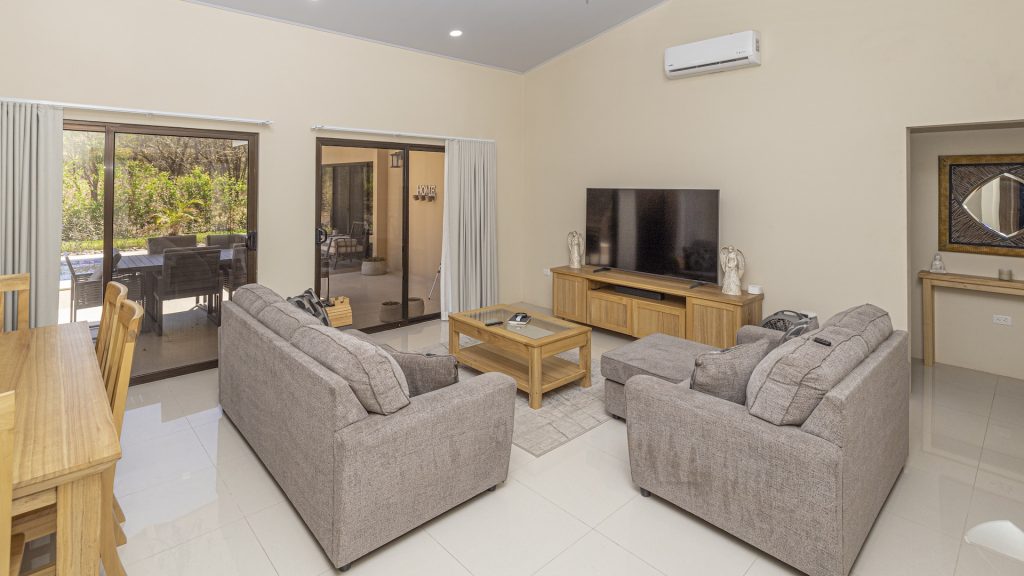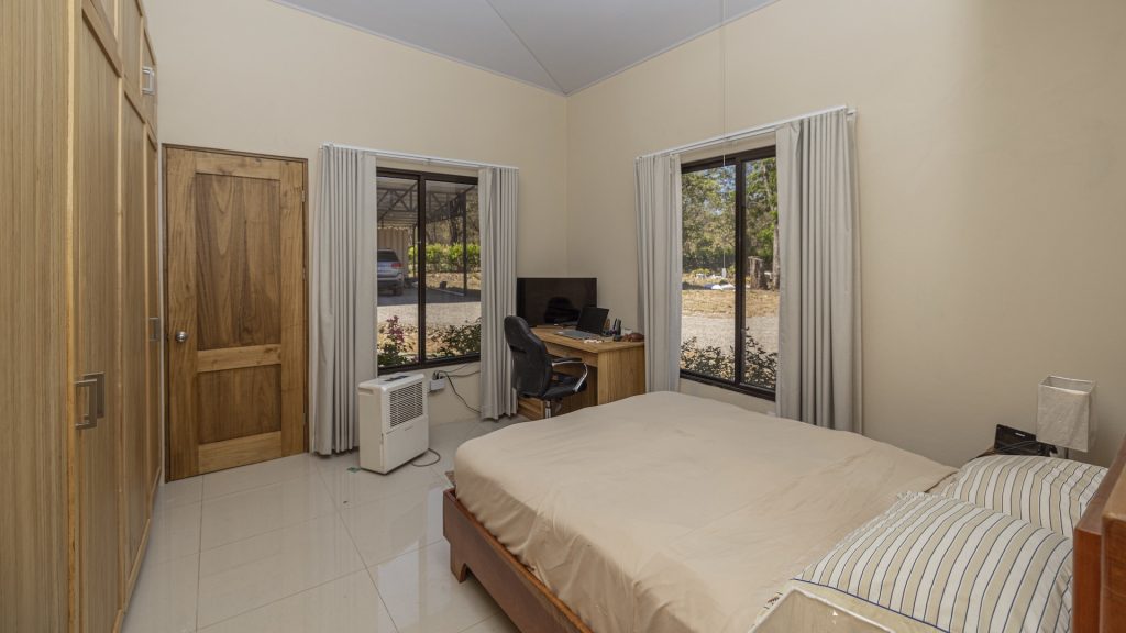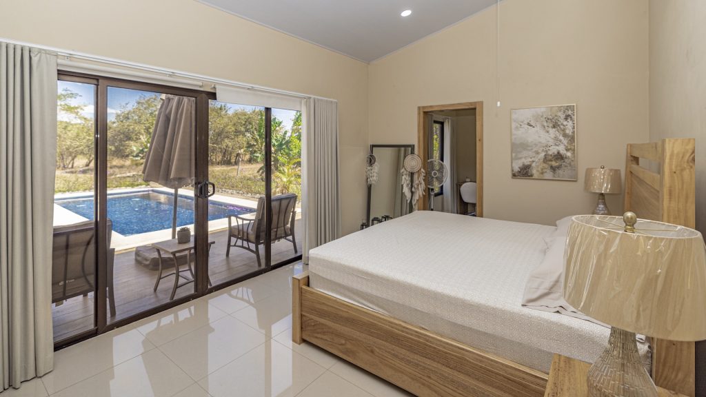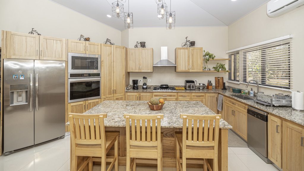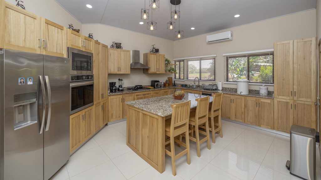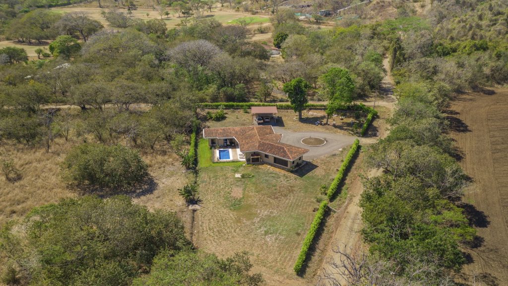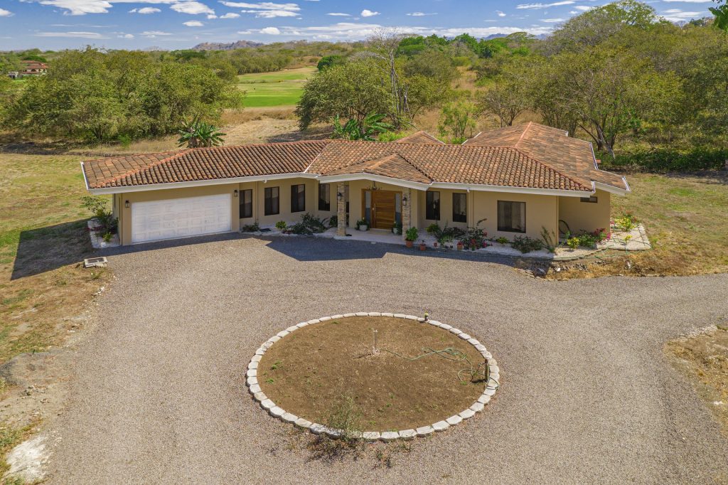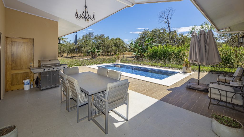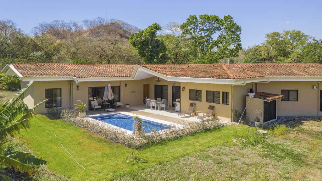 Set within the tranquil and private Vista Ridge community near Playas del Coco, this beautifully designed one-level estate home offers 3 bedrooms and 3.5 baths across 2,900 square feet including the attached garage and expansive covered terraces, all positioned on an estate-sized 6,309 square meter (1.5 acre) mostly flat lot with nature and mountain views and abundant irrigation from a private artesian well. The light and airy interior showcases light-colored custom wood cabinetry, a large chef’s kitchen with a huge center island and oversized pantry, and defined yet seamlessly connected dining and living spaces that flow effortlessly to the spacious covered terrace, oversized pool, and generous yard—perfect for indoor-outdoor living. The main suite enjoys direct access to the pool terrace, a private office, and a spa-inspired bath with separate shower and freestanding soaking tub, while the two additional bedrooms each feature their own ensuite bathrooms, offering privacy and comfort for family or guests. A convenient powder room sits just off the garage entry and living area. An attached garage with large laundry room, plus an additional carport with secure storage, provide ample functionality. Located within a low-density community featuring a golf course and minimum lot sizes of 5,000 square meters, this property offers peaceful country living just minutes from the restaurants, shopping, and services of Playas del Coco, approximately 25 minutes to Daniel Oduber Quirós International Airport, and a short drive to the beaches, healthcare, and conveniences of the Papagayo region—an exceptional opportunity to create your own private paradise.