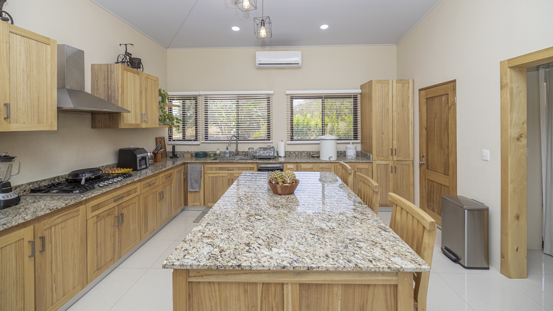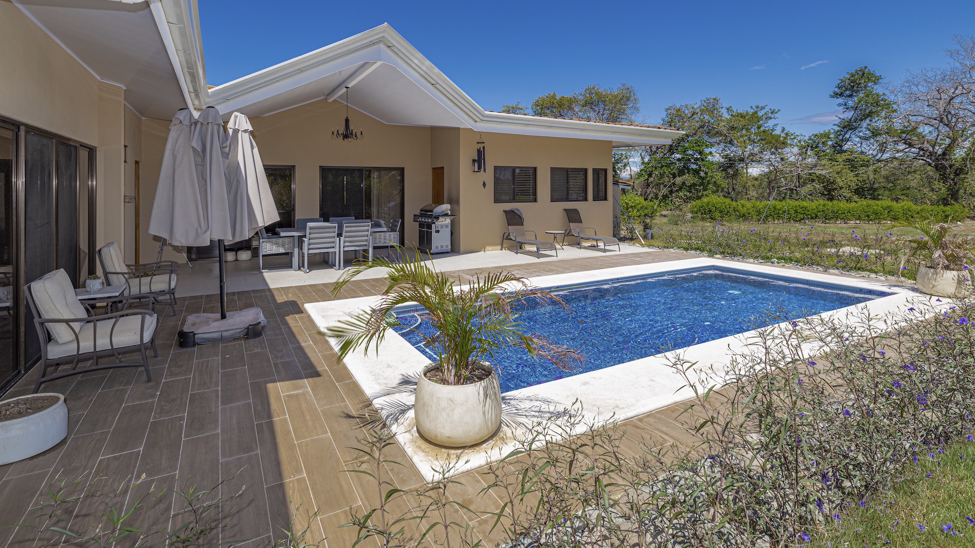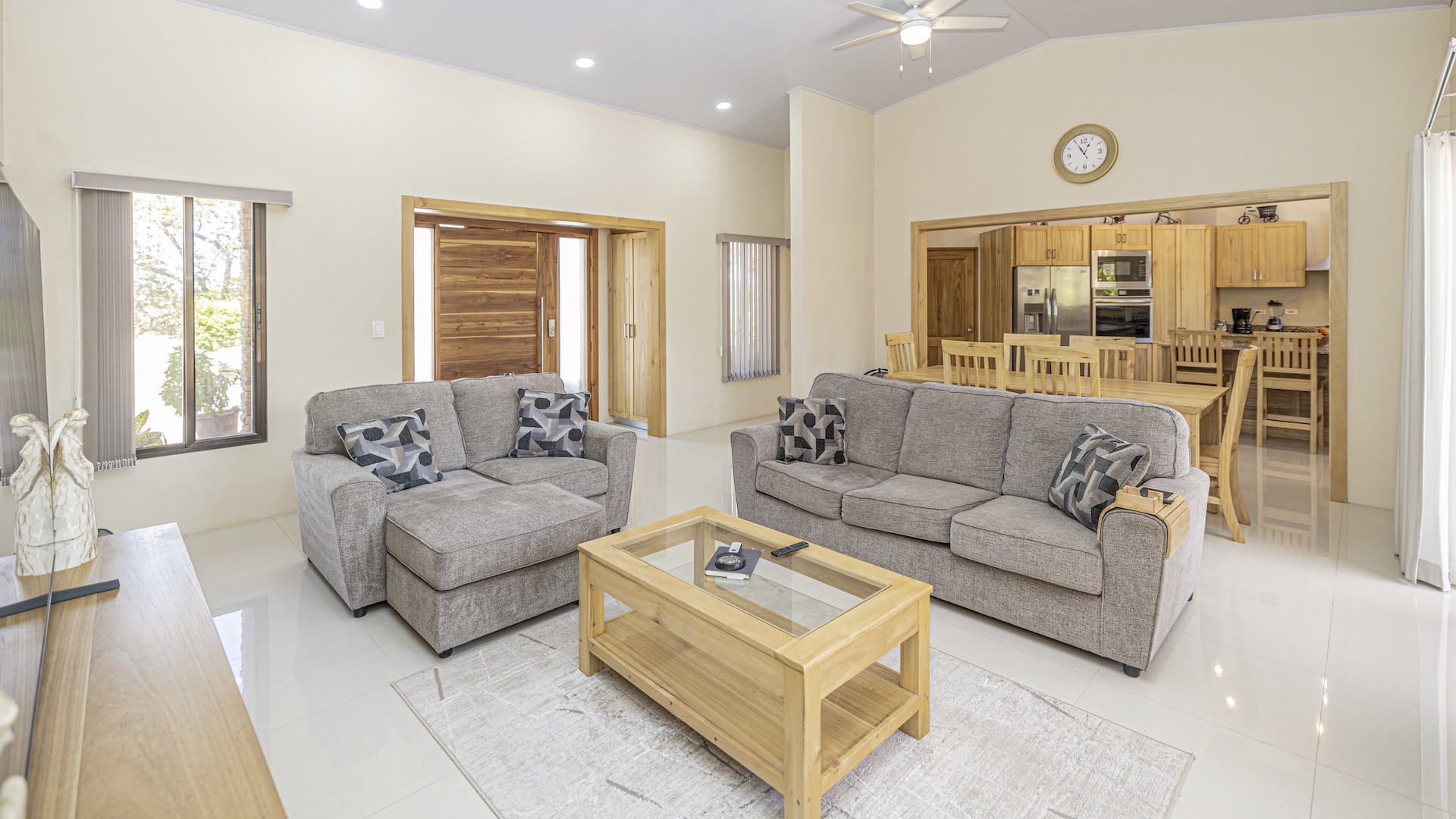Set within the tranquil and private Vista Ridge community near Playas del Coco, this beautifully designed one-level estate home offers 3 bedrooms and 3.5 baths across 2,900 square feet including the attached garage and expansive covered terraces, all positioned on an estate-sized 6,309 square meter (1.5 acre) mostly flat lot with nature and mountain views and abundant irrigation from a private artesian well. The light and airy interior showcases light-colored custom wood cabinetry, a large chef’s kitchen with a huge center island and oversized pantry, and defined yet seamlessly connected dining and living spaces that flow effortlessly to the spacious covered terrace, oversized pool, and generous yard—perfect for indoor-outdoor living. The main suite enjoys direct access to the pool terrace, a private office, and a spa-inspired bath with separate shower and freestanding soaking tub, while the two additional bedrooms each feature their own ensuite bathrooms, offering privacy and comfort for family or guests. A convenient powder room sits just off the garage entry and living area. An attached garage with large laundry room, plus an additional carport with secure storage, provide ample functionality. Located within a low-density community featuring a golf course and minimum lot sizes of 5,000 square meters, this property offers peaceful country living just minutes from the restaurants, shopping, and services of Playas del Coco, approximately 25 minutes to Daniel Oduber Quirós International Airport, and a short drive to the beaches, healthcare, and conveniences of the Papagayo region—an exceptional opportunity to create your own private paradise.