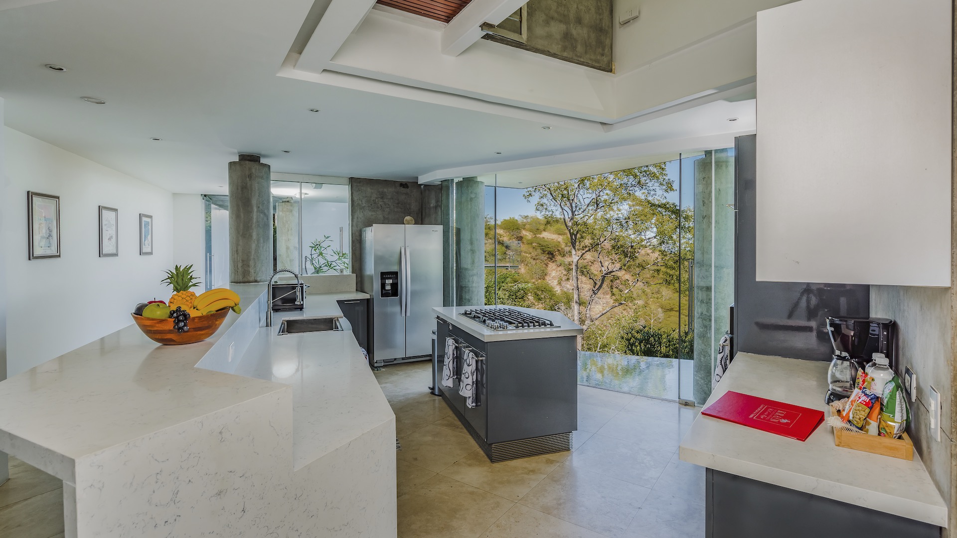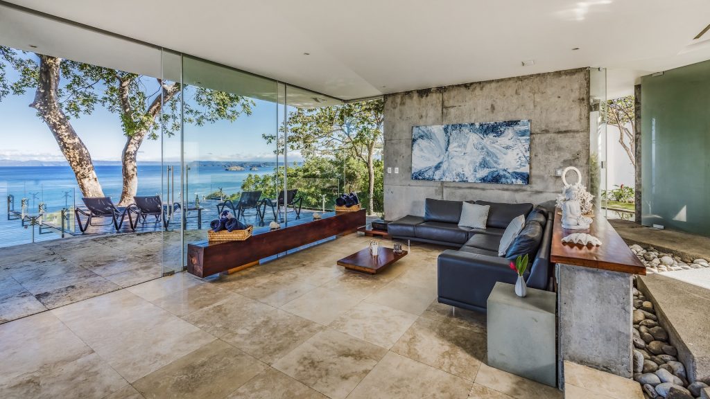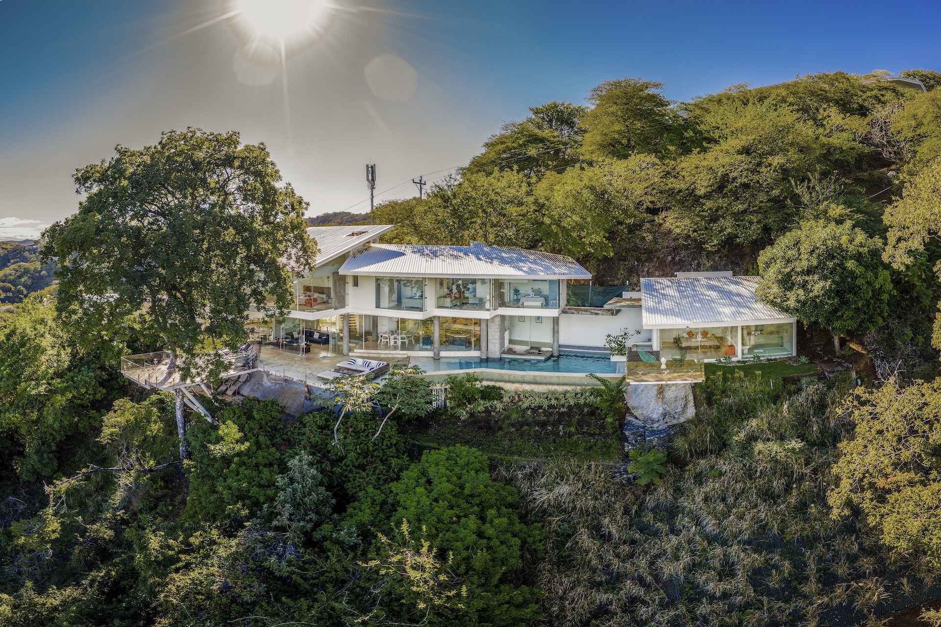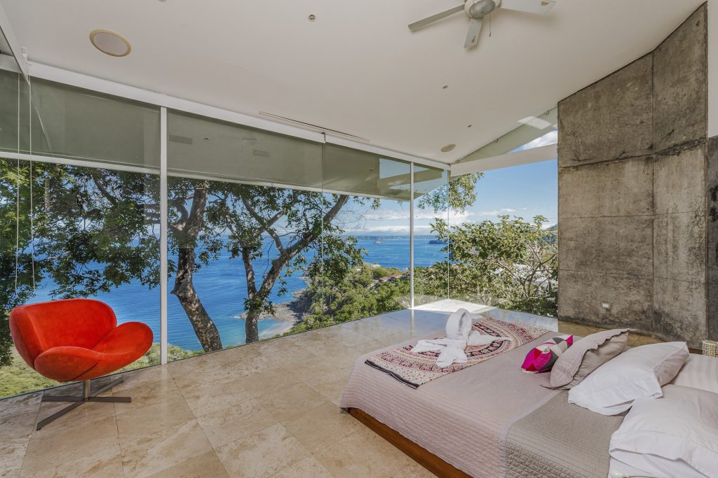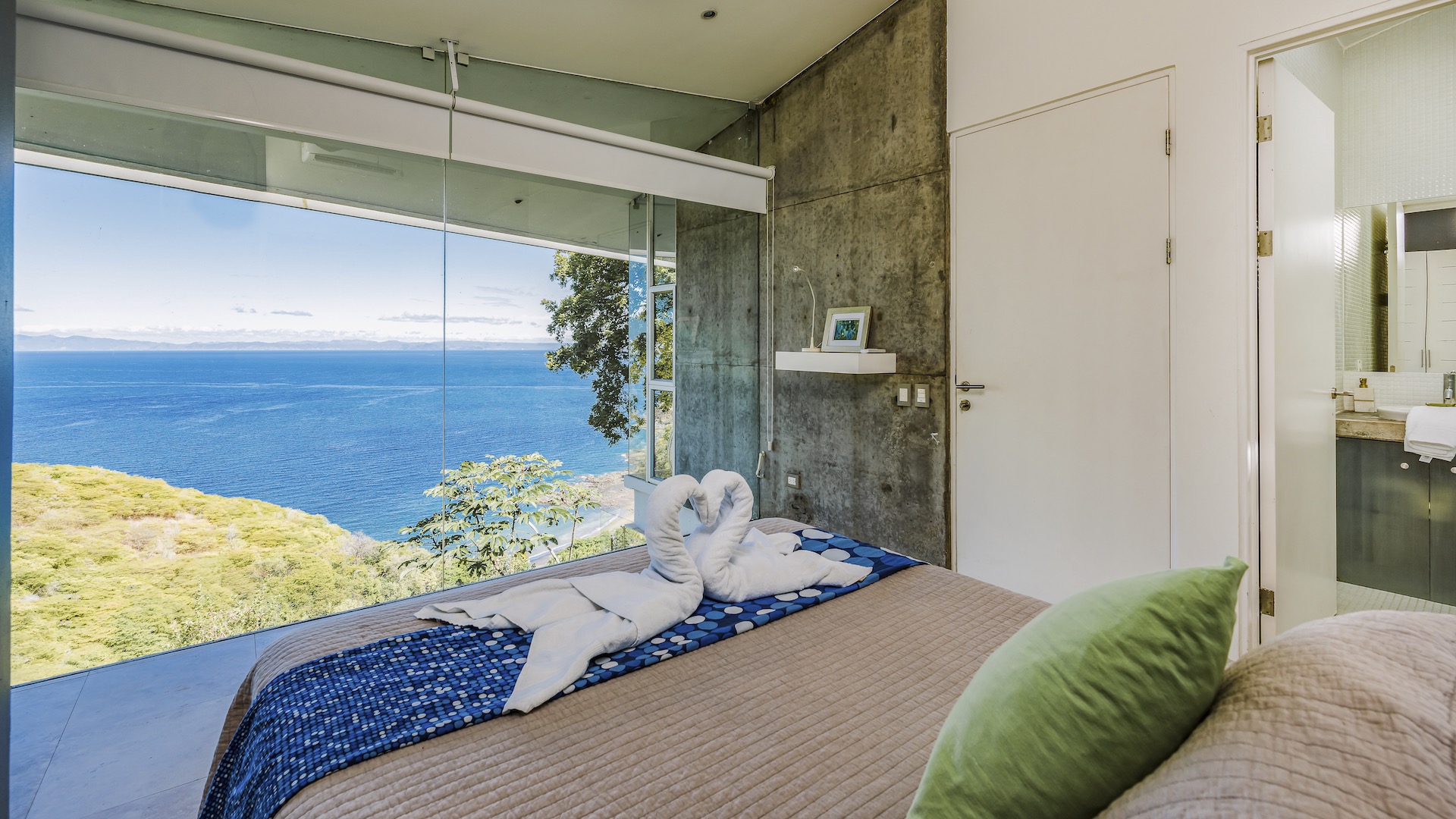 Great Ocean View 4 Bedroom, 4.5 Bathroom Home With Huge Terraces and Infinity Pool. Casa Ron Ron is a one-of-a-kind home perched on the hillside overlooking a secluded bay in Playa Ocotal. It is named after the Ron Ron tree that is integrated into the cantilevered deck providing a stunning ocean view overlooking the Pacific Ocean. This modern home is a 4,500+ square feet mix of glass and concrete designed by the famed Costa Rican architect Victor Cañas. The entire side of the home is a wall of windows, both on the lower and upper levels, giving you sweeping ocean and nature views. Enter into the open living/dining area with access to the grand deck from each space. The sunken living space has an L-shaped dining table that accommodates 8 people, or dine al fresco on the large patio. You will not mind cooking with the pool and ocean views offered in the large kitchen. The kitchen features a 6-burner gas stove, oven, microwave, dishwasher and has a large breakfast bar. There is also a gas BBQ in the pool bar area. The main floor has a large laundry room with 2 washers and 2 dryers, plus a 2-piece bathroom. Past the kitchen is a unique wooden bridge that crosses the pool and connects the main home to the one-bedroom casita. This casita has a King bed, large closet, and bathroom with an ocean view shower. The casita has a beautiful patio overlooking the pool and the ocean. Back inside, head upstairs to the principal bedroom for breathtaking ocean views from the massive glass walls. The spacious bedroom features an ensuite bathroom with a large shower, double sinks, a large closet, and a standalone soaker tub with sightlines to the ocean. Also on the second floor are the third and fourth bedrooms, each with ocean-facing glass walls and private ensuite bathrooms. There is also a sitting area with TV and beautiful ocean views. Outside there is a large deck with lounge chairs, an L-shaped sofa, and a large infinity-edge pool with swim-up bar seating and a waterfall feature. All of this with the stunning Pacific Ocean as the backdrop. There is also a carport with space for 2 vehicles and an on-site caretaker. Perfect as a luxury vacation rental villa and as a vacation oasis for you and your family. Located in Ocotal Beach, an exclusive enclave of upscale homes. A short drive to Playa Ocotal Beach and just 30 minutes to the Liberia International Airport and just minutes to various beaches, private hospitals, services, restaurants, nightlife and watersports of the area. Move in to this luxurious masterpiece today.