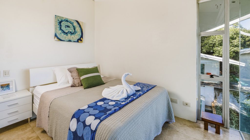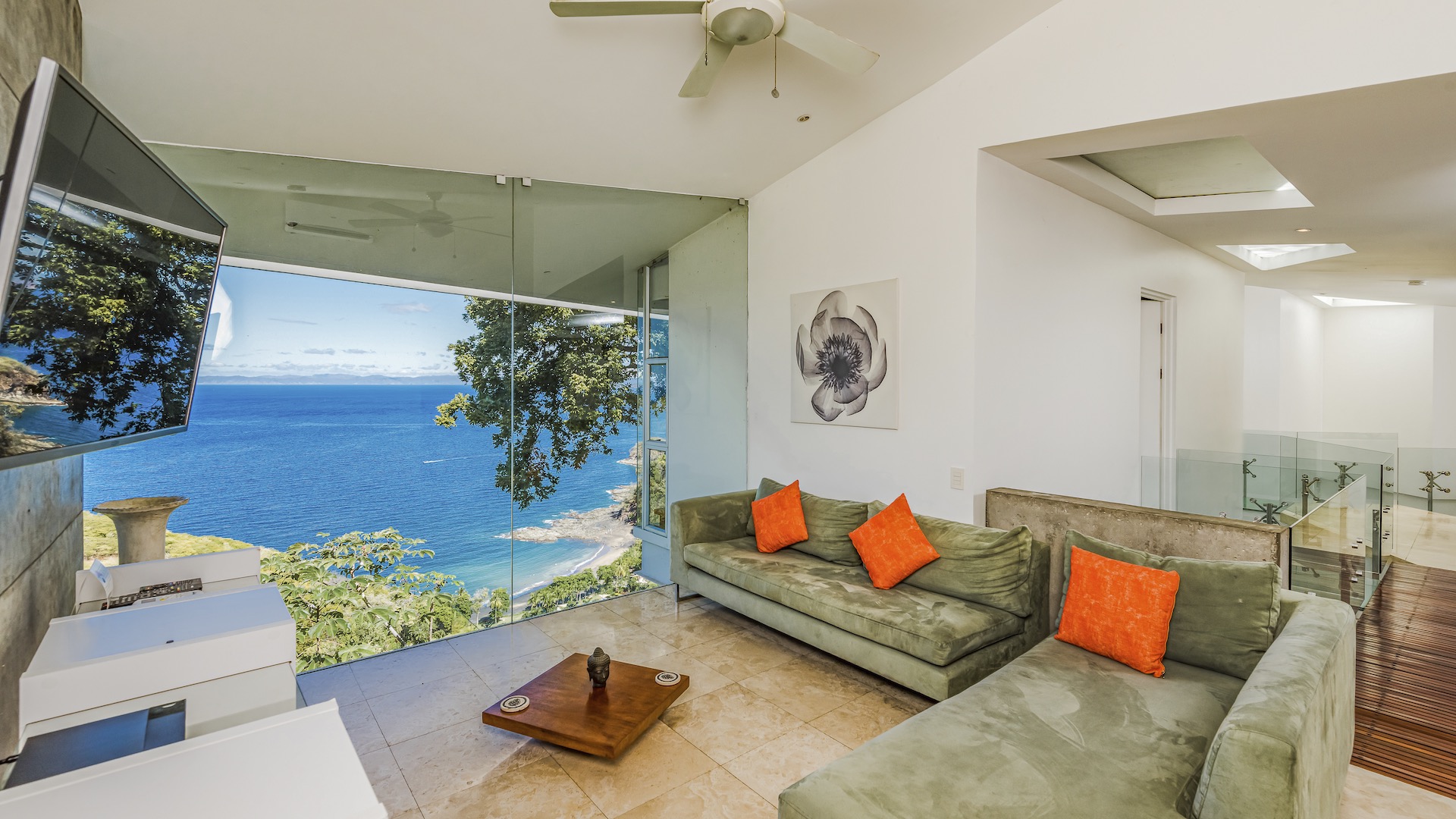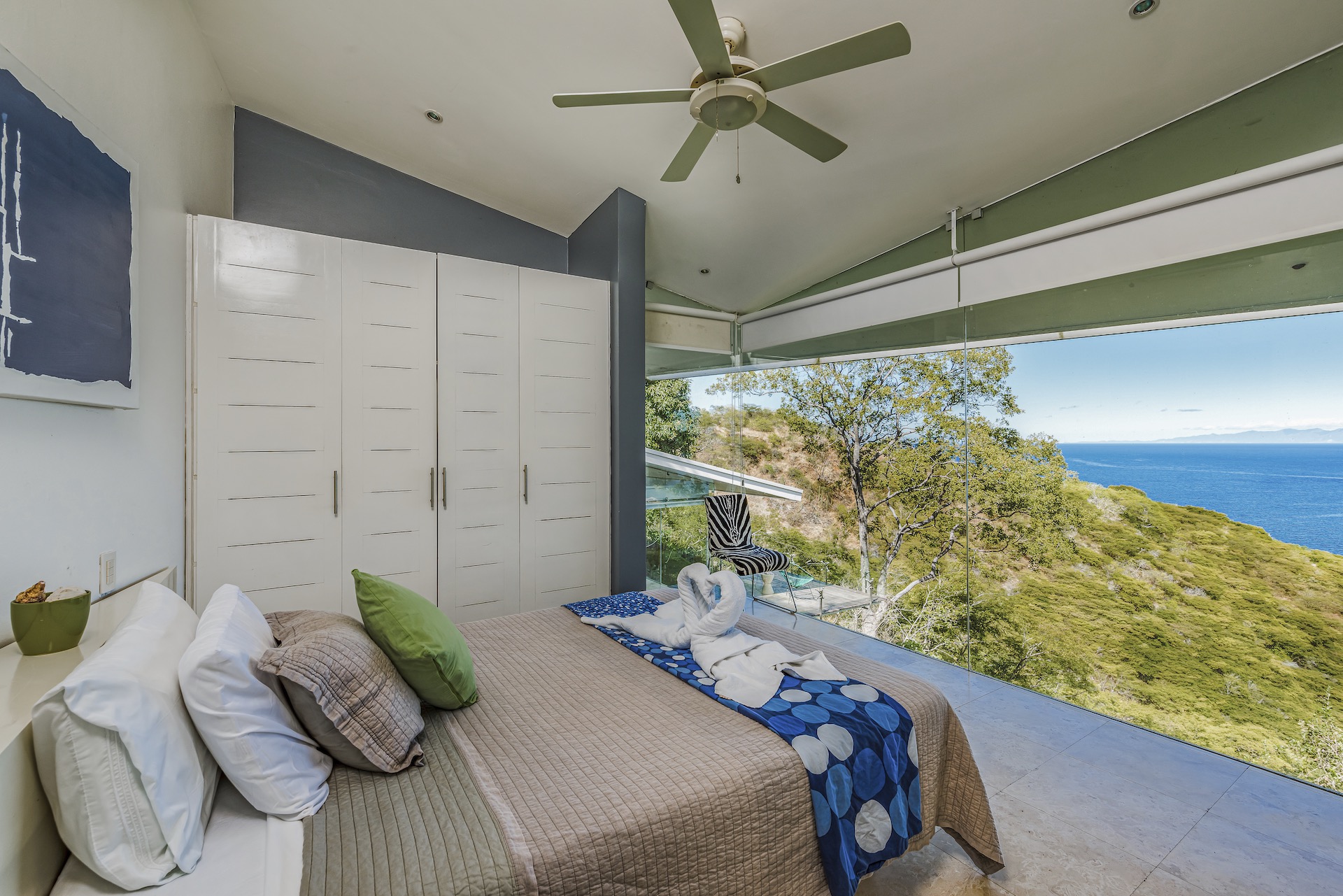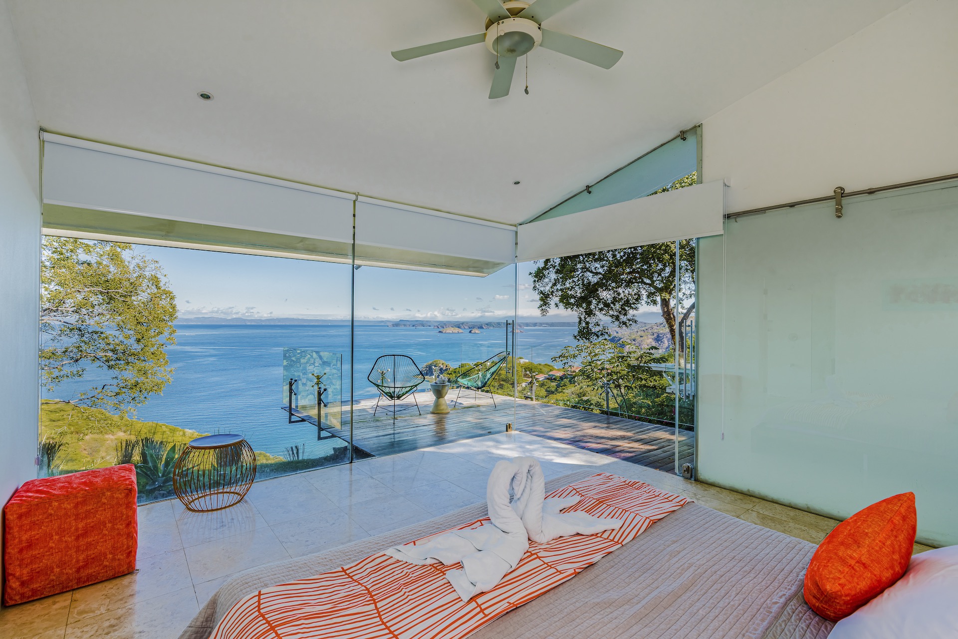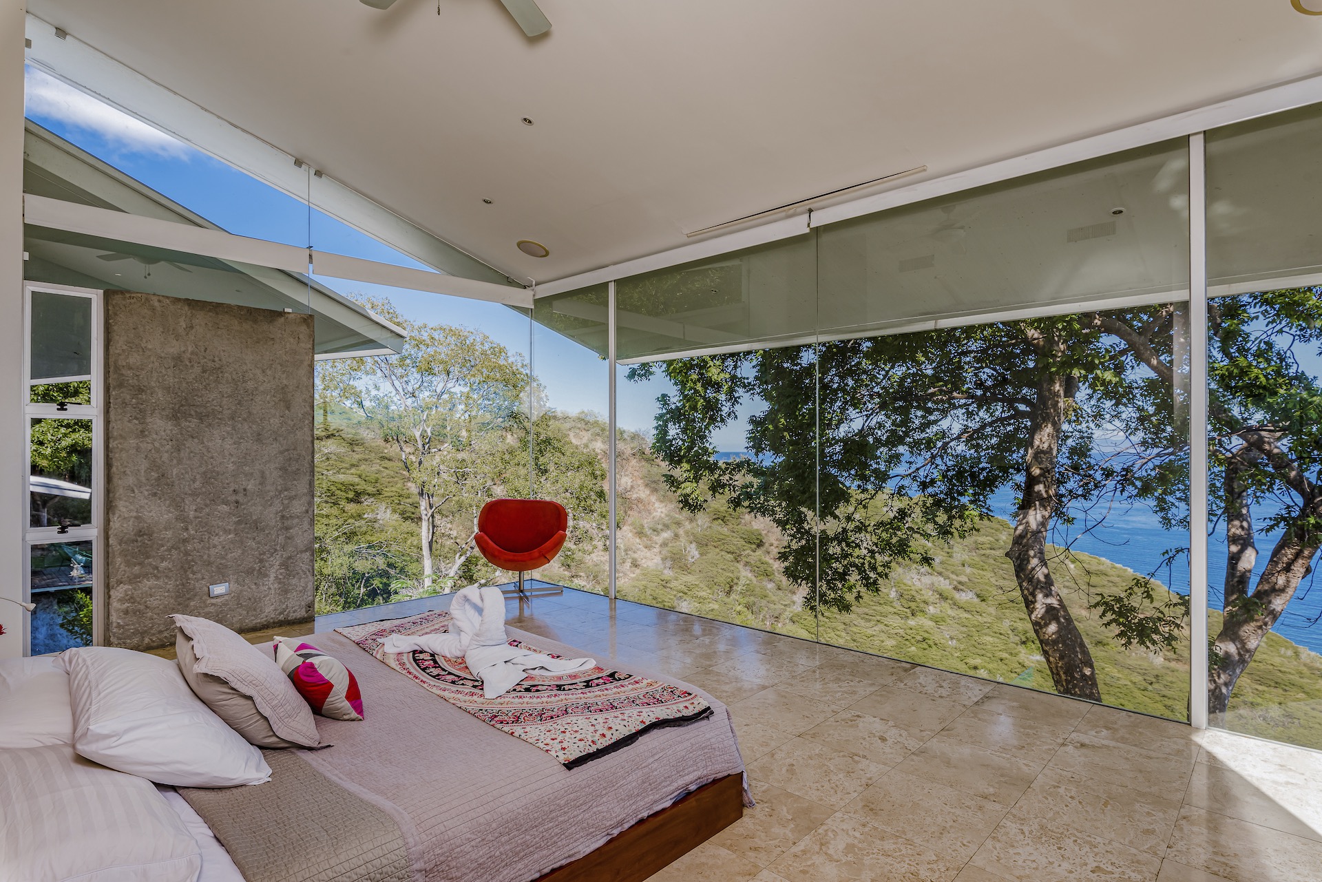 Great Ocean View 4 Bedroom, 4.5 Bathroom Home With Huge Terraces and Infinity Pool. Casa Ron Ron is a one-of-a-kind home perched on the hillside overlooking a secluded bay in Playa Ocotal. It is named after the Ron Ron tree that is integrated into the cantilevered deck providing a stunning ocean view overlooking the Pacific Ocean. This modern home is a 4,500+ square feet mix of glass and concrete designed by the famed Costa Rican architect Victor Cañas. The entire side of the home is a wall of windows, both on the lower and upper levels, giving you sweeping ocean and nature views. Enter into the open living/dining area with access to the grand deck from each space. The sunken living space has an L-shaped dining table that accommodates 8 people, or dine al fresco on the large patio. You will not mind cooking with the pool and ocean views offered in the large kitchen. The kitchen features a 6-burner gas stove, oven, microwave, dishwasher and has a large breakfast bar. There is also a gas BBQ in the pool bar area. The main floor has a large laundry room with 2 washers and 2 dryers, plus a 2-piece bathroom. Past the kitchen is a unique wooden bridge that crosses the pool and connects the main home to the one-bedroom casita. This casita has a King bed, large closet, and bathroom with an ocean view shower. The casita has a beautiful patio overlooking the pool and the ocean. Back inside, head upstairs to the principal bedroom for breathtaking ocean views from the massive glass walls. The spacious bedroom features an ensuite bathroom with a large shower, double sinks, a large closet, and a standalone soaker tub with sightlines to the ocean. Also on the second floor are the third and fourth bedrooms, each with ocean-facing glass walls and private ensuite bathrooms. There is also a sitting area with TV and beautiful ocean views. Outside there is a large deck with lounge chairs, an L-shaped sofa, and a large infinity-edge pool with swim-up bar seating and a waterfall feature. All of this with the stunning Pacific Ocean as the backdrop. There is also a carport with space for 2 vehicles and an on-site caretaker. Perfect as a luxury vacation rental villa and as a vacation oasis for you and your family. Located in Ocotal Beach, an exclusive enclave of upscale homes. A short drive to Playa Ocotal Beach and just 30 minutes to the Liberia International Airport and just minutes to various beaches, private hospitals, services, restaurants, nightlife and watersports of the area. Move in to this luxurious masterpiece today.