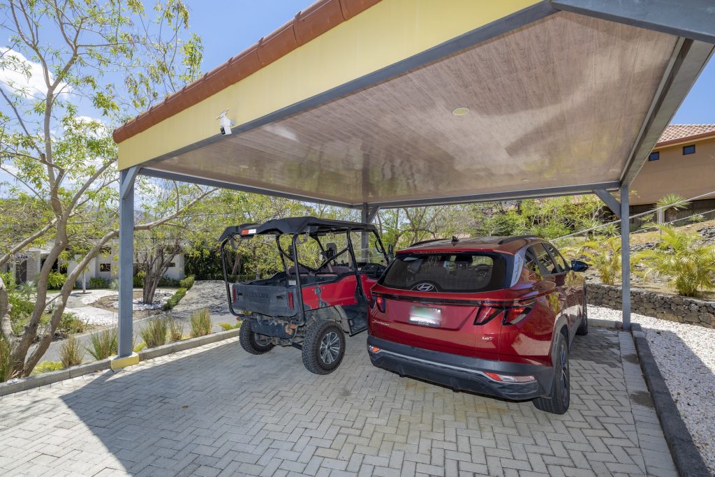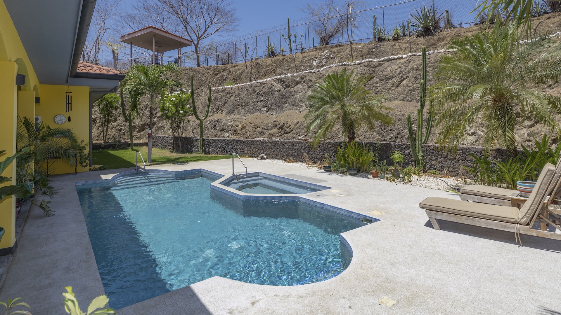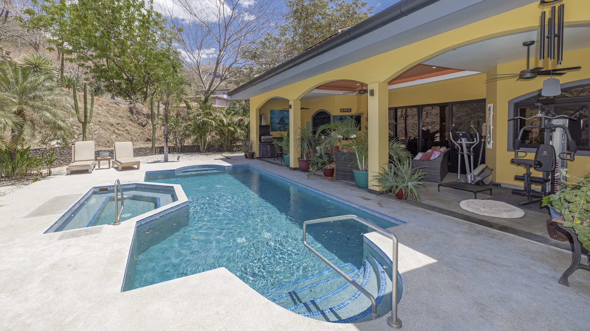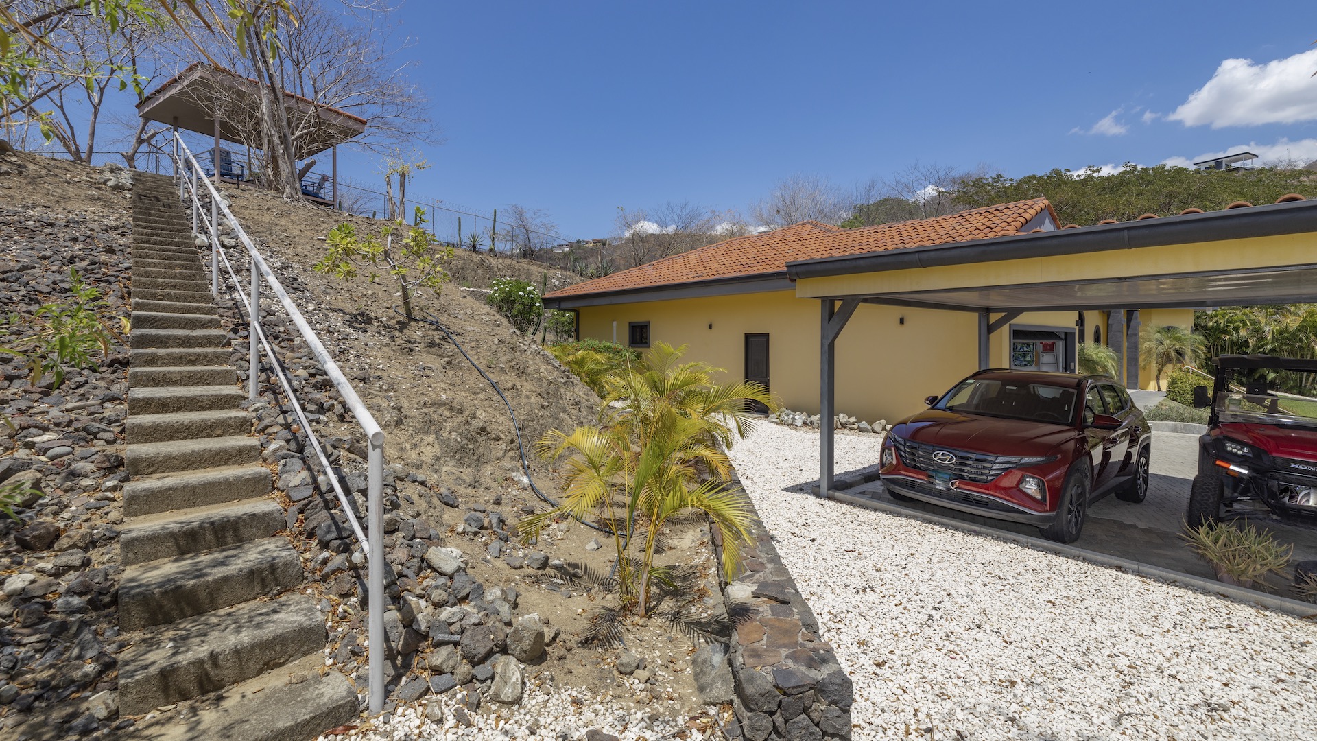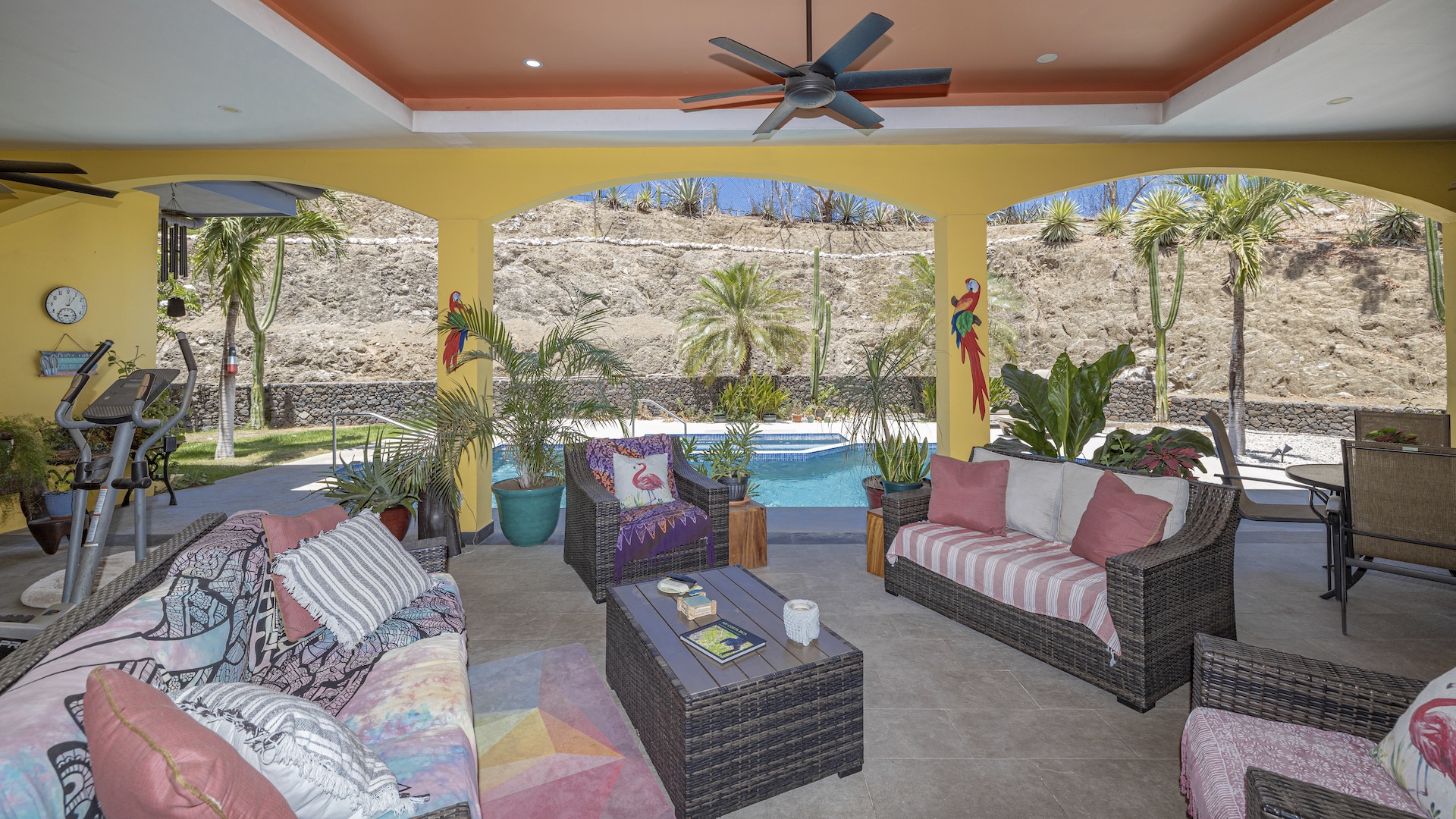 Tucked at the end of a private cul-de-sac, this beautifully designed one level, 3-bedroom, 2-bath residence offers 2,750 total square feet, including 1,700 air-conditioned square feet, an attached two-car garage, and an additional two-car carport, creating a comfortable and well-appointed coastal retreat. The home features a spacious great room with distinct living, dining, and kitchen areas, highlighted by a large kitchen with sit-up bar, all seamlessly flowing onto an expansive covered terrace that overlooks an exceptionally private pool and sunning area—ideal for relaxed indoor-outdoor living. The covered terrace is thoughtfully appointed with a BBQ, wet bar, and mini fridge, as well as a large outdoor living room with a big screen TV and a dedicated workout zone, elevating both entertaining and everyday enjoyment. A generous laundry room is conveniently positioned off the kitchen and garage entrance for added functionality. Perched above the home, a bonus ocean view pavilion provides a tranquil setting to take in coastal breezes and sunset views. The thoughtfully designed layout places the expansive primary suite on one side of the home, complete with direct pool terrace access, a spa-like bathroom with freestanding tub, separate shower, dual vanities, private commode room, and ample closet space, while two guest bedrooms on the opposite side share a full bathroom, offering both comfort and privacy. Ideally located just minutes from Playas del Coco and surrounding coastal towns, the home provides easy access to shopping, dining, nightlife, watersports, and medical services, and is only 25 minutes from Guanacaste International Airport (LIR). Ownership also includes access to the exceptional amenities of Pacifico, including the exclusive beach club with oceanfront dining, tennis and pickleball courts, a fitness center, and resort-style pools, completing a truly elevated coastal lifestyle.