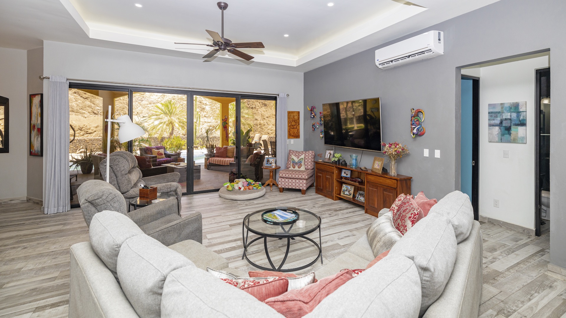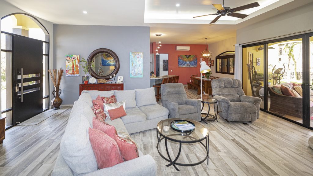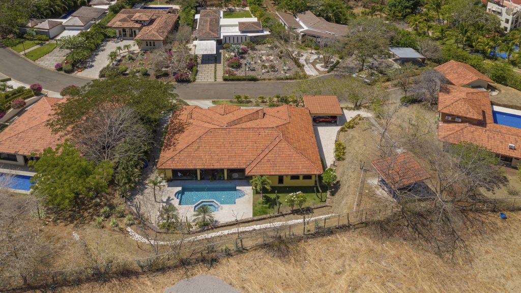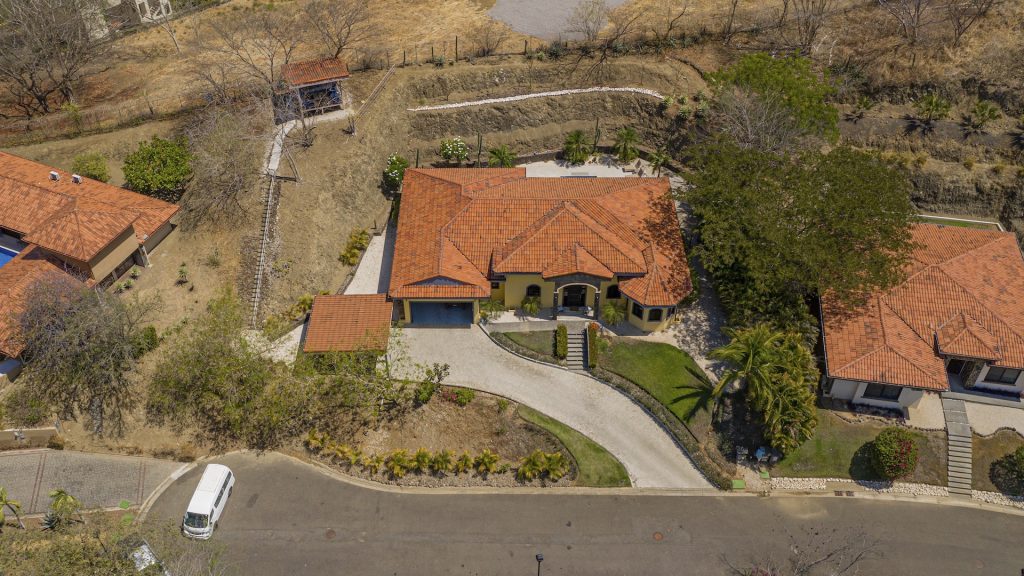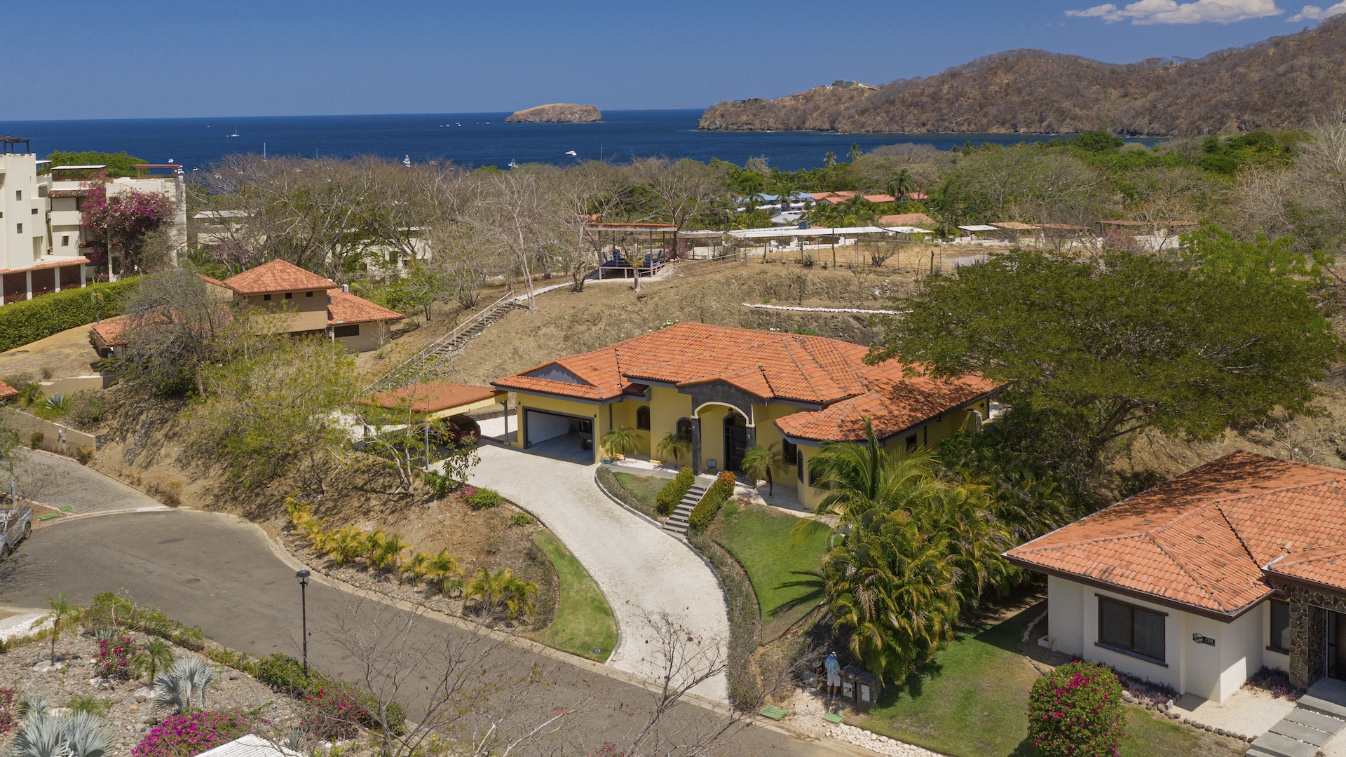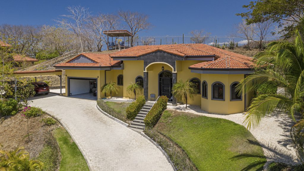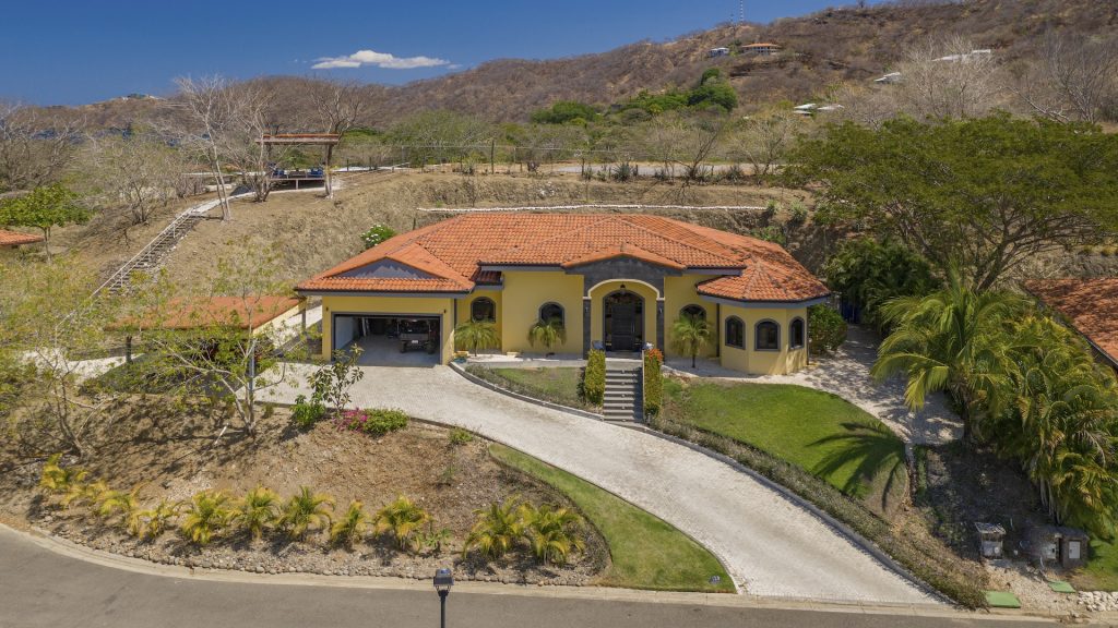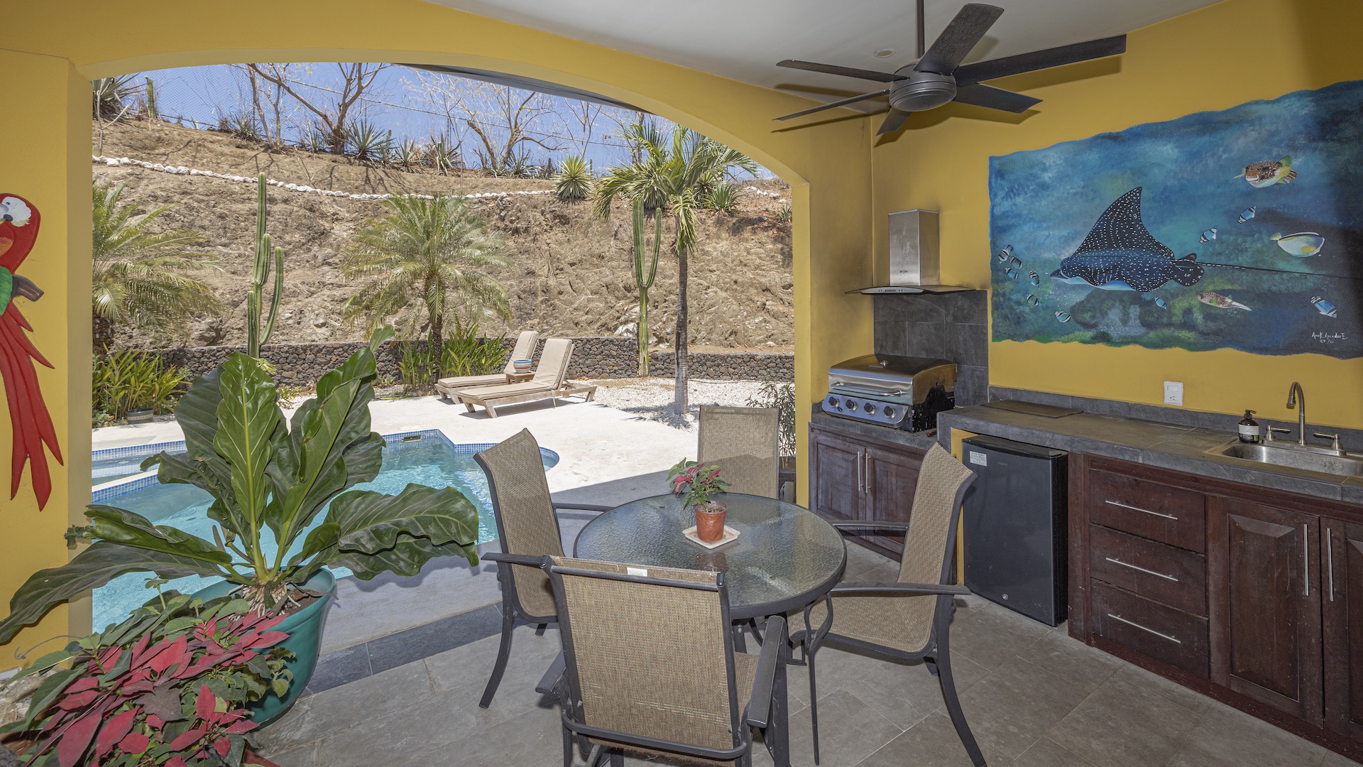 Tucked at the end of a private cul-de-sac, this beautifully designed one level, 3-bedroom, 2-bath residence offers 2,750 total square feet, including 1,700 air-conditioned square feet, an attached two-car garage, and an additional two-car carport, creating a comfortable and well-appointed coastal retreat. The home features a spacious great room with distinct living, dining, and kitchen areas, highlighted by a large kitchen with sit-up bar, all seamlessly flowing onto an expansive covered terrace that overlooks an exceptionally private pool and sunning area—ideal for relaxed indoor-outdoor living. The covered terrace is thoughtfully appointed with a BBQ, wet bar, and mini fridge, as well as a large outdoor living room with a big screen TV and a dedicated workout zone, elevating both entertaining and everyday enjoyment. A generous laundry room is conveniently positioned off the kitchen and garage entrance for added functionality. Perched above the home, a bonus ocean view pavilion provides a tranquil setting to take in coastal breezes and sunset views. The thoughtfully designed layout places the expansive primary suite on one side of the home, complete with direct pool terrace access, a spa-like bathroom with freestanding tub, separate shower, dual vanities, private commode room, and ample closet space, while two guest bedrooms on the opposite side share a full bathroom, offering both comfort and privacy. Ideally located just minutes from Playas del Coco and surrounding coastal towns, the home provides easy access to shopping, dining, nightlife, watersports, and medical services, and is only 25 minutes from Guanacaste International Airport (LIR). Ownership also includes access to the exceptional amenities of Pacifico, including the exclusive beach club with oceanfront dining, tennis and pickleball courts, a fitness center, and resort-style pools, completing a truly elevated coastal lifestyle.