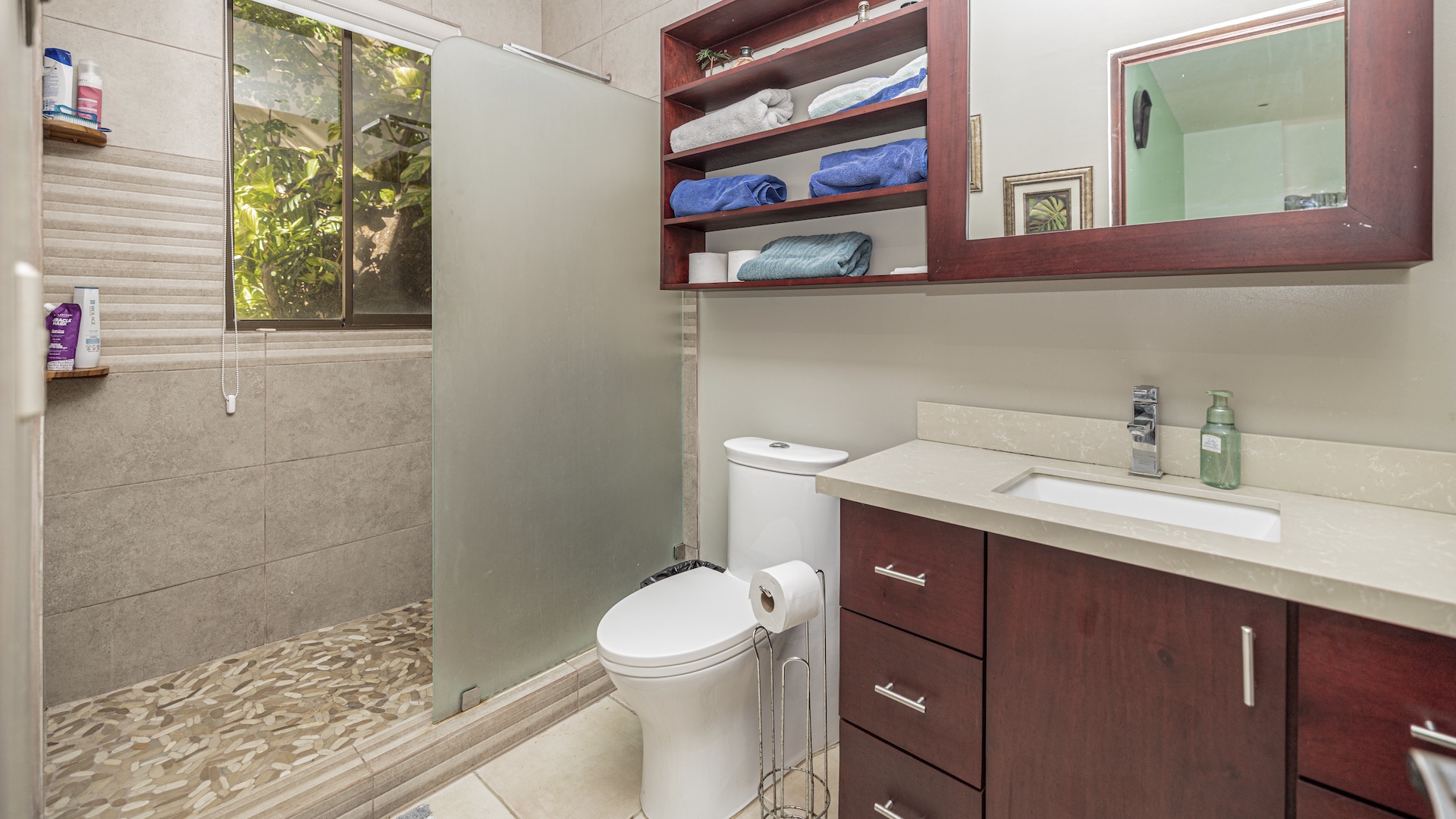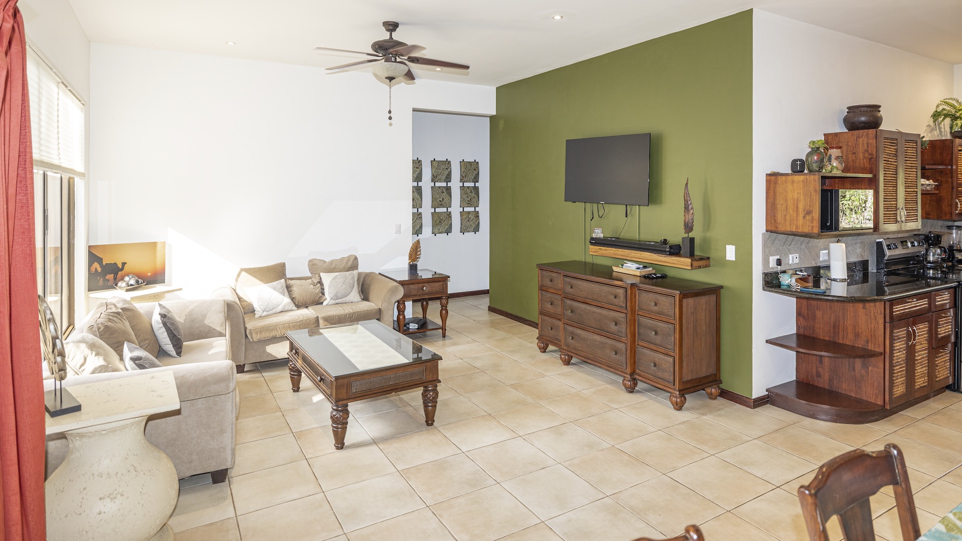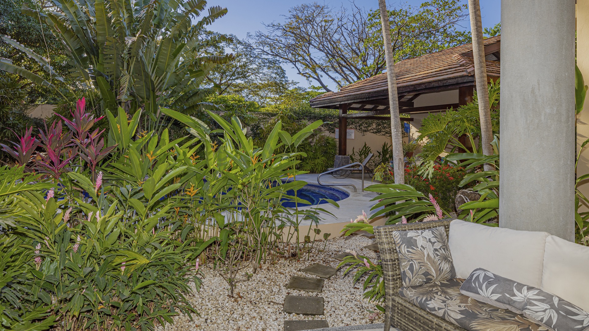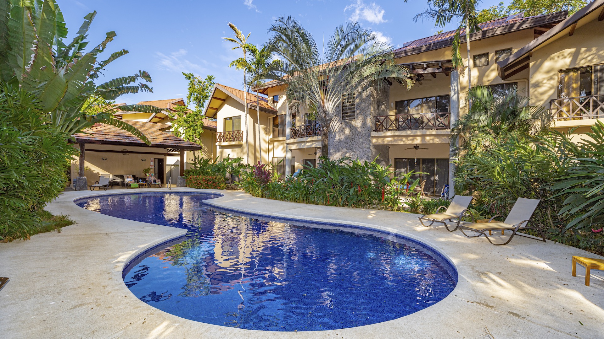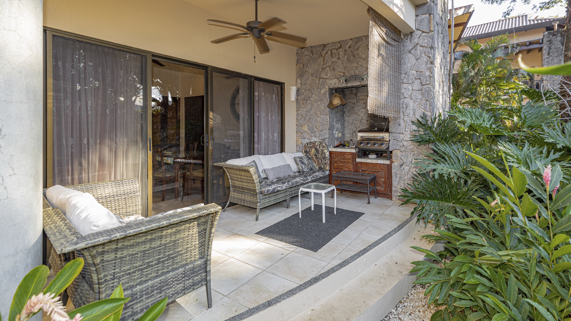 Nestled in a small boutique condominium development within easy walking distance to the beach and the vibrant downtown of Playas del Coco, this beautifully designed ground-floor residence offers a rare sense of privacy and tranquility amid a lush, mature tropical landscape conceived by renowned Costa Rican architect Ronald Zurcher. The 1,316-square-foot, single-level condo features three bedrooms and two bathrooms, including a spacious primary suite with an ensuite bath, while the two additional bedrooms share a well-appointed full bathroom. An open-concept great room seamlessly blends the large kitchen, living, and dining areas, flowing out to a private covered terrace with a built-in BBQ that overlooks manicured gardens, two stunning common swimming pools, and shared ranchos—creating an inviting indoor-outdoor lifestyle. Fully furnished and equipped, the home showcases tile flooring, granite and marble countertops, and stainless steel appliances, all within a secure, fully walled community offering 24-hour security and off-street parking. Perfectly located just 25 minutes from Guanacaste International Airport (LIR) and only minutes from shopping, medical services, restaurants, water sports, outdoor adventures, and Playas del Coco’s lively nightlife, this condo delivers refined coastal living in a serene oasis setting.