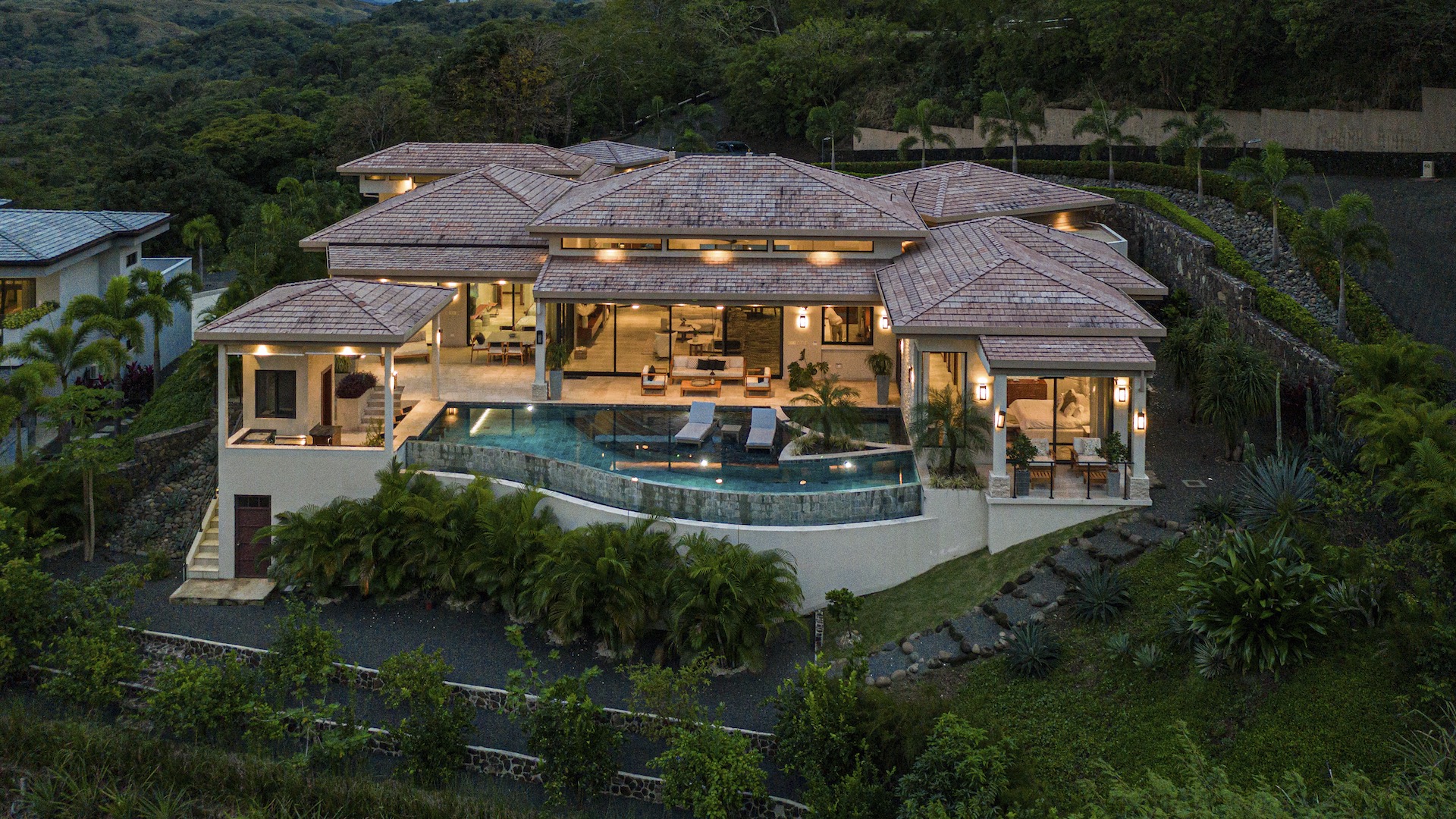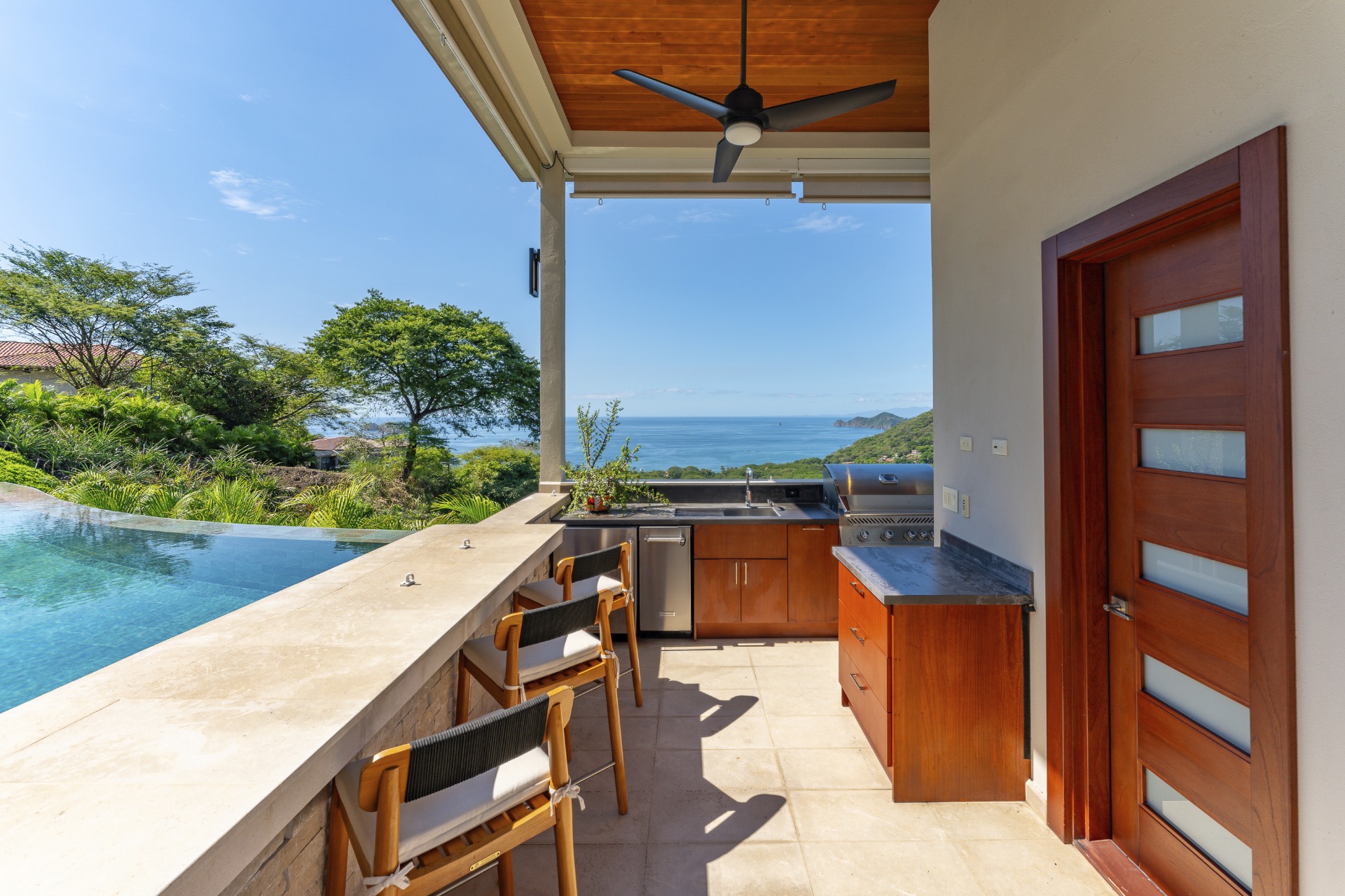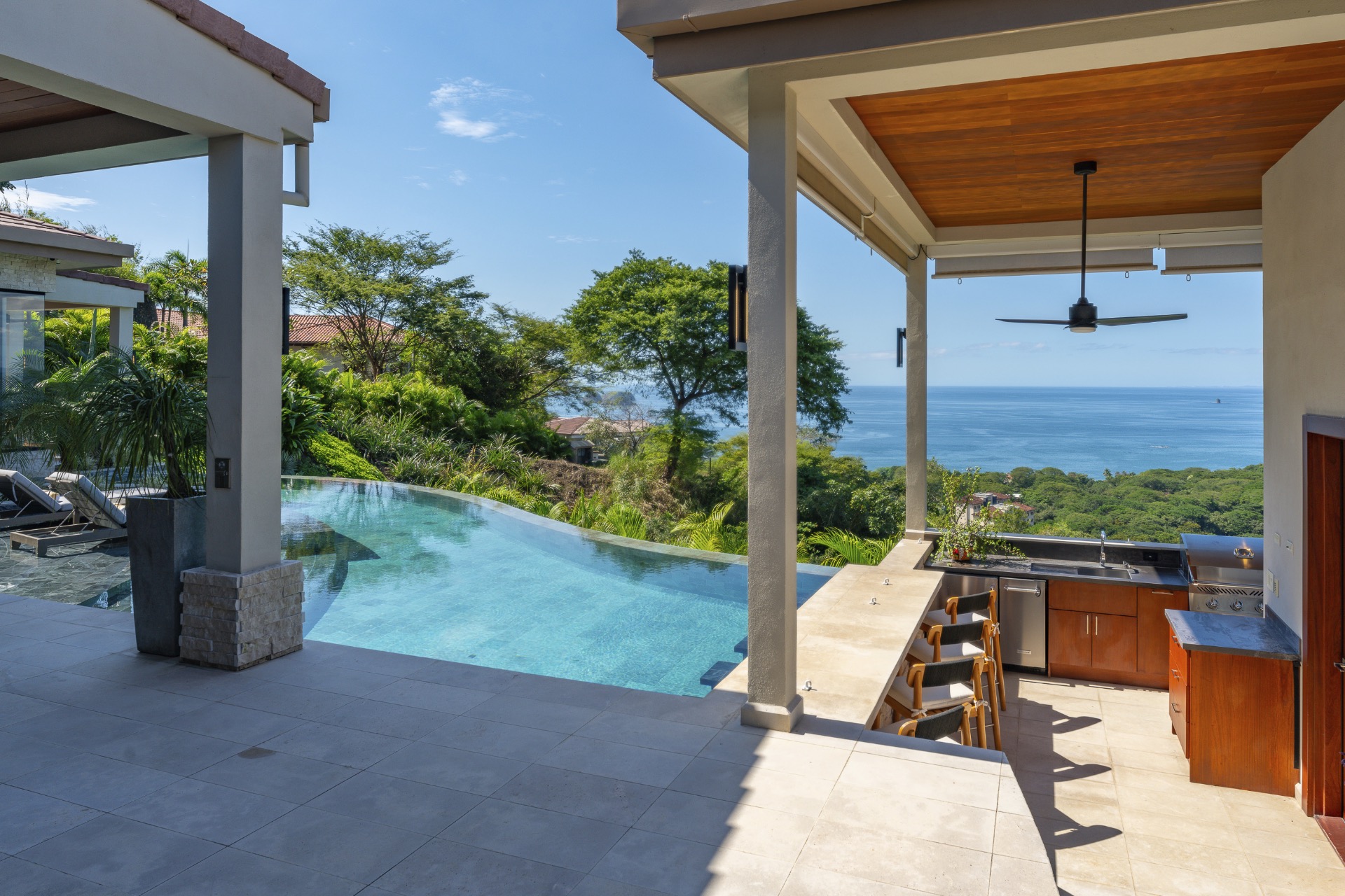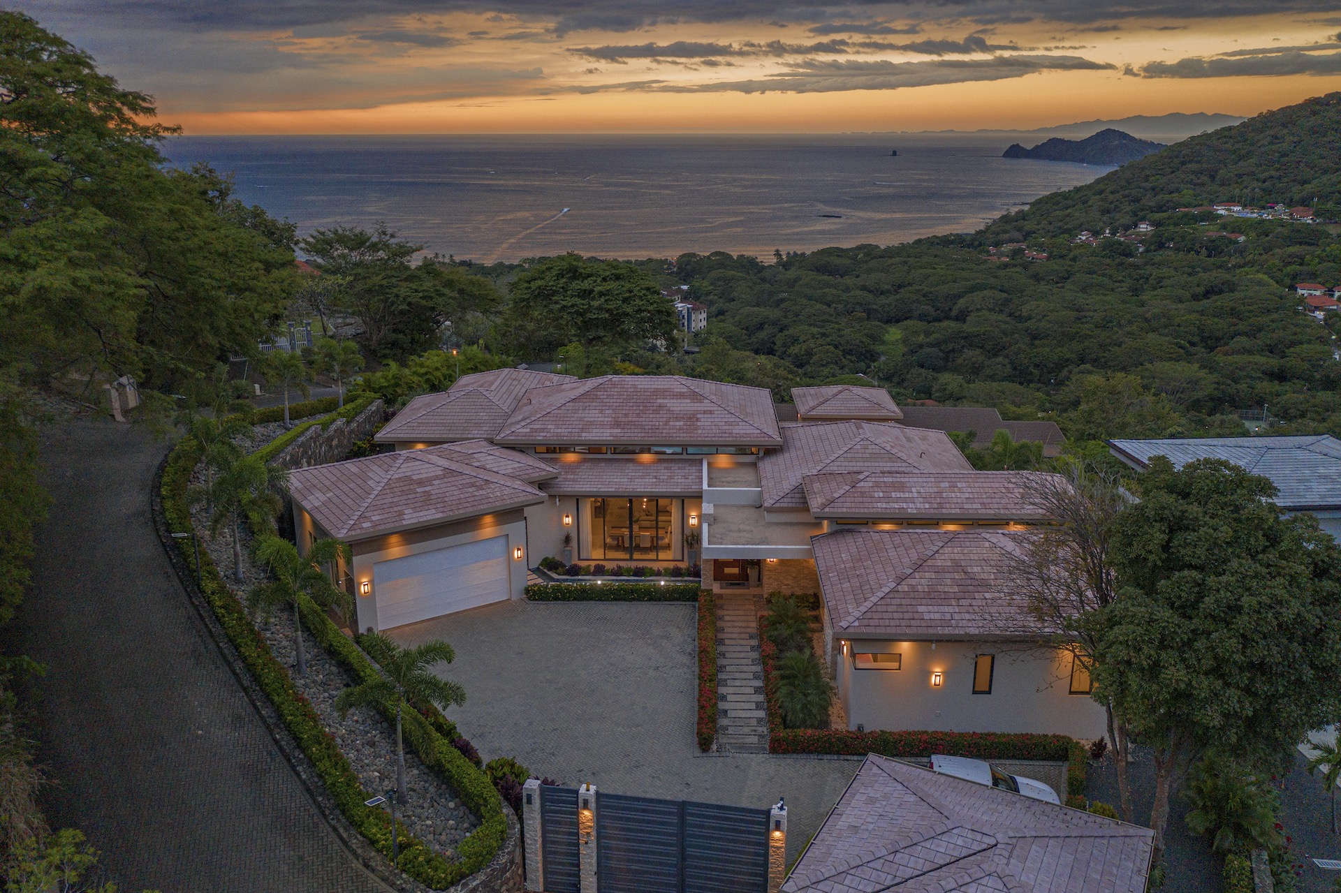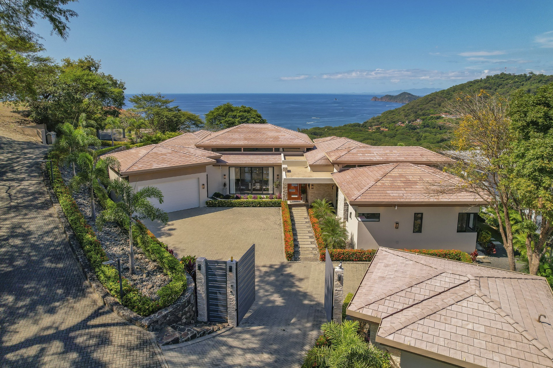 This beautifully designed, luxuriously finished, and tastefully furnished contemporary home is set inside Monte Bello, the premiere residential development in Playa Hermosa, Guanacaste, Costa Rica. Within sight of the Peninsula Papagayo and Punta Cacique you enjoy proximity to the highest level of luxury development that Costa Rica offers such as the Four Seasons, Ritz Carlton and Waldorf Astoria to name a few. Nestled on a mountainside this luxury ocean view estate home boasts a build quality, finish specifications and upscale furnishings that is second to none. This palatial home sits on a 2,210 M2 Lot and has 4,220 square feet of airconditioned space and measures 7,010 total square feet with 5 bedrooms, 5 full bathrooms, 2 half bathrooms and 4 kitchens and come turnkey ready with high end fixtures and appliances, as well as custom built tropical wood doors, cabinetry and closets. Upon entering the great room of the house, you are met with a stunning ocean view and soaring high ceilings fitted with wooden accents and mood lighting. The cathedral like high ceilings are continued throughout the entire house with varying degrees of wood accents and designer lighting. The kitchen features an island with sit up bar seating and is equipped to cook like a king. There is a dedicated dining area with a built in side bar fitted with a wine a beverage cooler. The living room enjoys vaulted ceilings and features stunning ocean views through the floor to ceiling sliding glass doors that lead out onto the covered pool terrace. The large pool Terrace has a full outdoor living room set along with a separate dining area. The infinity pool has a sunning deck and a adjoining jacuzzi. The swim up bar is a sunken Rancho with a full kitchen, BBQ and bathroom. Each of the 3 bedrooms in the main house has an ocean view and ensuite bathroom. The main suite has a private ocean view terrace. There is a separate 1 bedroom guest house with full kitchen along with a studio apartment also with full kitchen. You are surrounded by Multi Million-Dollar homes inside coveted Monte Bello and are within minutes to the beach and close to an outstanding selection of local restaurants and shopping options and a short drive from the commercial and entertainment center of Playas del Coco and just 25 minutes to the Guanacaste International Airport (LIR) and close to various full service private hospitals and clinics. Move in today and enjoy your new lifestyle.