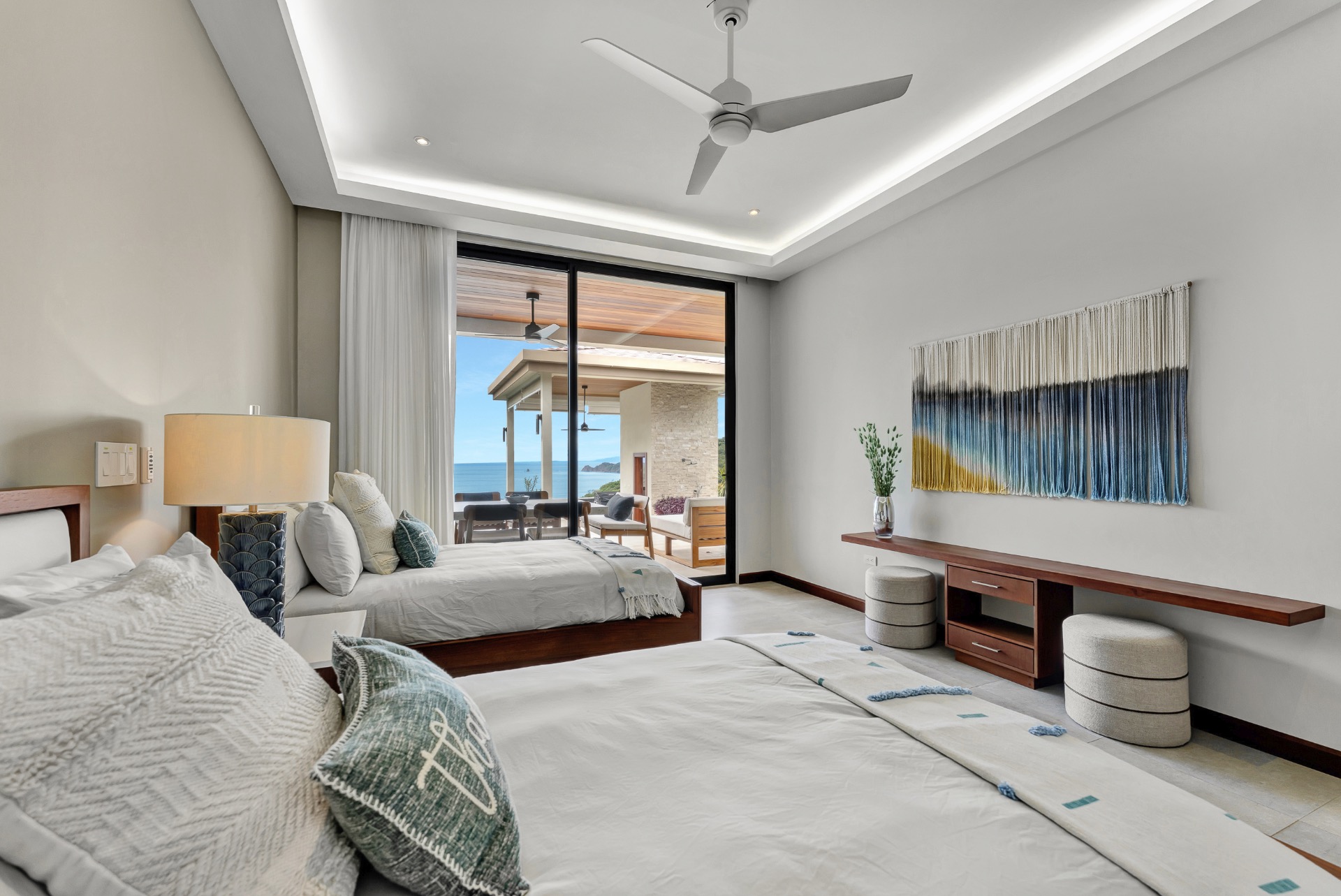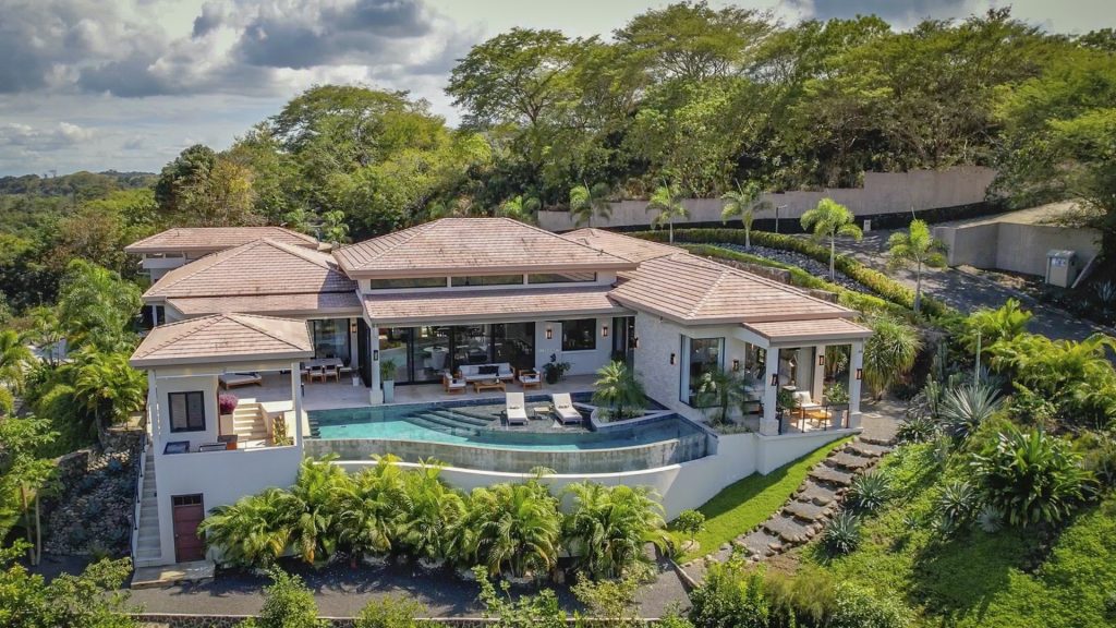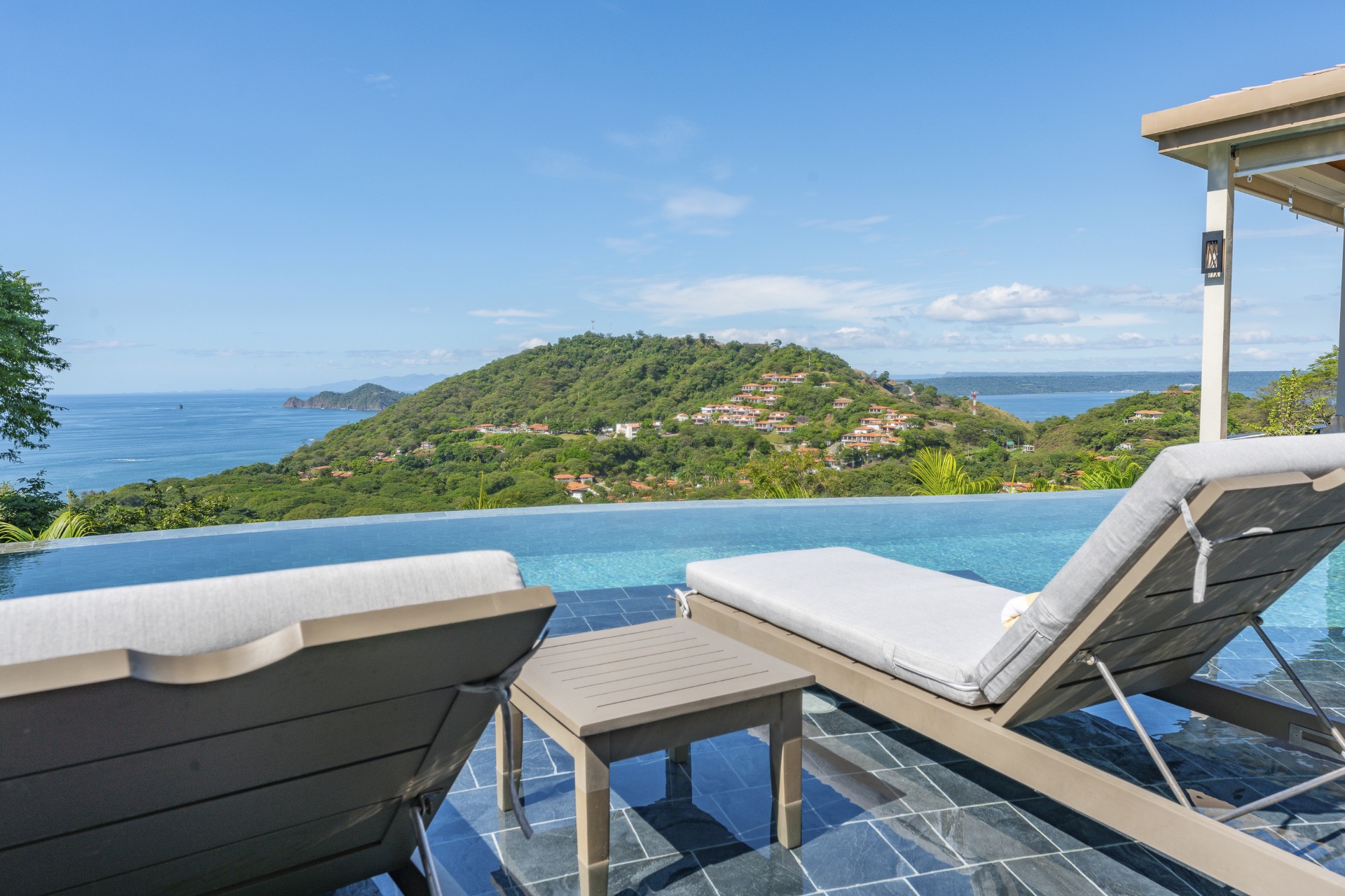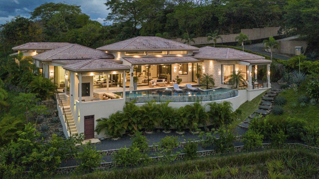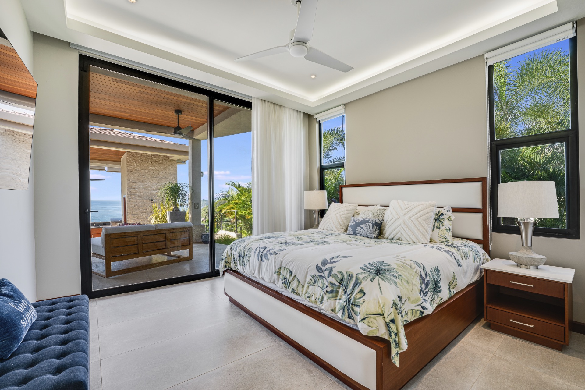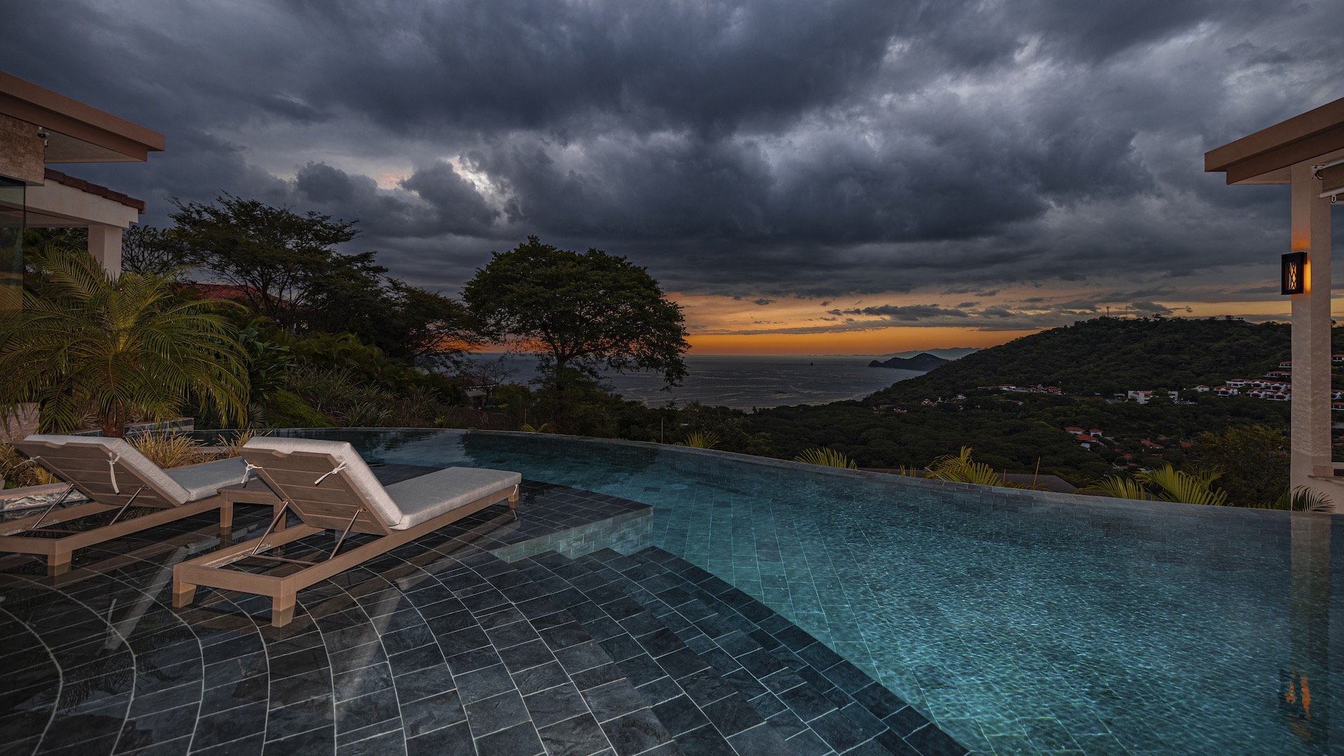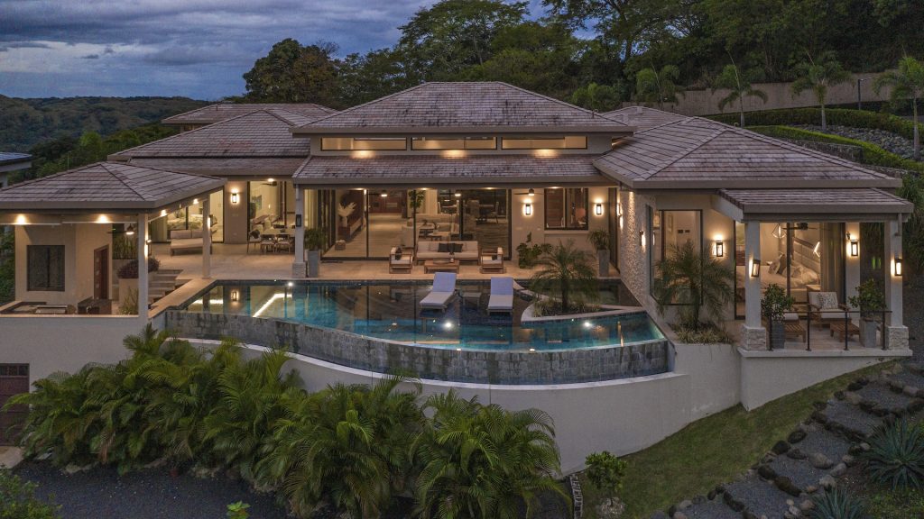 This beautifully designed, luxuriously finished, and tastefully furnished contemporary home is set inside Monte Bello, the premiere residential development in Playa Hermosa, Guanacaste, Costa Rica. Within sight of the Peninsula Papagayo and Punta Cacique you enjoy proximity to the highest level of luxury development that Costa Rica offers such as the Four Seasons, Ritz Carlton and Waldorf Astoria to name a few. Nestled on a mountainside this luxury ocean view estate home boasts a build quality, finish specifications and upscale furnishings that is second to none. This palatial home sits on a 2,210 M2 Lot and has 4,220 square feet of airconditioned space and measures 7,010 total square feet with 5 bedrooms, 5 full bathrooms, 2 half bathrooms and 4 kitchens and come turnkey ready with high end fixtures and appliances, as well as custom built tropical wood doors, cabinetry and closets. Upon entering the great room of the house, you are met with a stunning ocean view and soaring high ceilings fitted with wooden accents and mood lighting. The cathedral like high ceilings are continued throughout the entire house with varying degrees of wood accents and designer lighting. The kitchen features an island with sit up bar seating and is equipped to cook like a king. There is a dedicated dining area with a built in side bar fitted with a wine a beverage cooler. The living room enjoys vaulted ceilings and features stunning ocean views through the floor to ceiling sliding glass doors that lead out onto the covered pool terrace. The large pool Terrace has a full outdoor living room set along with a separate dining area. The infinity pool has a sunning deck and a adjoining jacuzzi. The swim up bar is a sunken Rancho with a full kitchen, BBQ and bathroom. Each of the 3 bedrooms in the main house has an ocean view and ensuite bathroom. The main suite has a private ocean view terrace. There is a separate 1 bedroom guest house with full kitchen along with a studio apartment also with full kitchen. You are surrounded by Multi Million-Dollar homes inside coveted Monte Bello and are within minutes to the beach and close to an outstanding selection of local restaurants and shopping options and a short drive from the commercial and entertainment center of Playas del Coco and just 25 minutes to the Guanacaste International Airport (LIR) and close to various full service private hospitals and clinics. Move in today and enjoy your new lifestyle.