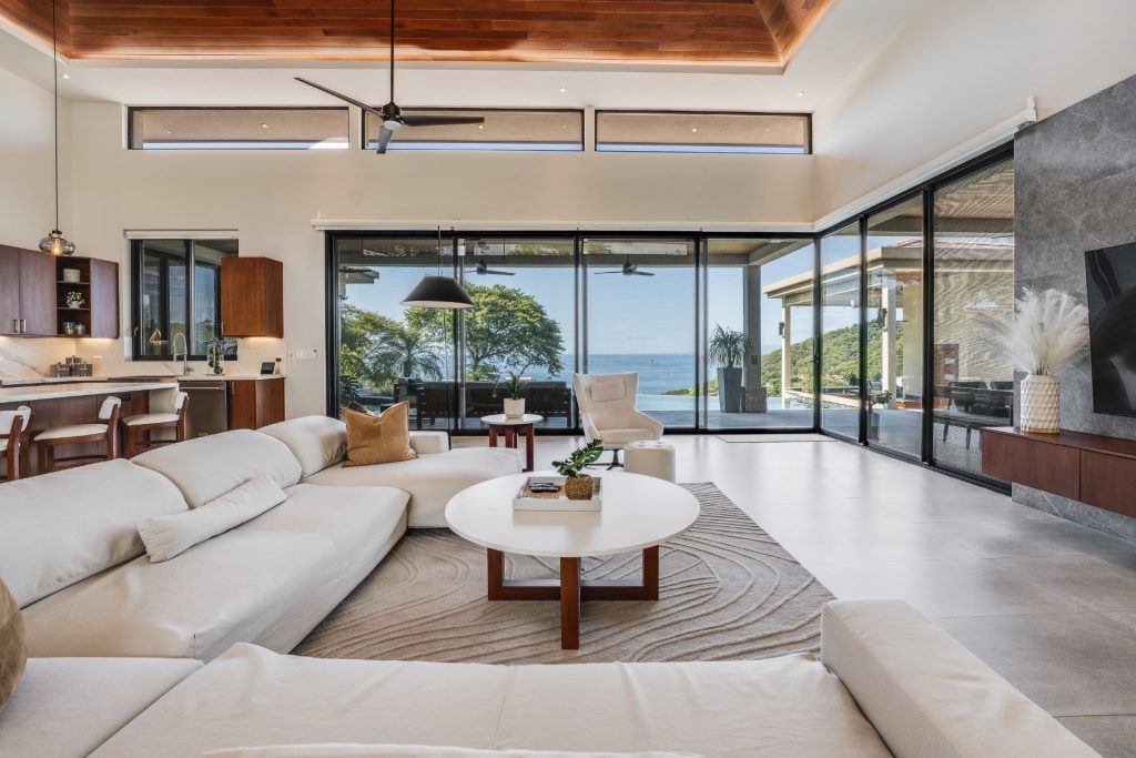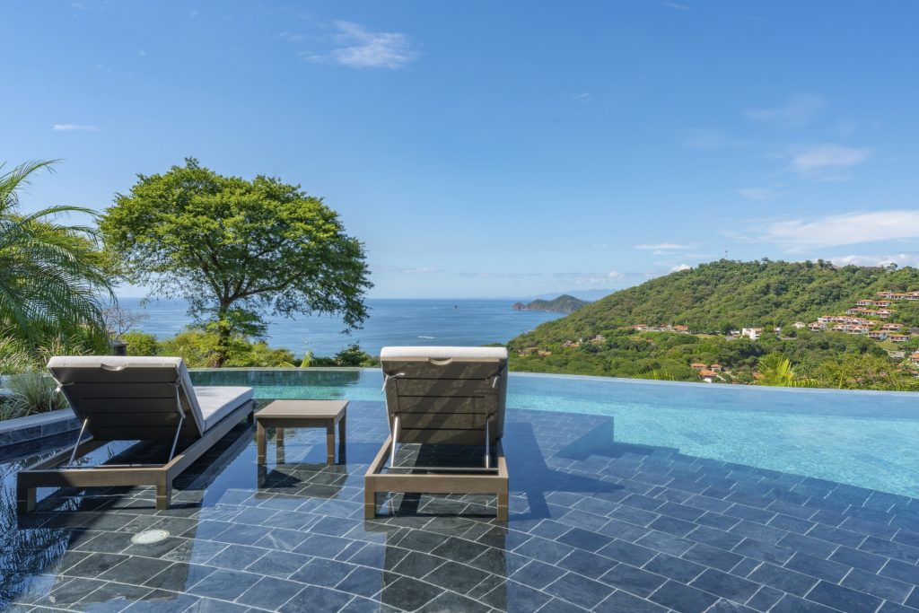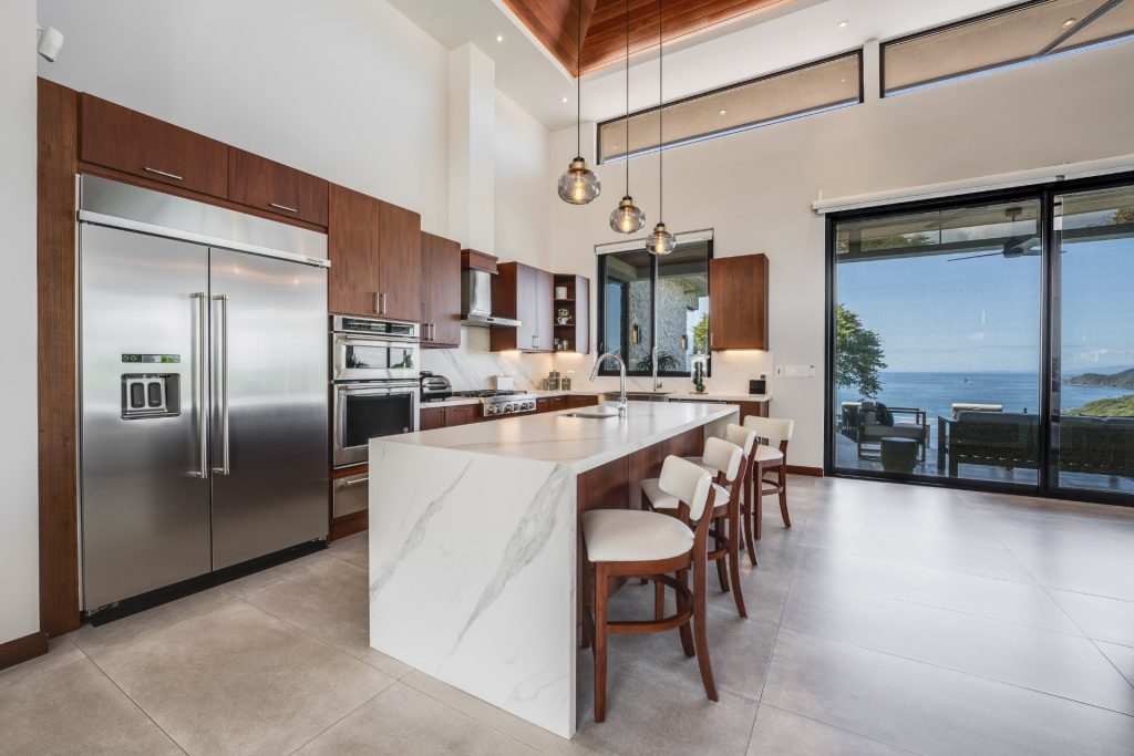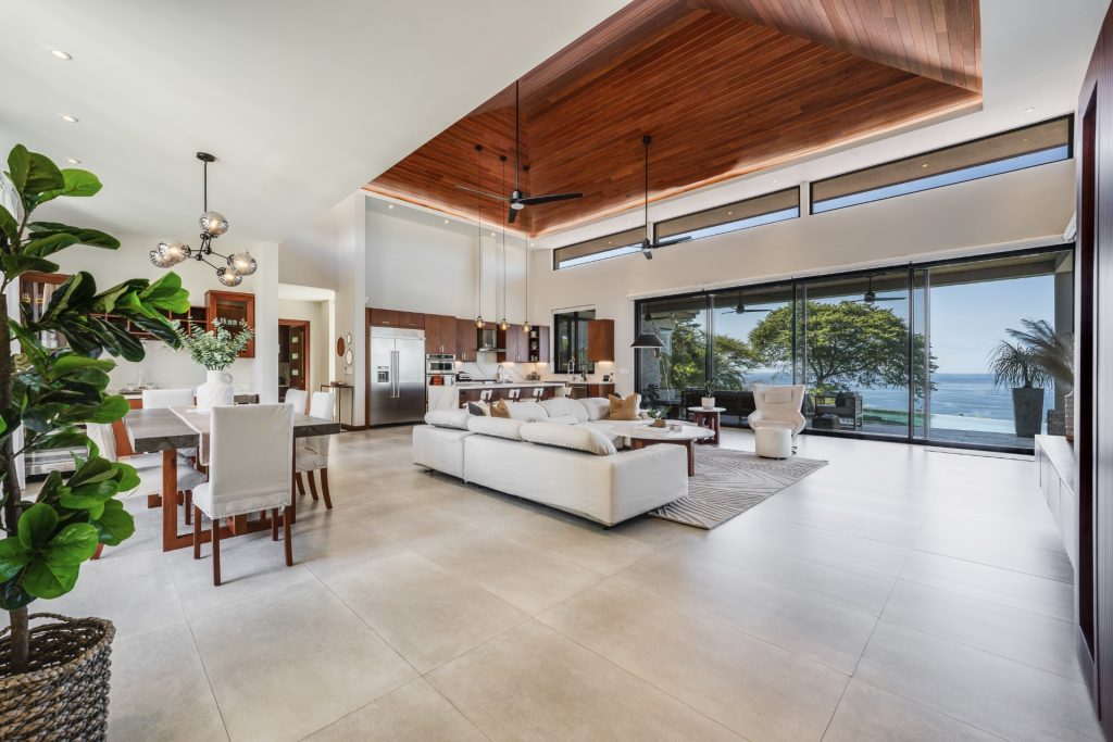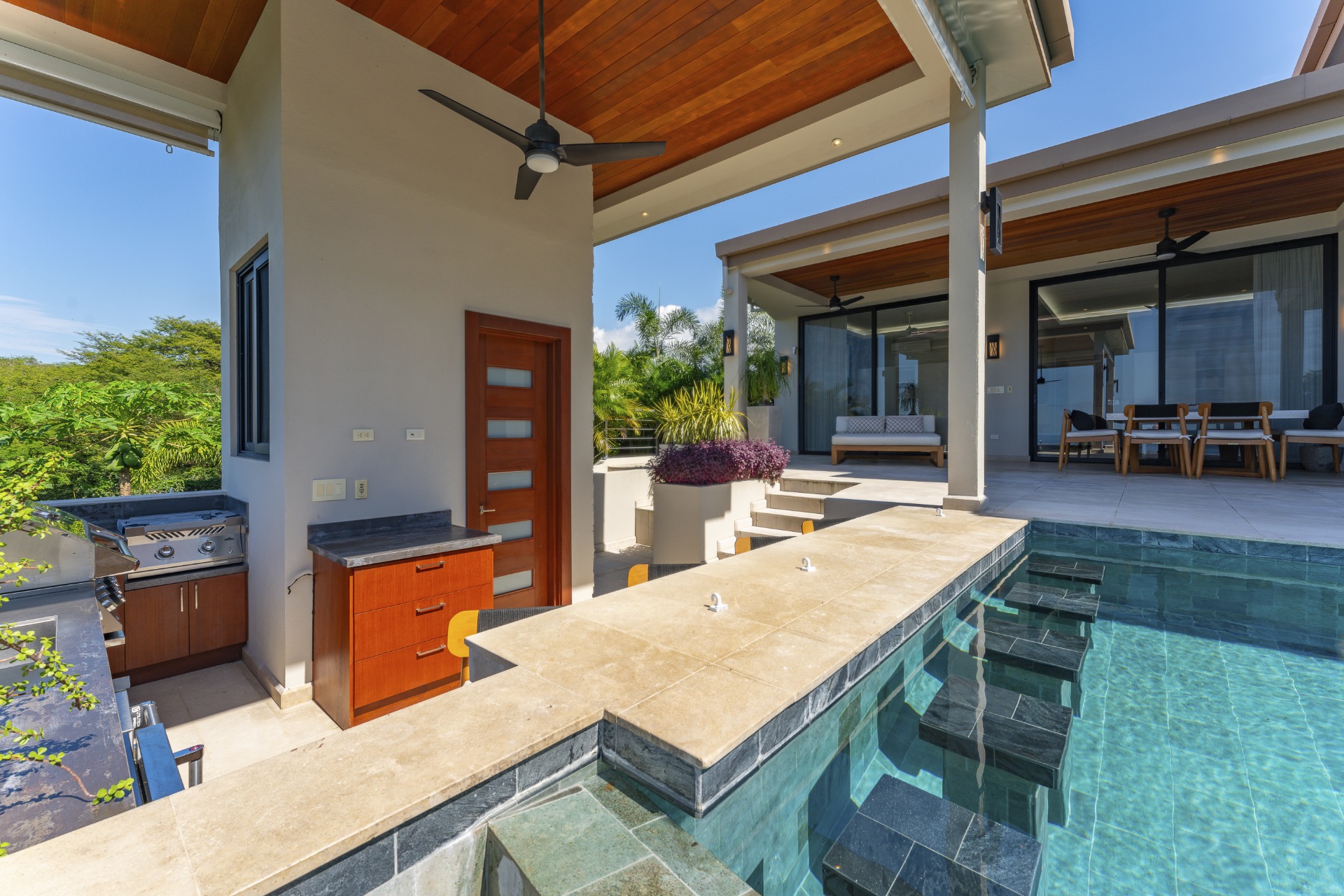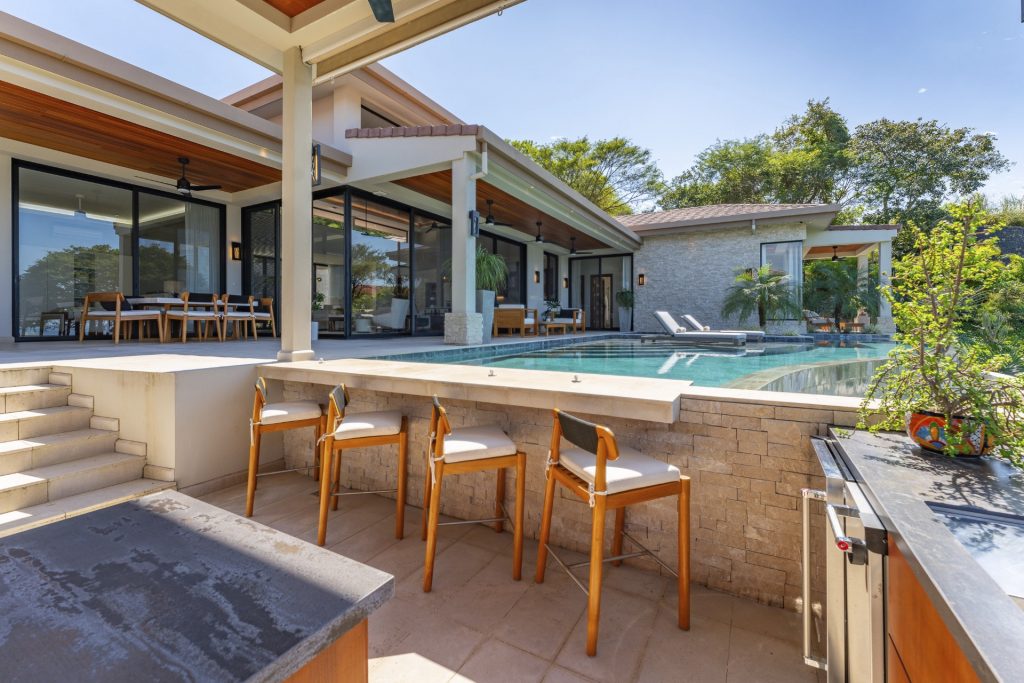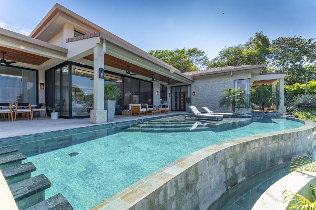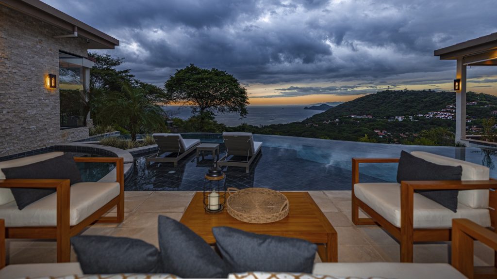 This beautifully designed, luxuriously finished, and tastefully furnished contemporary home is set inside Monte Bello, the premiere residential development in Playa Hermosa, Guanacaste, Costa Rica. Within sight of the Peninsula Papagayo and Punta Cacique you enjoy proximity to the highest level of luxury development that Costa Rica offers such as the Four Seasons, Ritz Carlton and Waldorf Astoria to name a few. Nestled on a mountainside this luxury ocean view estate home boasts a build quality, finish specifications and upscale furnishings that is second to none. This palatial home sits on a 2,210 M2 Lot and has 4,220 square feet of airconditioned space and measures 7,010 total square feet with 5 bedrooms, 5 full bathrooms, 2 half bathrooms and 4 kitchens and come turnkey ready with high end fixtures and appliances, as well as custom built tropical wood doors, cabinetry and closets. Upon entering the great room of the house, you are met with a stunning ocean view and soaring high ceilings fitted with wooden accents and mood lighting. The cathedral like high ceilings are continued throughout the entire house with varying degrees of wood accents and designer lighting. The kitchen features an island with sit up bar seating and is equipped to cook like a king. There is a dedicated dining area with a built in side bar fitted with a wine a beverage cooler. The living room enjoys vaulted ceilings and features stunning ocean views through the floor to ceiling sliding glass doors that lead out onto the covered pool terrace. The large pool Terrace has a full outdoor living room set along with a separate dining area. The infinity pool has a sunning deck and a adjoining jacuzzi. The swim up bar is a sunken Rancho with a full kitchen, BBQ and bathroom. Each of the 3 bedrooms in the main house has an ocean view and ensuite bathroom. The main suite has a private ocean view terrace. There is a separate 1 bedroom guest house with full kitchen along with a studio apartment also with full kitchen. You are surrounded by Multi Million-Dollar homes inside coveted Monte Bello and are within minutes to the beach and close to an outstanding selection of local restaurants and shopping options and a short drive from the commercial and entertainment center of Playas del Coco and just 25 minutes to the Guanacaste International Airport (LIR) and close to various full service private hospitals and clinics. Move in today and enjoy your new lifestyle.