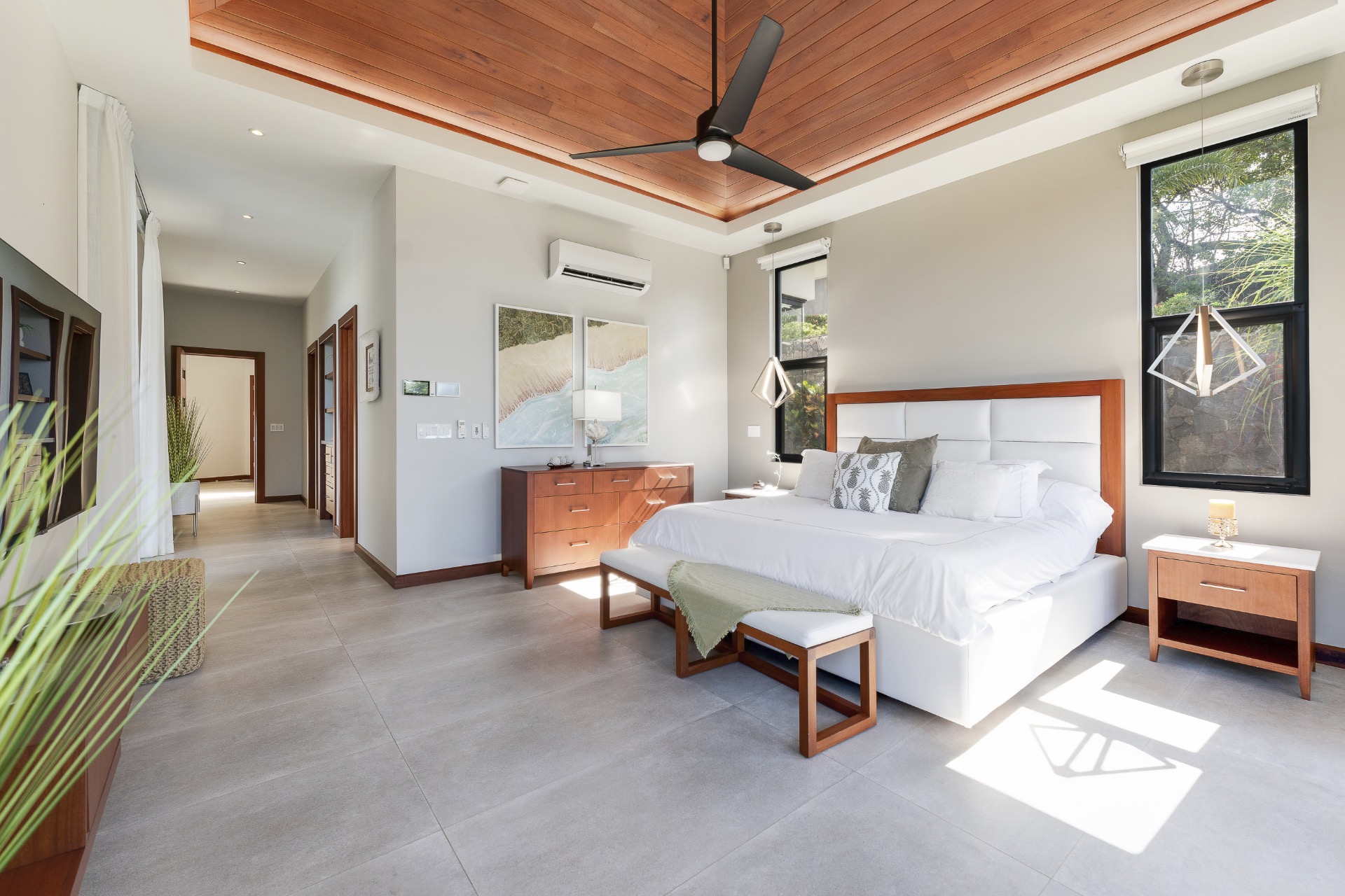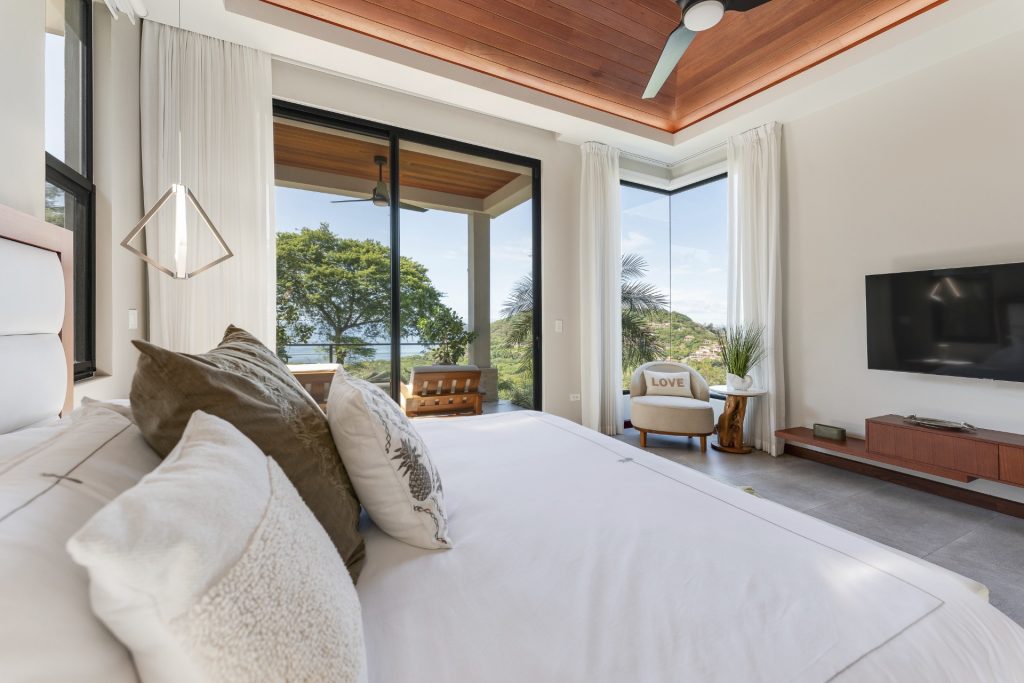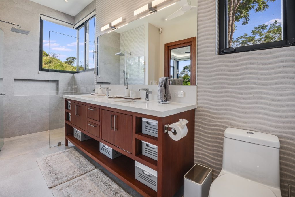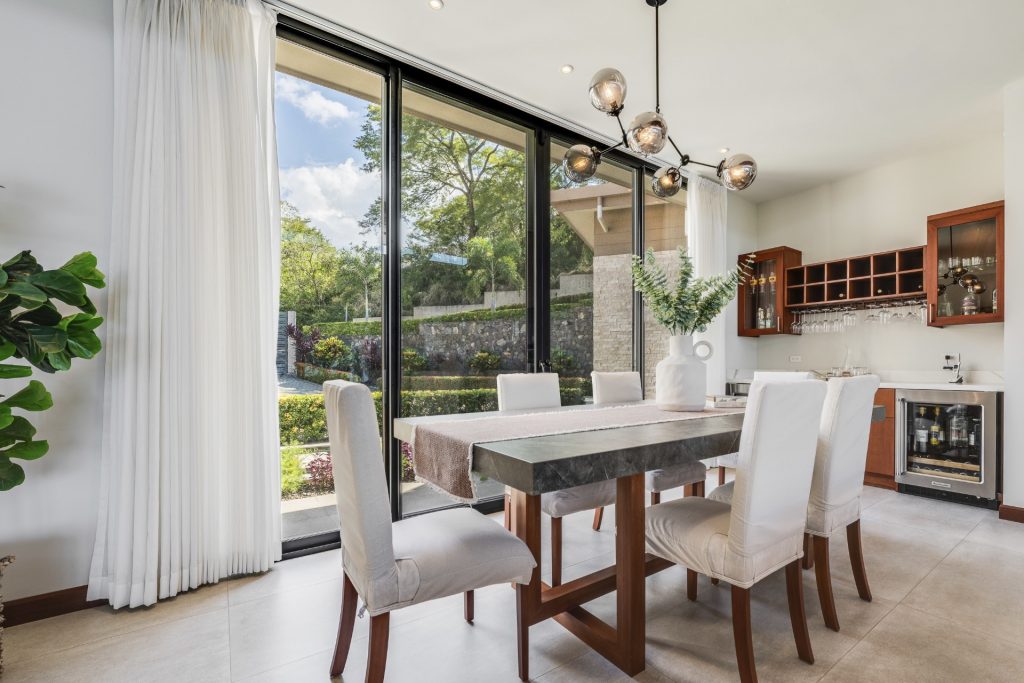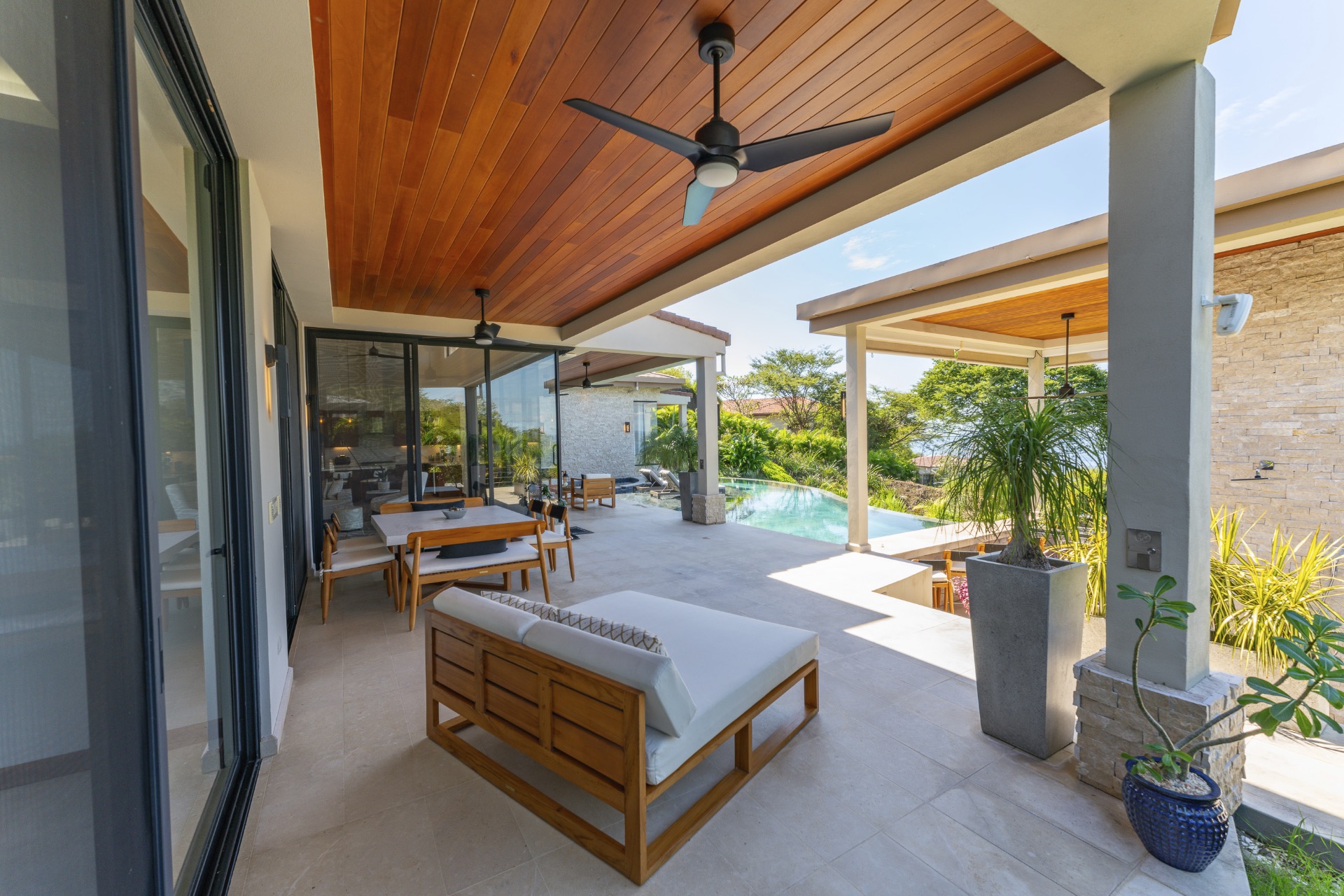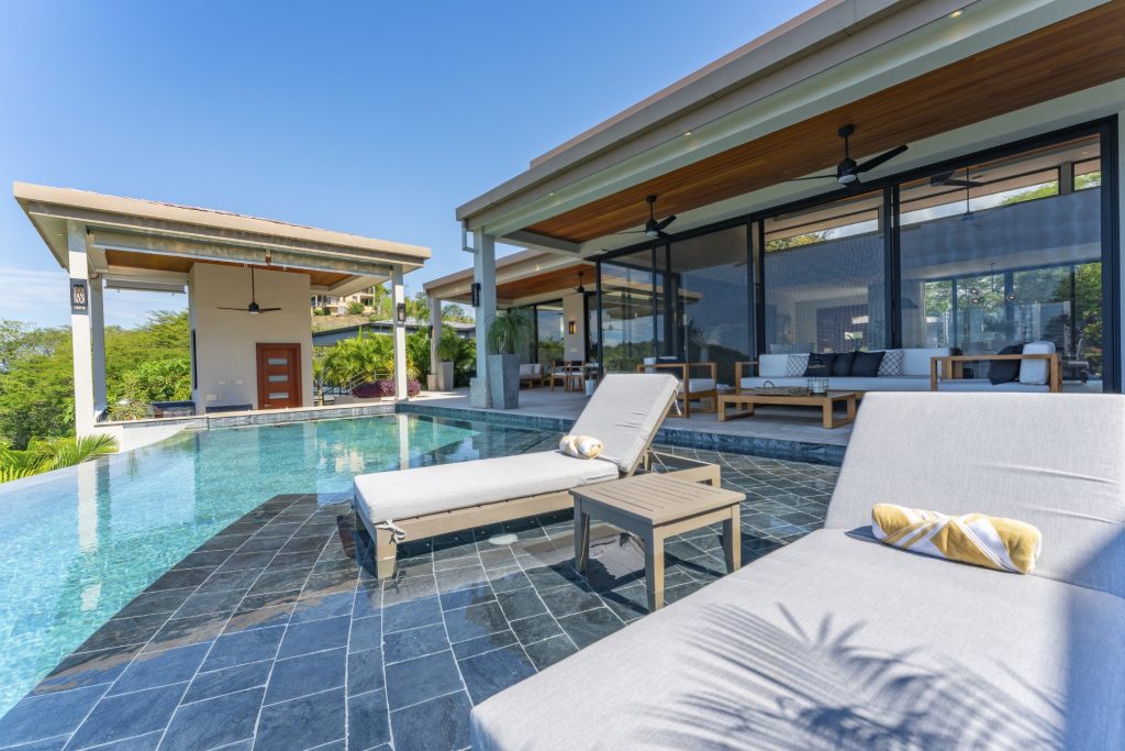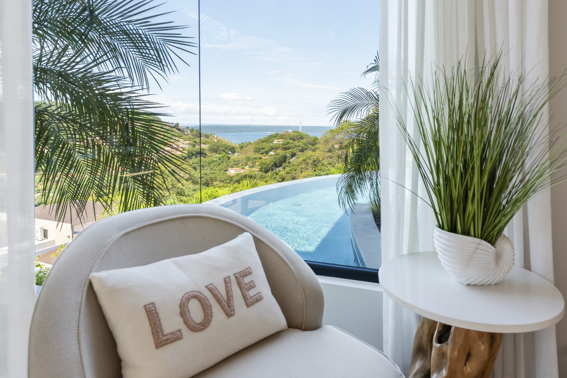 This beautifully designed, luxuriously finished, and tastefully furnished contemporary home is set inside Monte Bello, the premiere residential development in Playa Hermosa, Guanacaste, Costa Rica. Within sight of the Peninsula Papagayo and Punta Cacique you enjoy proximity to the highest level of luxury development that Costa Rica offers such as the Four Seasons, Ritz Carlton and Waldorf Astoria to name a few. Nestled on a mountainside this luxury ocean view estate home boasts a build quality, finish specifications and upscale furnishings that is second to none. This palatial home sits on a 2,210 M2 Lot and has 4,220 square feet of airconditioned space and measures 7,010 total square feet with 5 bedrooms, 5 full bathrooms, 2 half bathrooms and 4 kitchens and come turnkey ready with high end fixtures and appliances, as well as custom built tropical wood doors, cabinetry and closets. Upon entering the great room of the house, you are met with a stunning ocean view and soaring high ceilings fitted with wooden accents and mood lighting. The cathedral like high ceilings are continued throughout the entire house with varying degrees of wood accents and designer lighting. The kitchen features an island with sit up bar seating and is equipped to cook like a king. There is a dedicated dining area with a built in side bar fitted with a wine a beverage cooler. The living room enjoys vaulted ceilings and features stunning ocean views through the floor to ceiling sliding glass doors that lead out onto the covered pool terrace. The large pool Terrace has a full outdoor living room set along with a separate dining area. The infinity pool has a sunning deck and a adjoining jacuzzi. The swim up bar is a sunken Rancho with a full kitchen, BBQ and bathroom. Each of the 3 bedrooms in the main house has an ocean view and ensuite bathroom. The main suite has a private ocean view terrace. There is a separate 1 bedroom guest house with full kitchen along with a studio apartment also with full kitchen. You are surrounded by Multi Million-Dollar homes inside coveted Monte Bello and are within minutes to the beach and close to an outstanding selection of local restaurants and shopping options and a short drive from the commercial and entertainment center of Playas del Coco and just 25 minutes to the Guanacaste International Airport (LIR) and close to various full service private hospitals and clinics. Move in today and enjoy your new lifestyle.