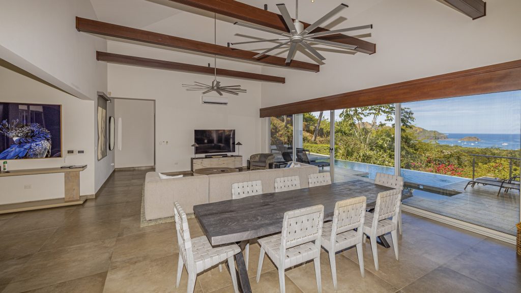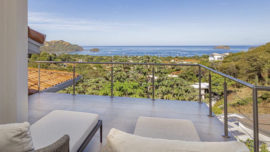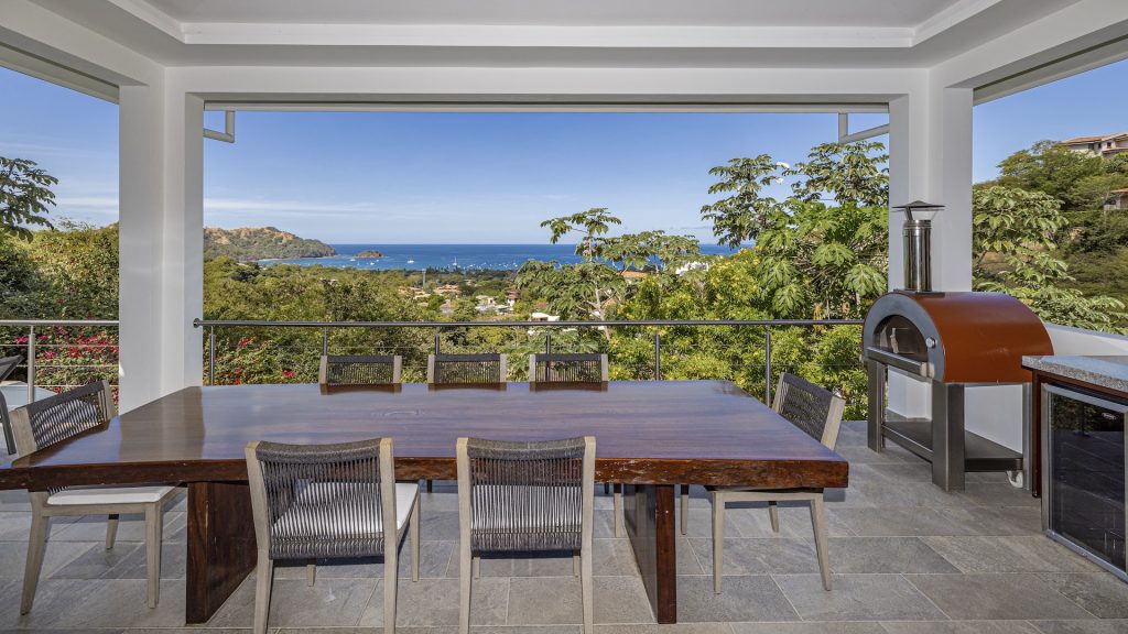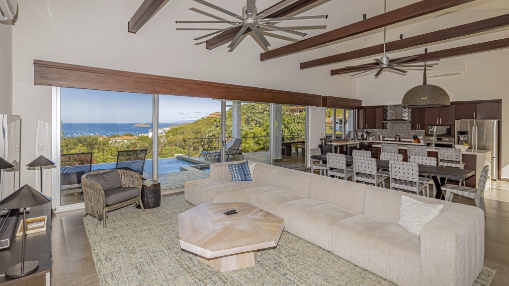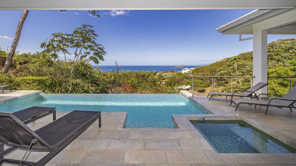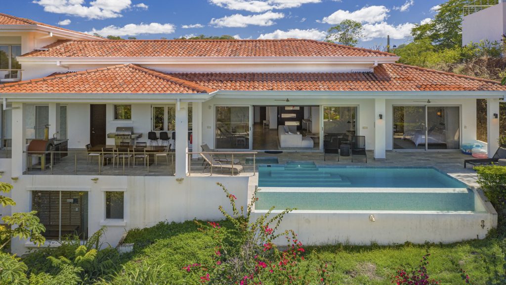 This impeccably built luxury residence offers 3,700 square feet of air-conditioned living space on a generous 1,834 square meter lot within the private, gated Pacifico community, boasting commanding ocean views over Playas del Coco and the Golfo Papagayo while remaining just minutes from the charm and conveniences of this vibrant beach town and nearby coastal destinations. Designed as an open-concept home for both refined living and effortless entertaining, the main living, dining, and kitchen areas flow seamlessly together and open directly onto the expansive pool terrace, creating a perfect indoor–outdoor lifestyle. The home features an infinity-edge pool, outdoor jacuzzi, sauna with full bath, and a lower ocean-view terrace, complemented by multiple shaded terraces with lounge areas, separate dining areas both indoors and outdoors on the shaded terrace, an outdoor grill, and a wood-fired pizza oven. A large internal Zen garden provides a tranquil architectural focal point, beautifully connecting the great room with the air-conditioned media and game room, which also offers the flexibility to be converted into an additional bedroom. The property includes a fully equipped main kitchen plus an additional full kitchen, an expansive second-floor primary suite with stunning views, and three additional en-suite bedrooms on the main level, all generously sized to accommodate king beds. Additional highlights include a Sonos sound system, attached two-car garage, high-quality construction and finishes throughout, full air conditioning, and a triple filtration and water softening system delivering bottled-water quality from every tap. Ideally located just minutes from multiple beach towns and a full array of services including shopping, dining, nightlife, watersports, medical and dental care, and only 25 minutes from Guanacaste International Airport (LIR), owners also enjoy access to Pacifico’s exceptional amenities and the exclusive Pacifico Beach Club with direct access to the sandy beaches of Playas del Coco, oceanfront dining, and resort-style pools and lounge areas, completing a truly elevated coastal lifestyle.
