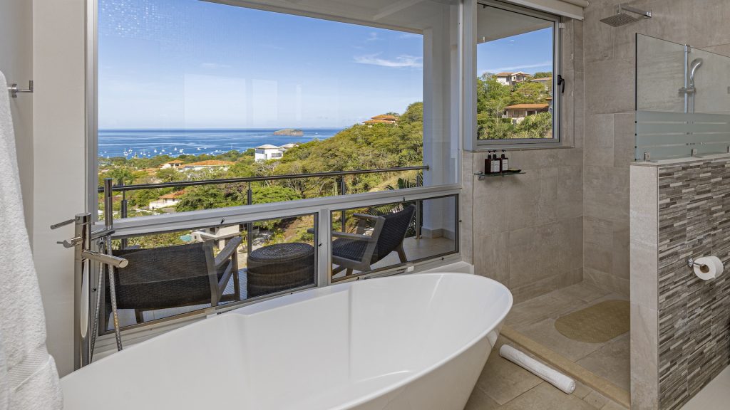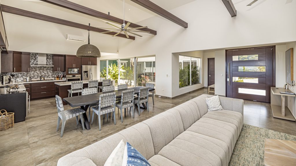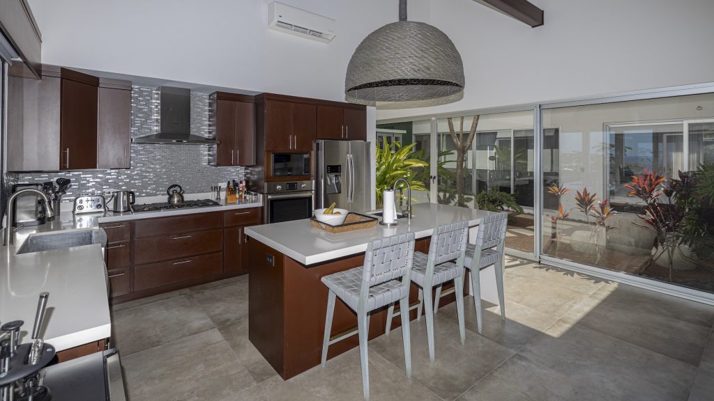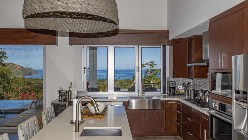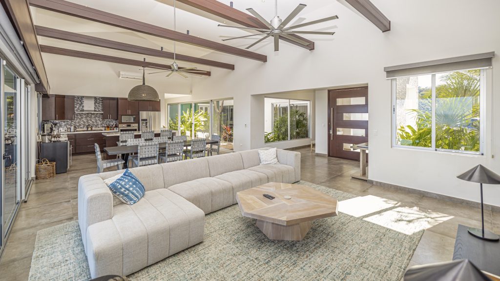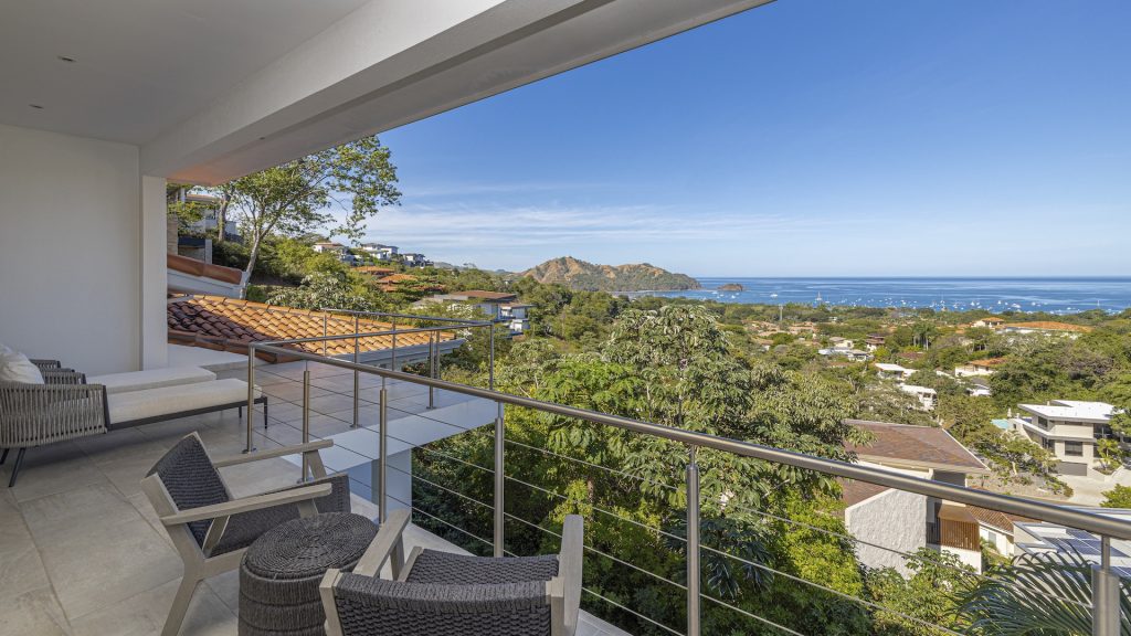 This impeccably built luxury residence offers 3,700 square feet of air-conditioned living space on a generous 1,834 square meter lot within the private, gated Pacifico community, boasting commanding ocean views over Playas del Coco and the Golfo Papagayo while remaining just minutes from the charm and conveniences of this vibrant beach town and nearby coastal destinations. Designed as an open-concept home for both refined living and effortless entertaining, the main living, dining, and kitchen areas flow seamlessly together and open directly onto the expansive pool terrace, creating a perfect indoor–outdoor lifestyle. The home features an infinity-edge pool, outdoor jacuzzi, sauna with full bath, and a lower ocean-view terrace, complemented by multiple shaded terraces with lounge areas, separate dining areas both indoors and outdoors on the shaded terrace, an outdoor grill, and a wood-fired pizza oven. A large internal Zen garden provides a tranquil architectural focal point, beautifully connecting the great room with the air-conditioned media and game room, which also offers the flexibility to be converted into an additional bedroom. The property includes a fully equipped main kitchen plus an additional full kitchen, an expansive second-floor primary suite with stunning views, and three additional en-suite bedrooms on the main level, all generously sized to accommodate king beds. Additional highlights include a Sonos sound system, attached two-car garage, high-quality construction and finishes throughout, full air conditioning, and a triple filtration and water softening system delivering bottled-water quality from every tap. Ideally located just minutes from multiple beach towns and a full array of services including shopping, dining, nightlife, watersports, medical and dental care, and only 25 minutes from Guanacaste International Airport (LIR), owners also enjoy access to Pacifico’s exceptional amenities and the exclusive Pacifico Beach Club with direct access to the sandy beaches of Playas del Coco, oceanfront dining, and resort-style pools and lounge areas, completing a truly elevated coastal lifestyle.