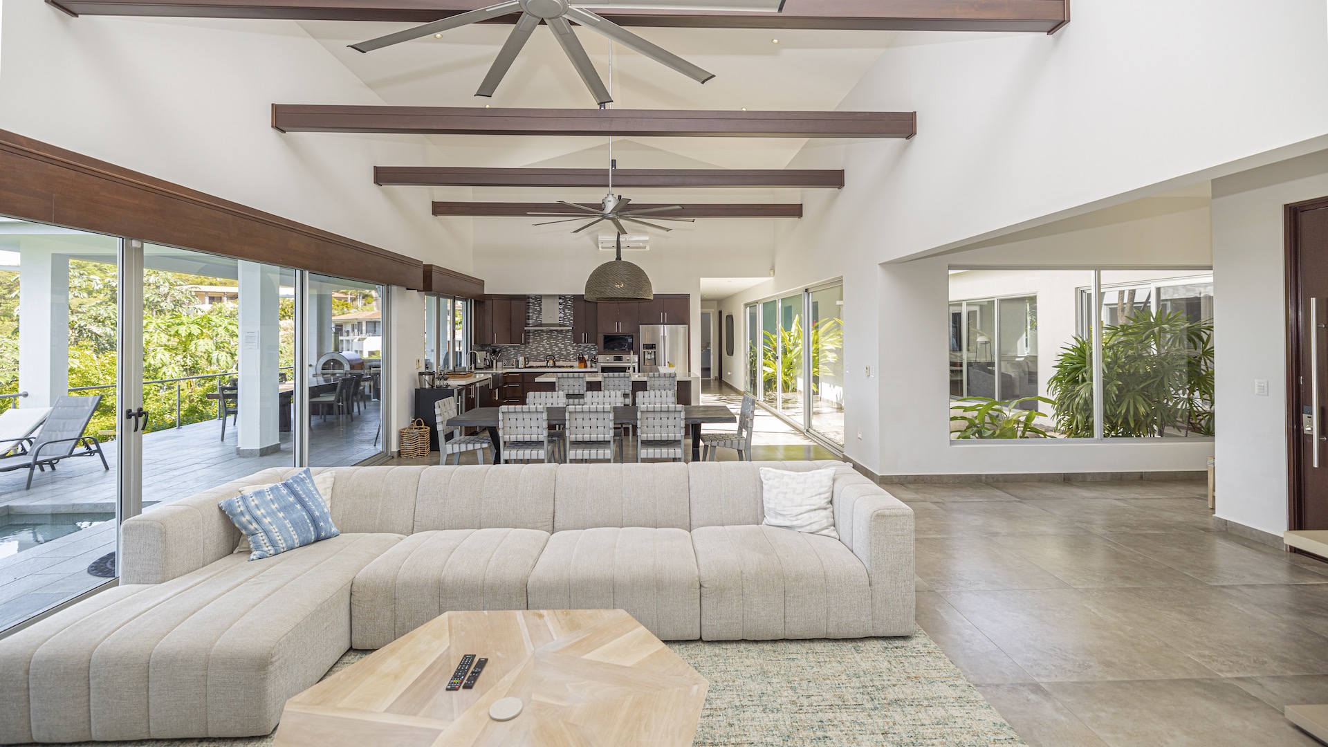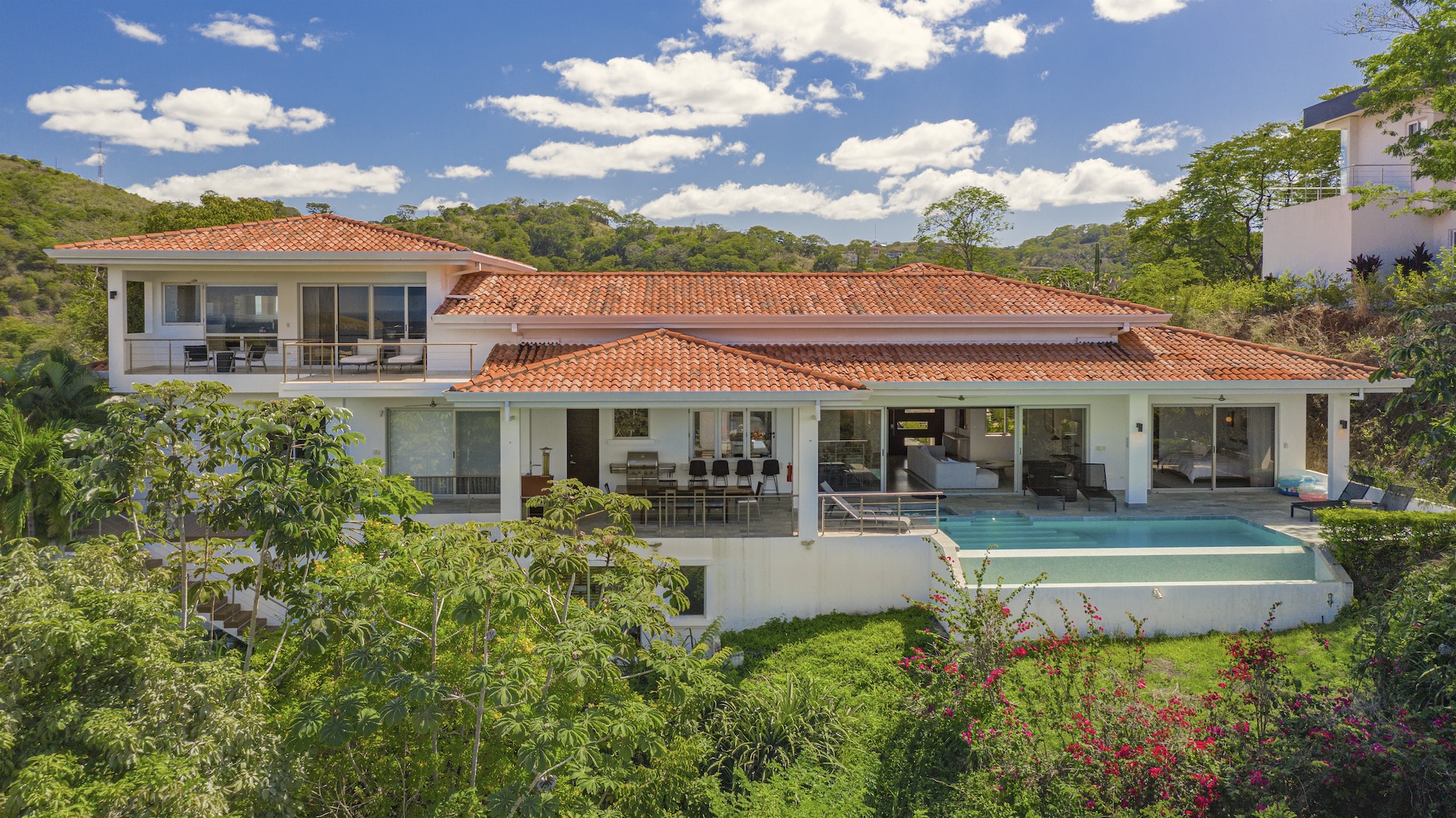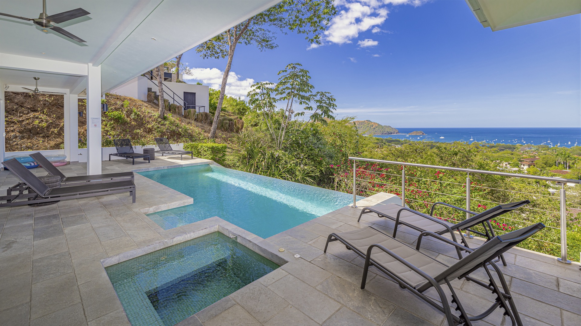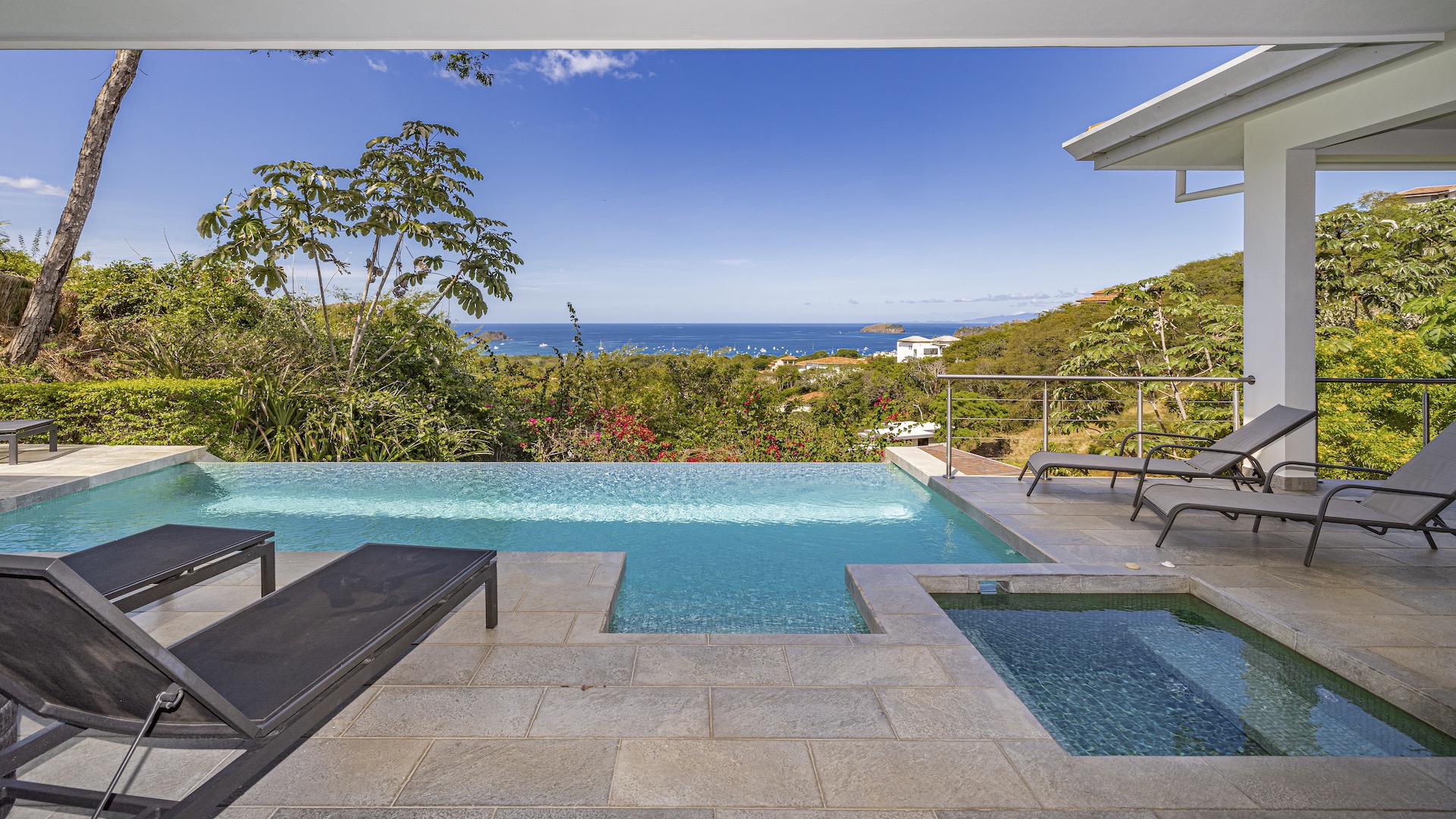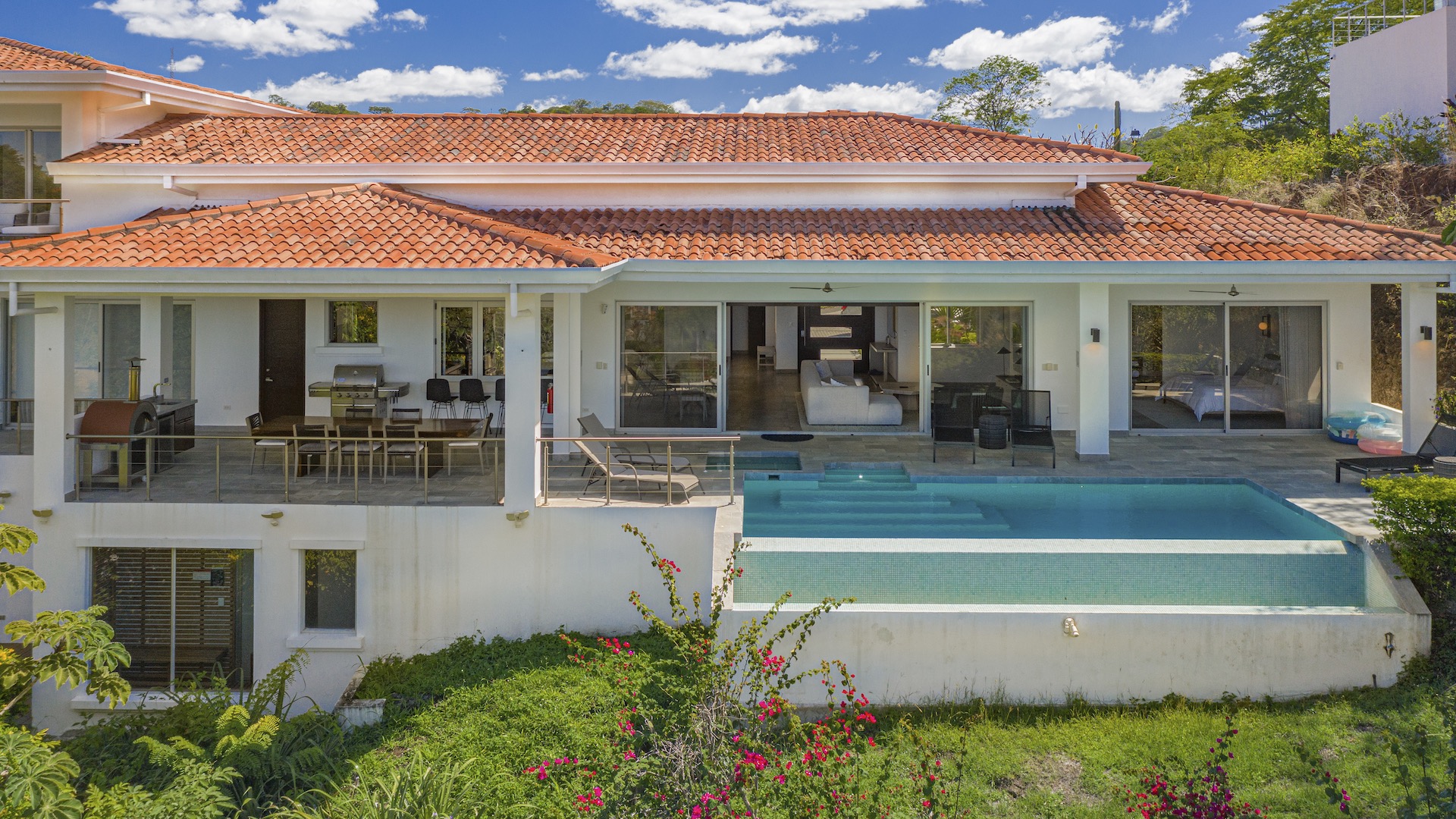 This impeccably built luxury residence offers 3,700 square feet of air-conditioned living space on a generous 1,834 square meter lot within the private, gated Pacifico community, boasting commanding ocean views over Playas del Coco and the Golfo Papagayo while remaining just minutes from the charm and conveniences of this vibrant beach town and nearby coastal destinations. Designed as an open-concept home for both refined living and effortless entertaining, the main living, dining, and kitchen areas flow seamlessly together and open directly onto the expansive pool terrace, creating a perfect indoor–outdoor lifestyle. The home features an infinity-edge pool, outdoor jacuzzi, sauna with full bath, and a lower ocean-view terrace, complemented by multiple shaded terraces with lounge areas, separate dining areas both indoors and outdoors on the shaded terrace, an outdoor grill, and a wood-fired pizza oven. A large internal Zen garden provides a tranquil architectural focal point, beautifully connecting the great room with the air-conditioned media and game room, which also offers the flexibility to be converted into an additional bedroom. The property includes a fully equipped main kitchen plus an additional full kitchen, an expansive second-floor primary suite with stunning views, and three additional en-suite bedrooms on the main level, all generously sized to accommodate king beds. Additional highlights include a Sonos sound system, attached two-car garage, high-quality construction and finishes throughout, full air conditioning, and a triple filtration and water softening system delivering bottled-water quality from every tap. Ideally located just minutes from multiple beach towns and a full array of services including shopping, dining, nightlife, watersports, medical and dental care, and only 25 minutes from Guanacaste International Airport (LIR), owners also enjoy access to Pacifico’s exceptional amenities and the exclusive Pacifico Beach Club with direct access to the sandy beaches of Playas del Coco, oceanfront dining, and resort-style pools and lounge areas, completing a truly elevated coastal lifestyle.