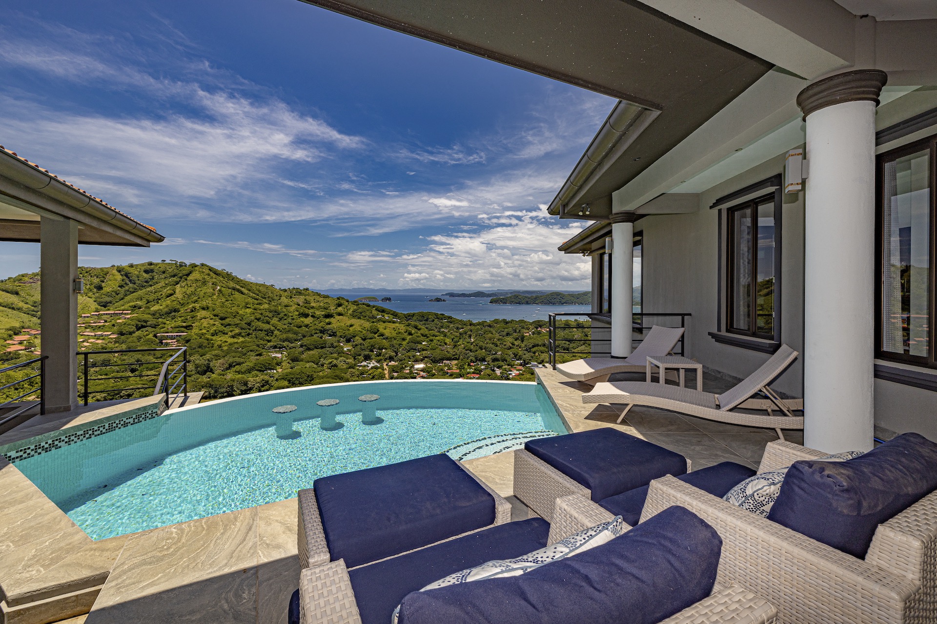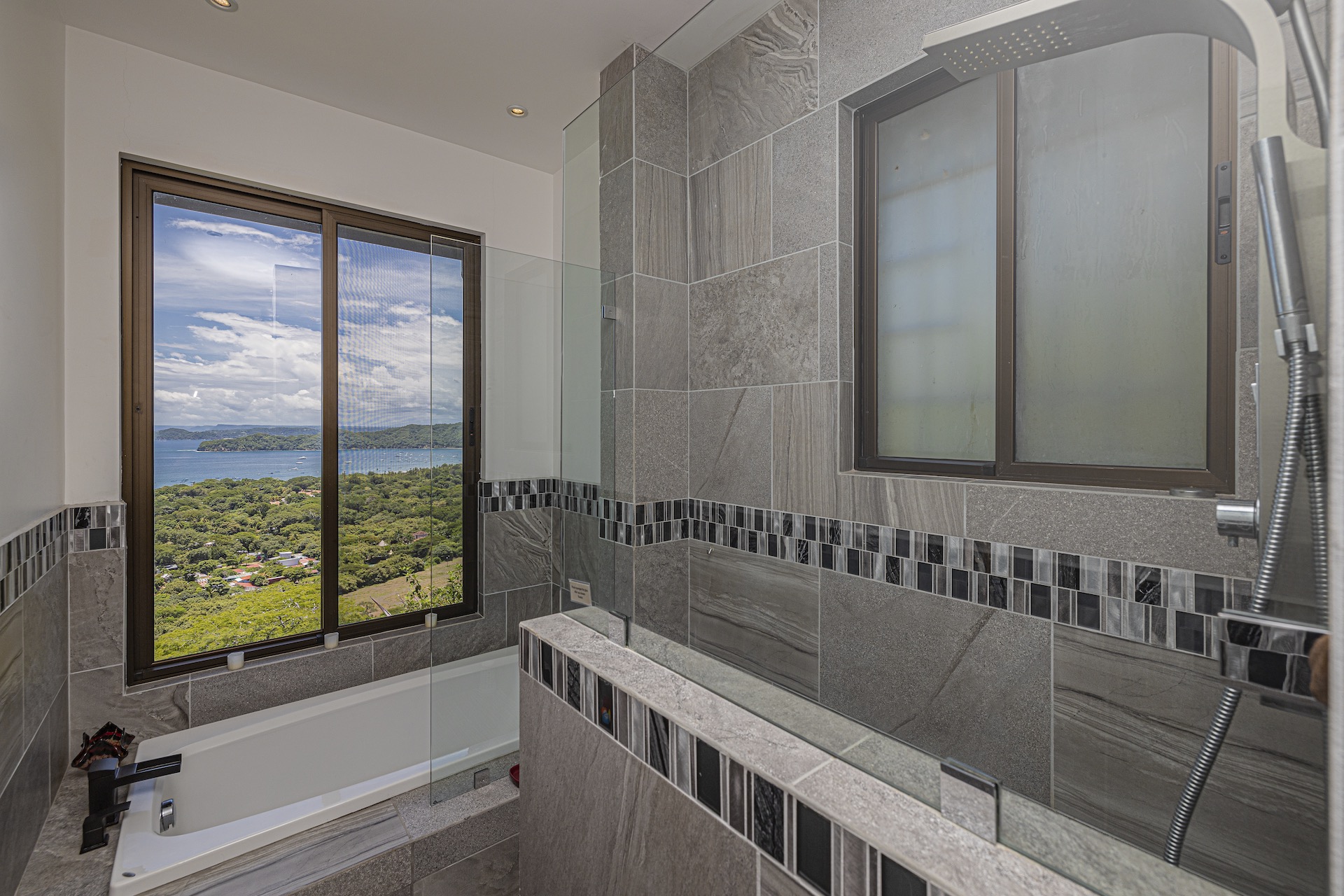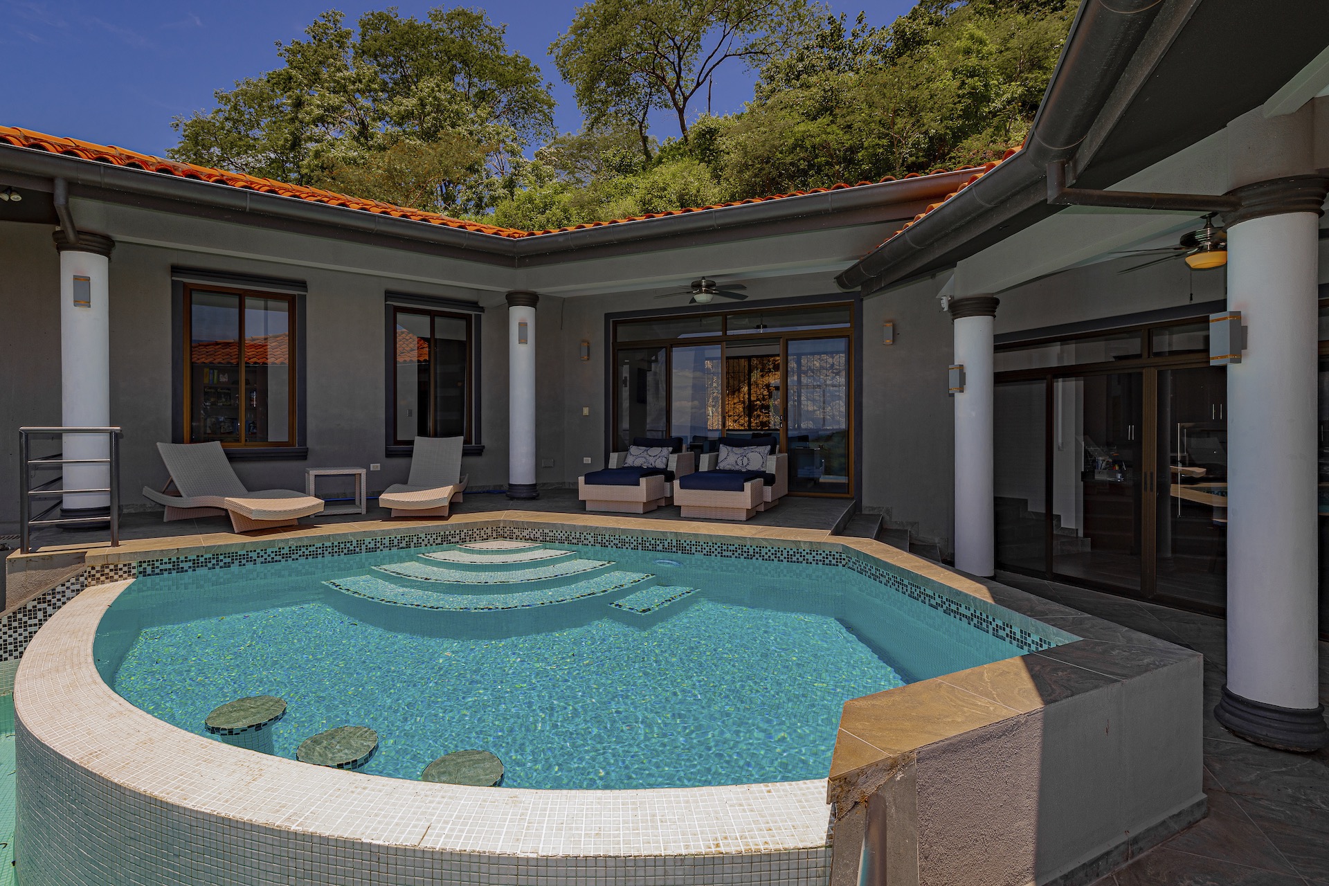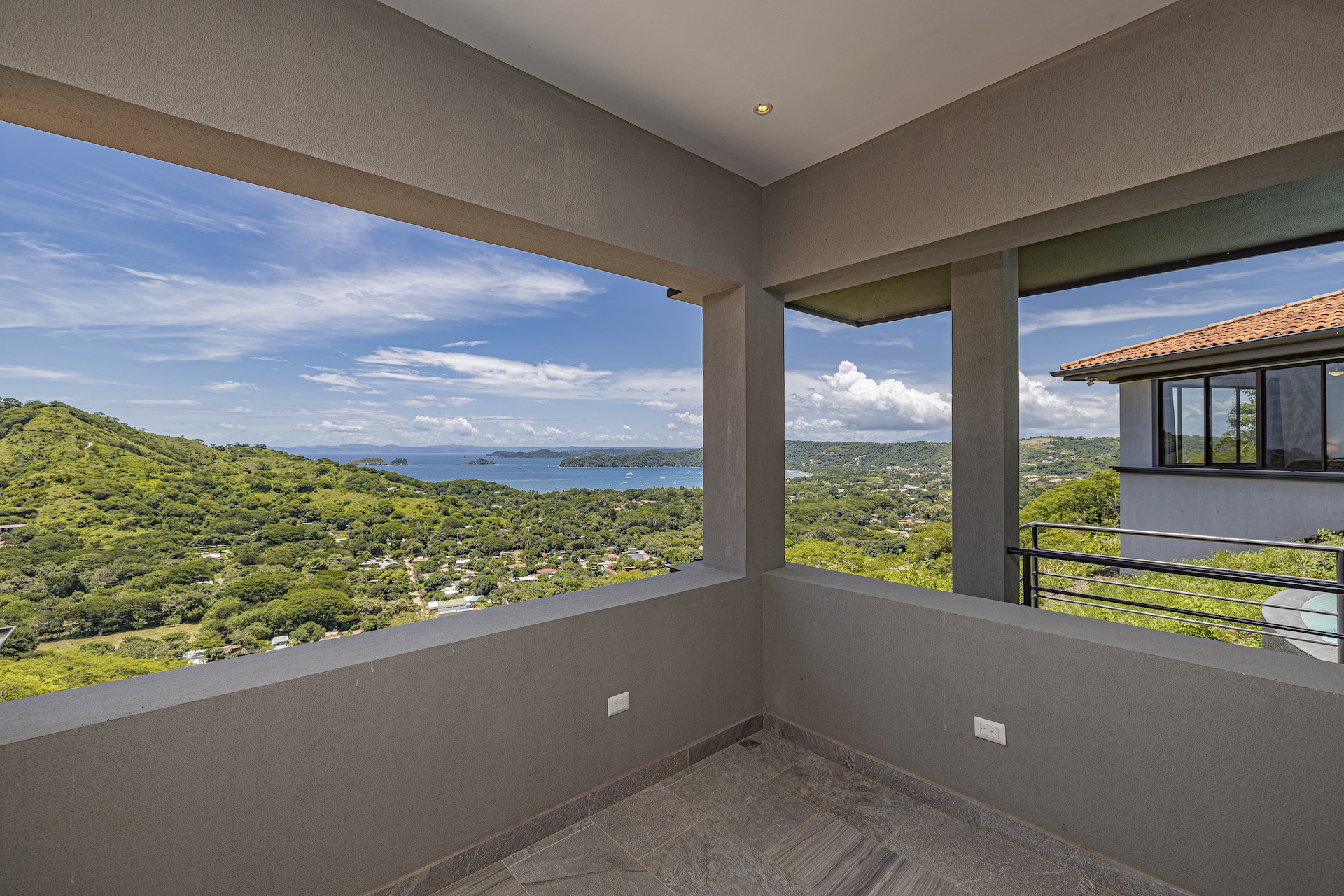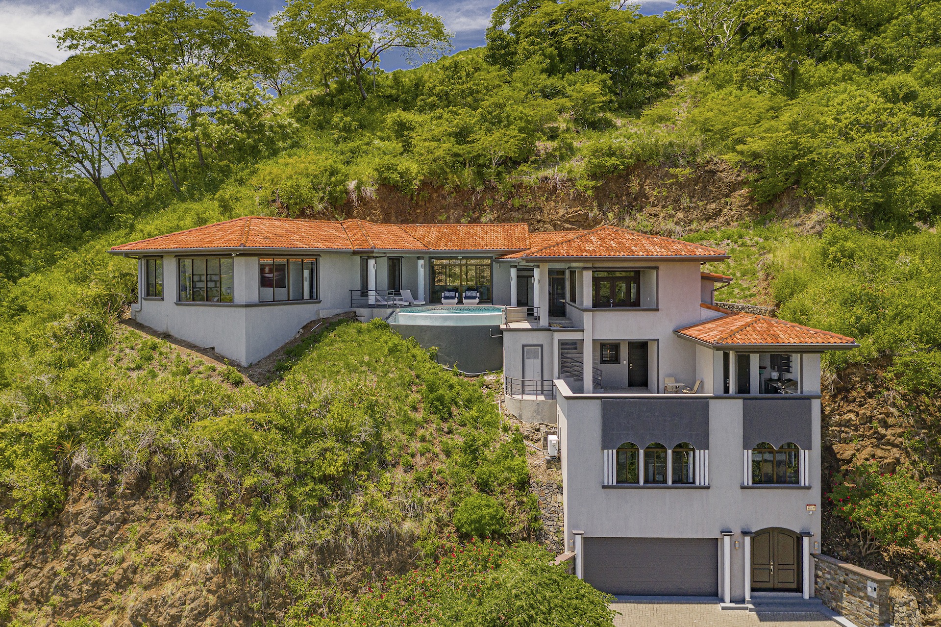 Stunning Modern Ocean View Home with Main Home and Separate Efficiency Apartment. This extremely private 4 bedroom, 3.5 bathroom luxury ocean view villa enjoys 2,835 SF of airconditioned space and has a total of 3,442 SF including the attached 2 car garage with an additional 1,150 SF of outside living space. The upper level of the home houses the vaulted ceiling living room and dining room along with the gourmet style kitchen all with direct access to the ocean view terrace and infinity edge pool overlooking the Bay of Coco, the Peninsula Papagayo and beyond. Also on the upper level is the master suite with sweeping ocean and valley views that features an ocean view tub, separate shower and walk in closet. There are 2 additional bedrooms that share an expanded jack and jill style bathroom along with a powder room off the living room. The 2 car attached garage is on the ground level where the brand new elevator is located that leads to all the upper floors. Take the elevator or the internal staircase to all the upper levels. The efficiency apartment is on the second level with a small living room, full kitchen, bedroom area and bathroom with great ocean views from every corner. The third floor features an ample BBQ and wet bar area and large ocean view terrace and stairs leading to the upper level. The laundry room and full service quarters complete with bathroom are just off the terrace. This modern home is built to North American standards and features high end porcelain floor tile inside and out, granite counter tops, custom wood doors and cabinetry, stainless steel kitchen appliances and a turnkey furniture and finishes package. This house is perfect for a luxury vacation with your family and serve as a high-end vacation rental villa while you’re away. Located inside exclusive Coco Bay Estates have full access to the clubhouse, huge members-only pool, gym, and tennis courts. Within minutes you can drive into downtown Playas del Coco to find a full range of shopping, restaurants, nightlife, healthcare and services. Just 25 minutes from Guanacaste International Airport (LIR). Move into this stunning Villa today.