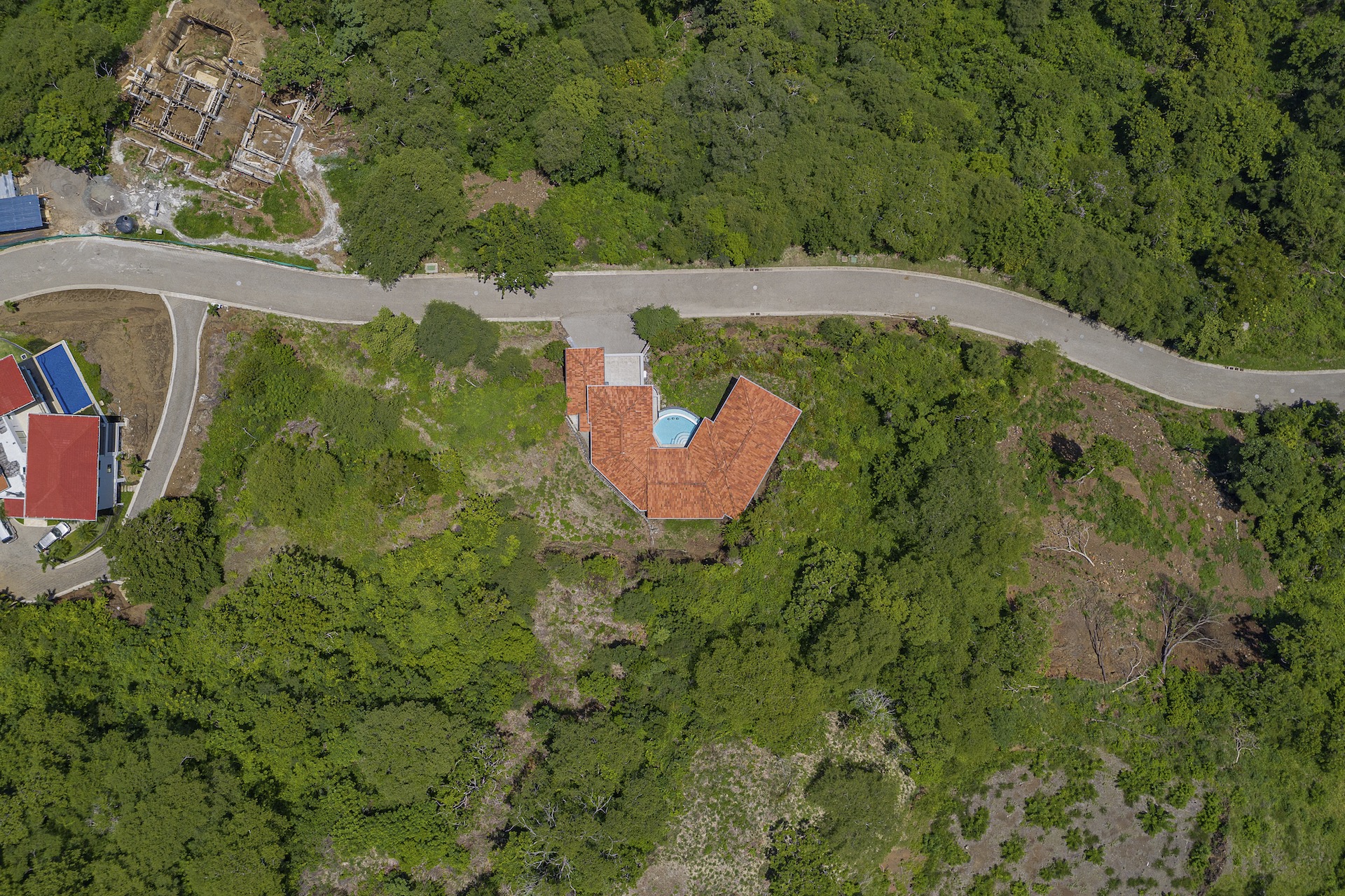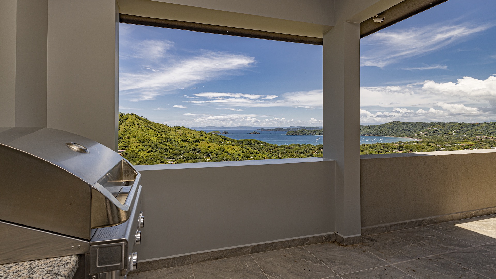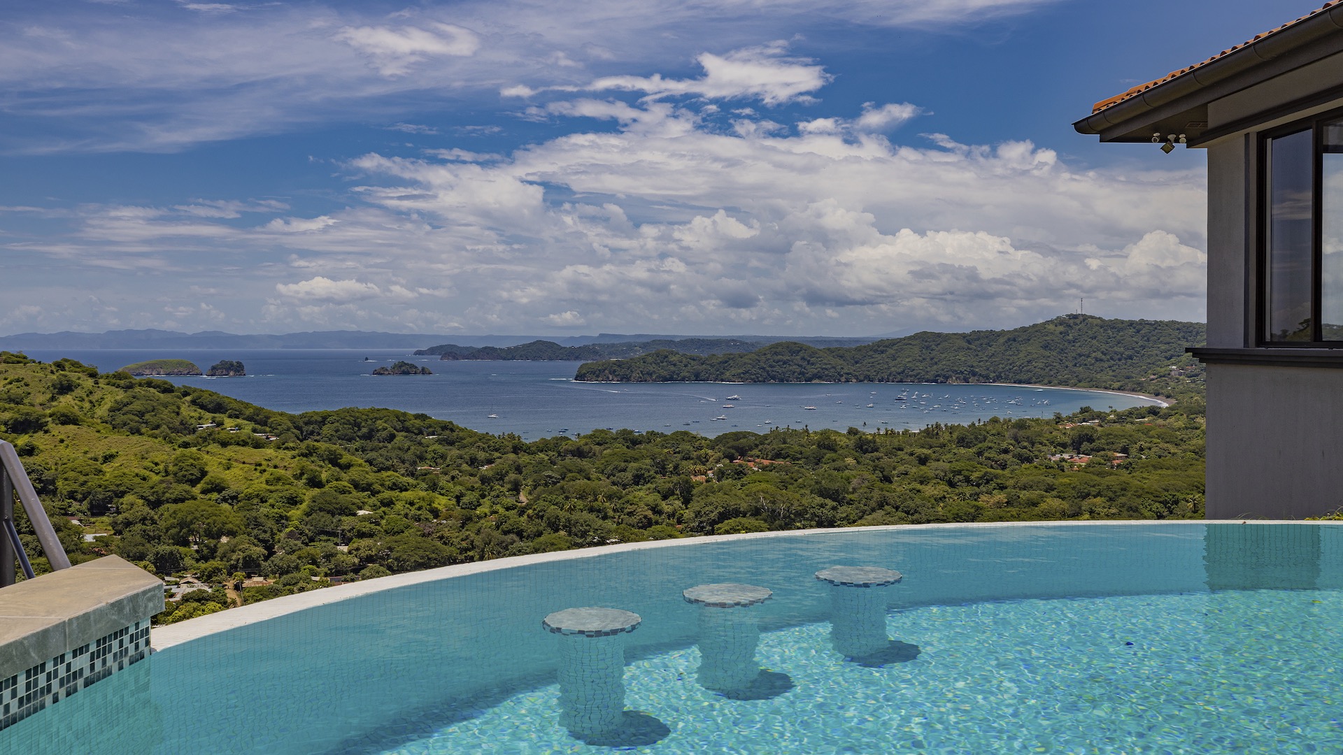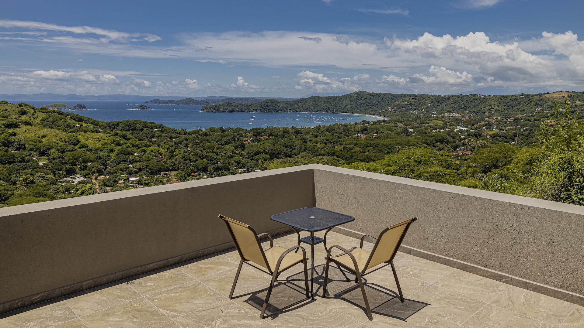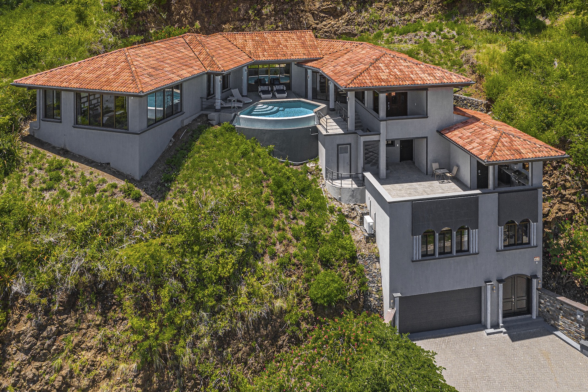 Stunning Modern Ocean View Home with Main Home and Separate Efficiency Apartment. This extremely private 4 bedroom, 3.5 bathroom luxury ocean view villa enjoys 2,835 SF of airconditioned space and has a total of 3,442 SF including the attached 2 car garage with an additional 1,150 SF of outside living space. The upper level of the home houses the vaulted ceiling living room and dining room along with the gourmet style kitchen all with direct access to the ocean view terrace and infinity edge pool overlooking the Bay of Coco, the Peninsula Papagayo and beyond. Also on the upper level is the master suite with sweeping ocean and valley views that features an ocean view tub, separate shower and walk in closet. There are 2 additional bedrooms that share an expanded jack and jill style bathroom along with a powder room off the living room. The 2 car attached garage is on the ground level where the brand new elevator is located that leads to all the upper floors. Take the elevator or the internal staircase to all the upper levels. The efficiency apartment is on the second level with a small living room, full kitchen, bedroom area and bathroom with great ocean views from every corner. The third floor features an ample BBQ and wet bar area and large ocean view terrace and stairs leading to the upper level. The laundry room and full service quarters complete with bathroom are just off the terrace. This modern home is built to North American standards and features high end porcelain floor tile inside and out, granite counter tops, custom wood doors and cabinetry, stainless steel kitchen appliances and a turnkey furniture and finishes package. This house is perfect for a luxury vacation with your family and serve as a high-end vacation rental villa while you’re away. Located inside exclusive Coco Bay Estates have full access to the clubhouse, huge members-only pool, gym, and tennis courts. Within minutes you can drive into downtown Playas del Coco to find a full range of shopping, restaurants, nightlife, healthcare and services. Just 25 minutes from Guanacaste International Airport (LIR). Move into this stunning Villa today.