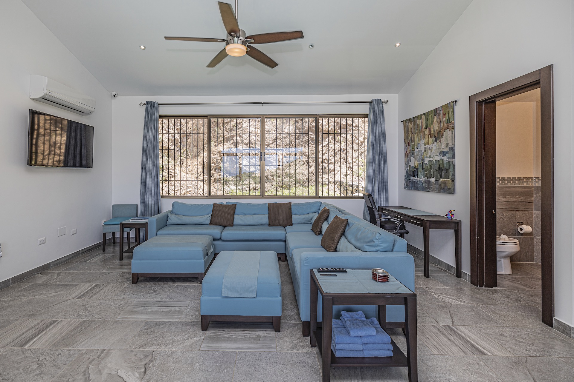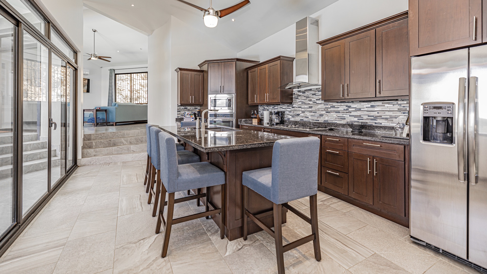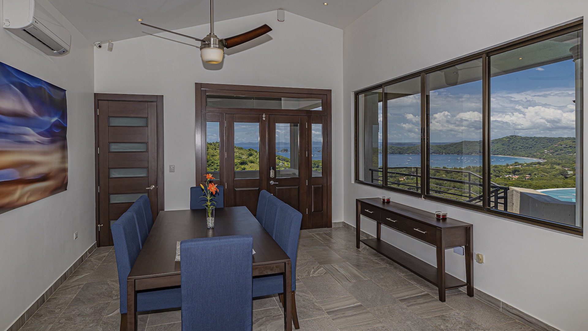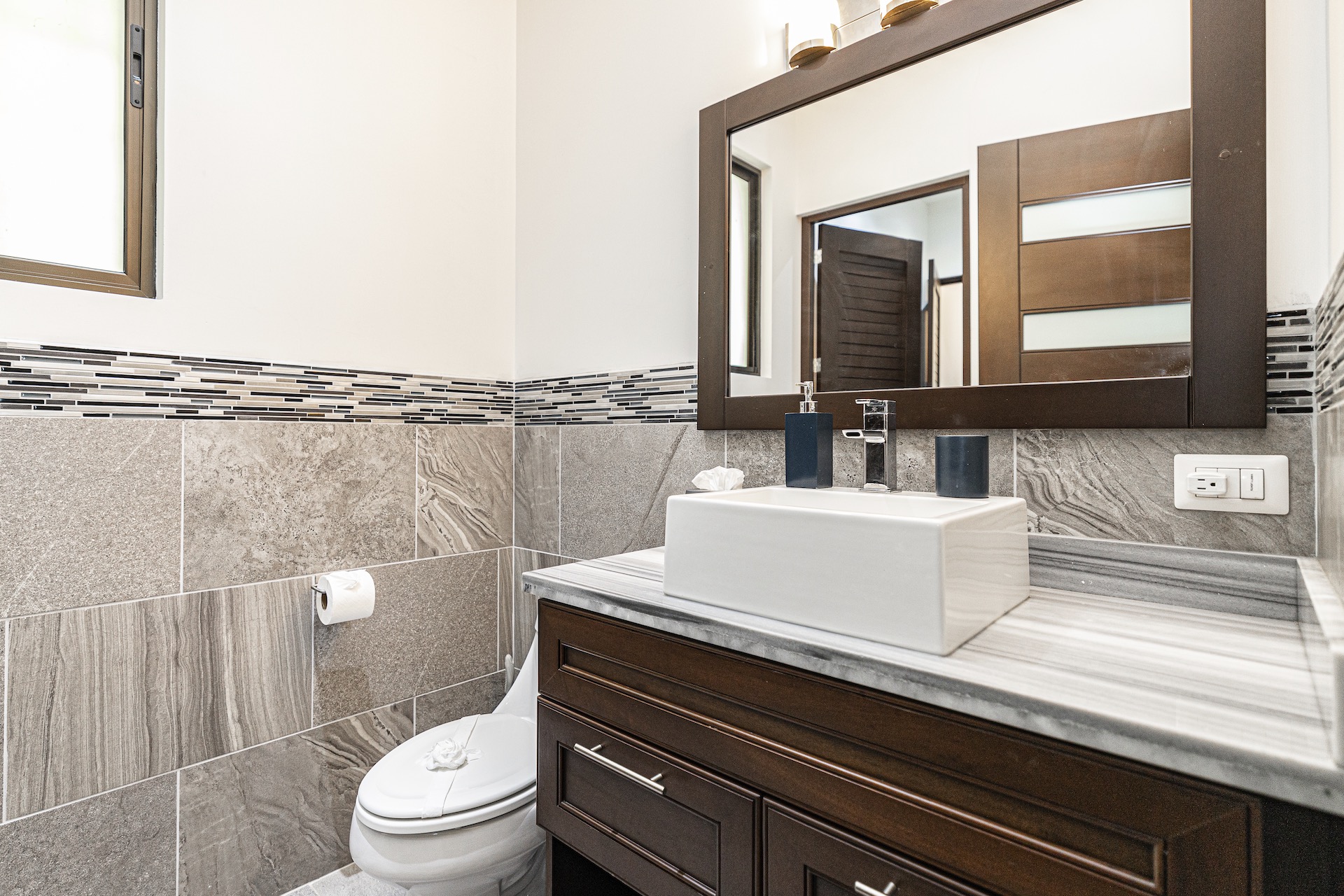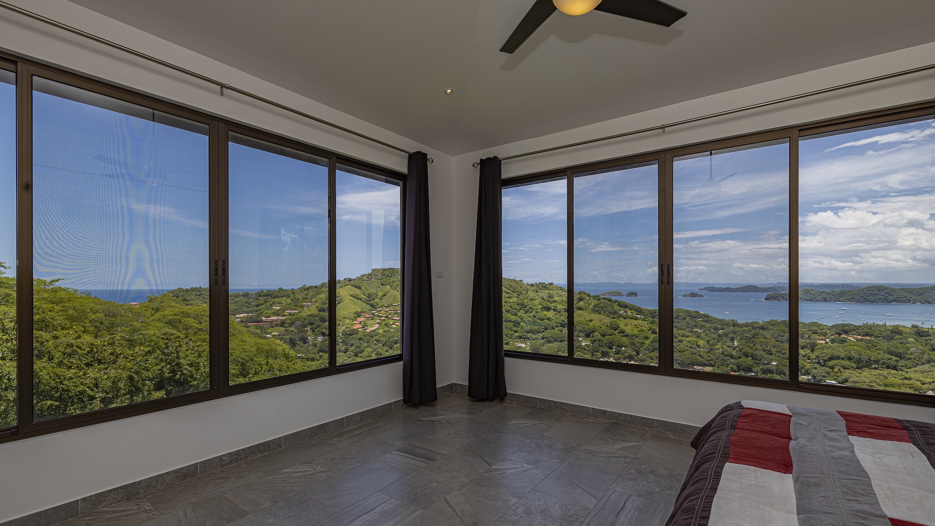 Stunning Modern Ocean View Home with Main Home and Separate Efficiency Apartment. This extremely private 4 bedroom, 3.5 bathroom luxury ocean view villa enjoys 2,835 SF of airconditioned space and has a total of 3,442 SF including the attached 2 car garage with an additional 1,150 SF of outside living space. The upper level of the home houses the vaulted ceiling living room and dining room along with the gourmet style kitchen all with direct access to the ocean view terrace and infinity edge pool overlooking the Bay of Coco, the Peninsula Papagayo and beyond. Also on the upper level is the master suite with sweeping ocean and valley views that features an ocean view tub, separate shower and walk in closet. There are 2 additional bedrooms that share an expanded jack and jill style bathroom along with a powder room off the living room. The 2 car attached garage is on the ground level where the brand new elevator is located that leads to all the upper floors. Take the elevator or the internal staircase to all the upper levels. The efficiency apartment is on the second level with a small living room, full kitchen, bedroom area and bathroom with great ocean views from every corner. The third floor features an ample BBQ and wet bar area and large ocean view terrace and stairs leading to the upper level. The laundry room and full service quarters complete with bathroom are just off the terrace. This modern home is built to North American standards and features high end porcelain floor tile inside and out, granite counter tops, custom wood doors and cabinetry, stainless steel kitchen appliances and a turnkey furniture and finishes package. This house is perfect for a luxury vacation with your family and serve as a high-end vacation rental villa while you’re away. Located inside exclusive Coco Bay Estates have full access to the clubhouse, huge members-only pool, gym, and tennis courts. Within minutes you can drive into downtown Playas del Coco to find a full range of shopping, restaurants, nightlife, healthcare and services. Just 25 minutes from Guanacaste International Airport (LIR). Move into this stunning Villa today.
