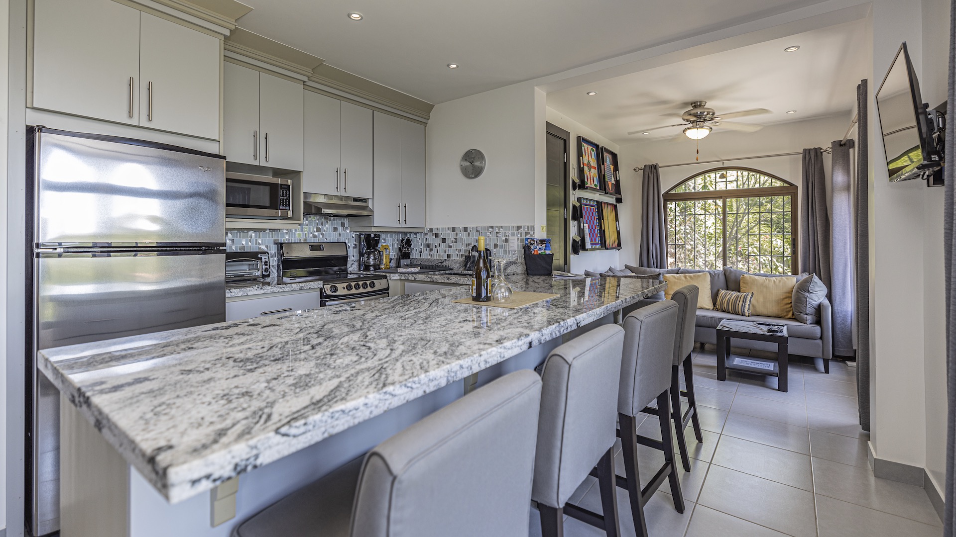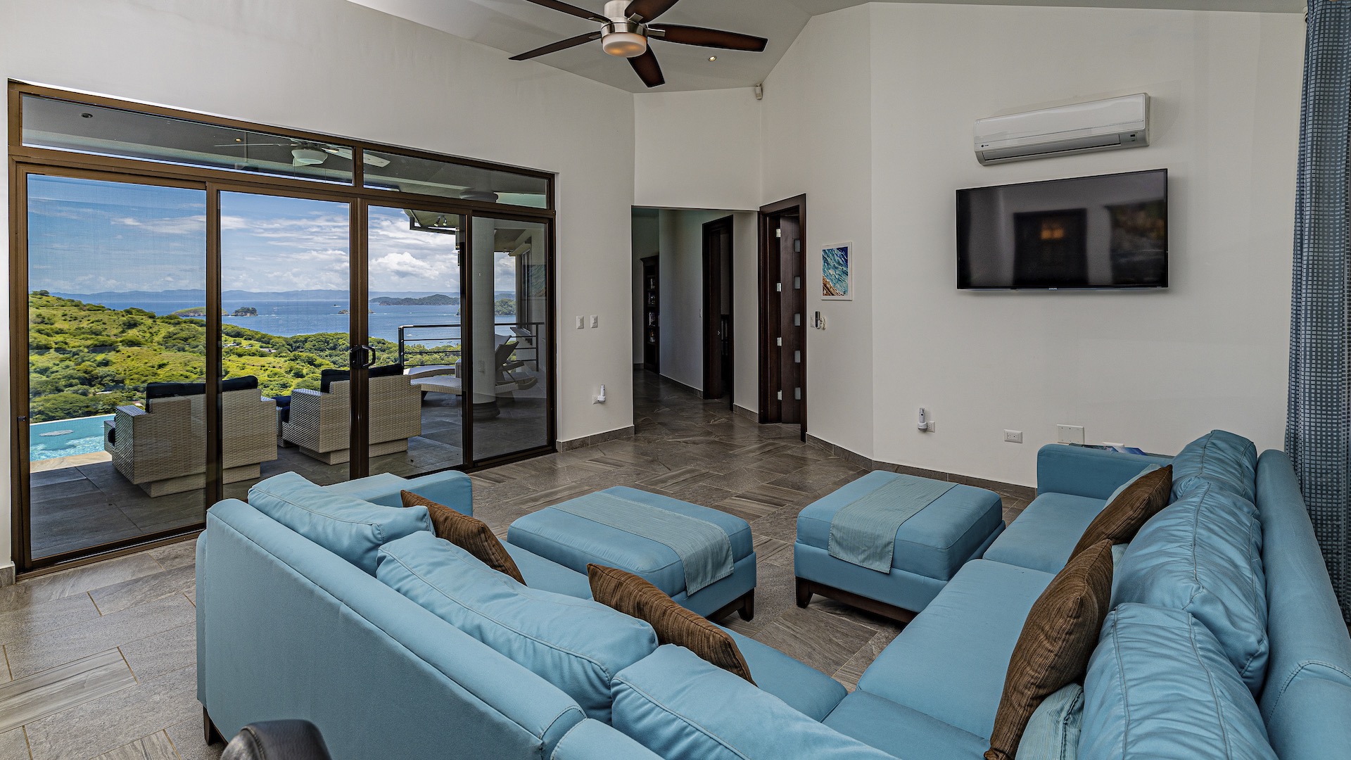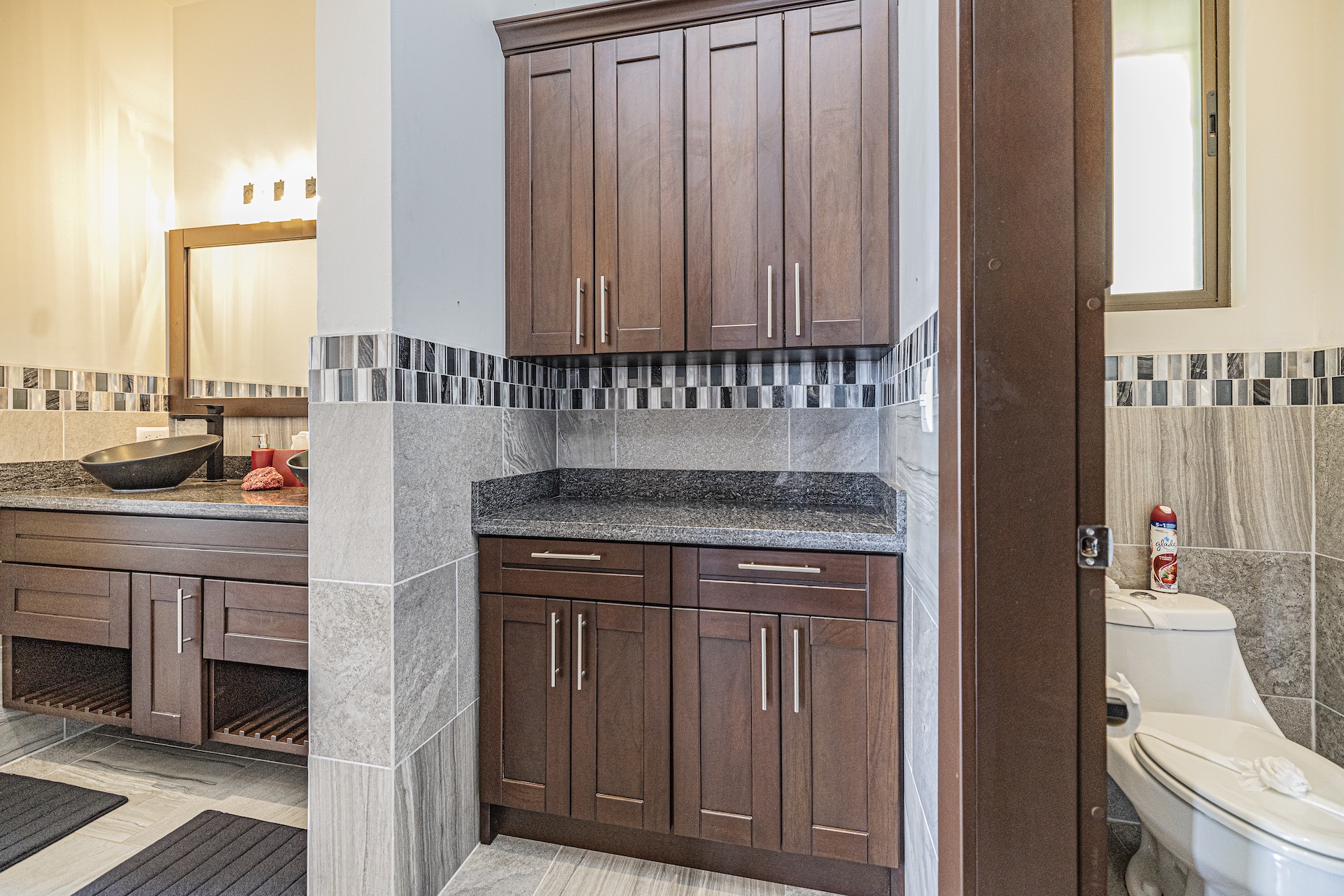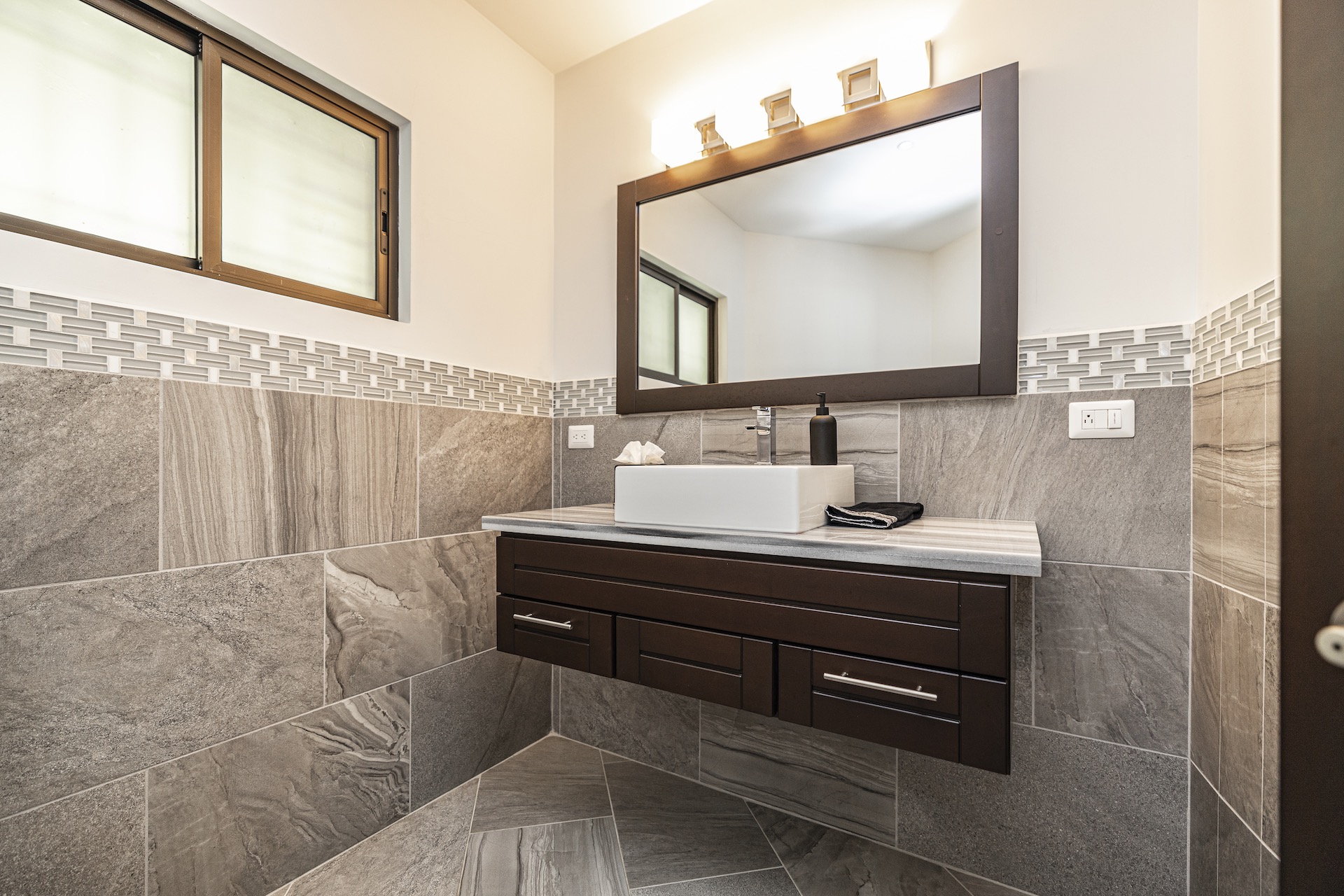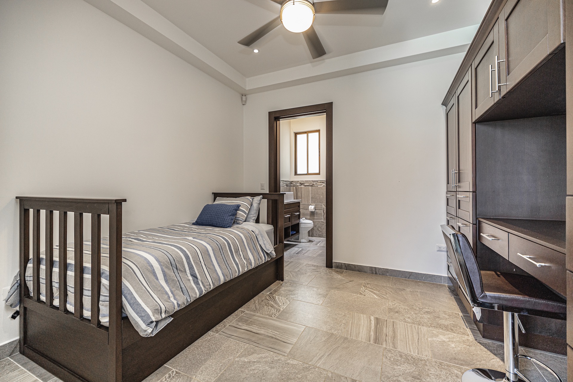 Stunning Modern Ocean View Home with Main Home and Separate Efficiency Apartment. This extremely private 4 bedroom, 3.5 bathroom luxury ocean view villa enjoys 2,835 SF of airconditioned space and has a total of 3,442 SF including the attached 2 car garage with an additional 1,150 SF of outside living space. The upper level of the home houses the vaulted ceiling living room and dining room along with the gourmet style kitchen all with direct access to the ocean view terrace and infinity edge pool overlooking the Bay of Coco, the Peninsula Papagayo and beyond. Also on the upper level is the master suite with sweeping ocean and valley views that features an ocean view tub, separate shower and walk in closet. There are 2 additional bedrooms that share an expanded jack and jill style bathroom along with a powder room off the living room. The 2 car attached garage is on the ground level where the brand new elevator is located that leads to all the upper floors. Take the elevator or the internal staircase to all the upper levels. The efficiency apartment is on the second level with a small living room, full kitchen, bedroom area and bathroom with great ocean views from every corner. The third floor features an ample BBQ and wet bar area and large ocean view terrace and stairs leading to the upper level. The laundry room and full service quarters complete with bathroom are just off the terrace. This modern home is built to North American standards and features high end porcelain floor tile inside and out, granite counter tops, custom wood doors and cabinetry, stainless steel kitchen appliances and a turnkey furniture and finishes package. This house is perfect for a luxury vacation with your family and serve as a high-end vacation rental villa while you’re away. Located inside exclusive Coco Bay Estates have full access to the clubhouse, huge members-only pool, gym, and tennis courts. Within minutes you can drive into downtown Playas del Coco to find a full range of shopping, restaurants, nightlife, healthcare and services. Just 25 minutes from Guanacaste International Airport (LIR). Move into this stunning Villa today.