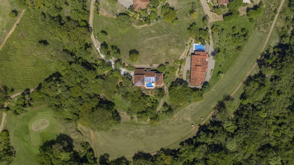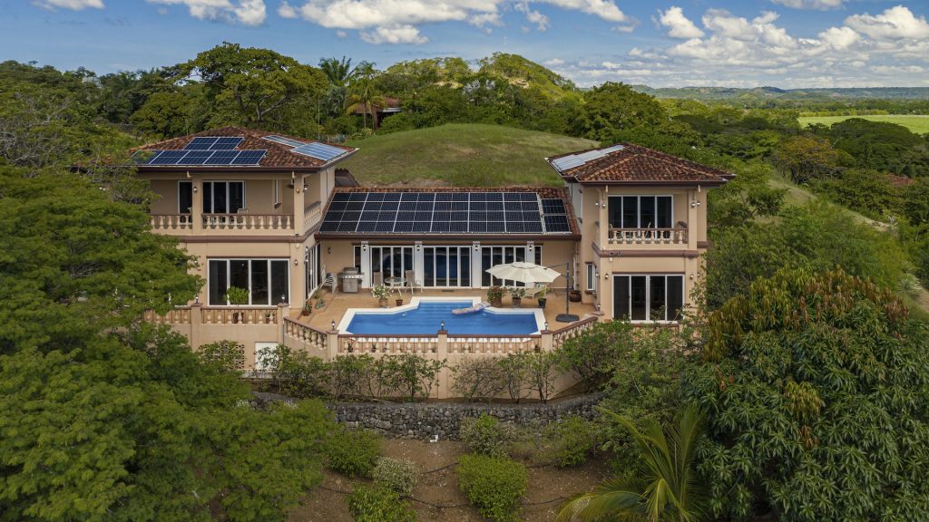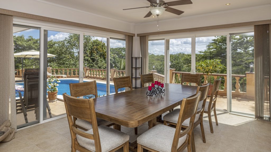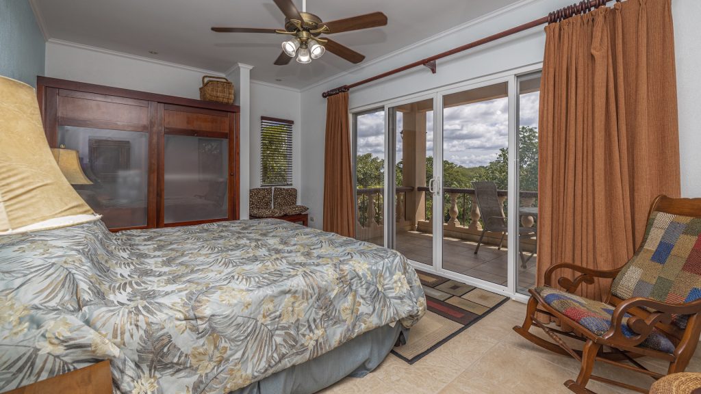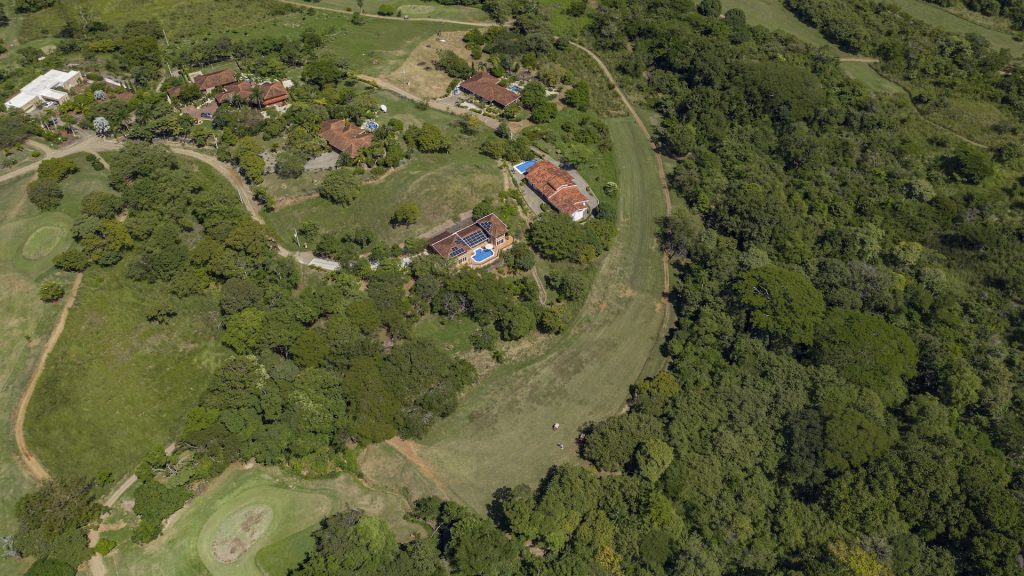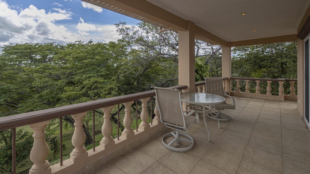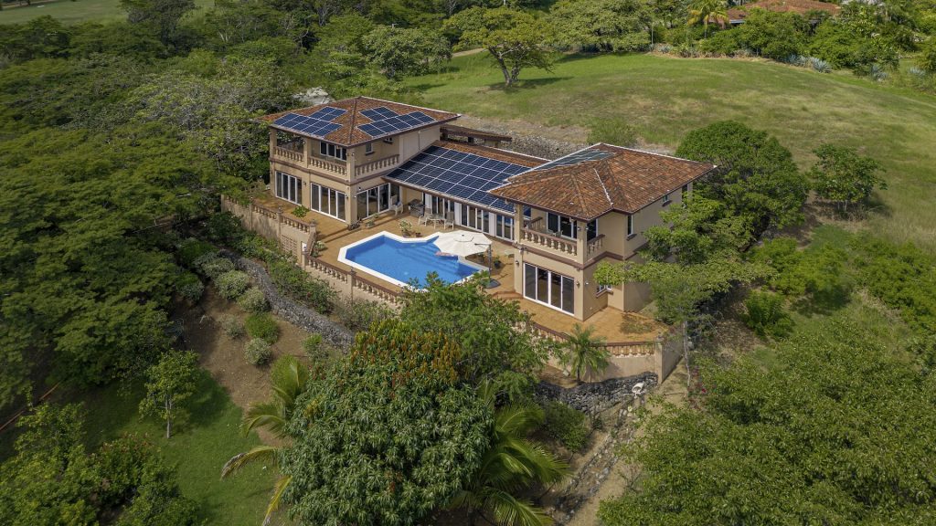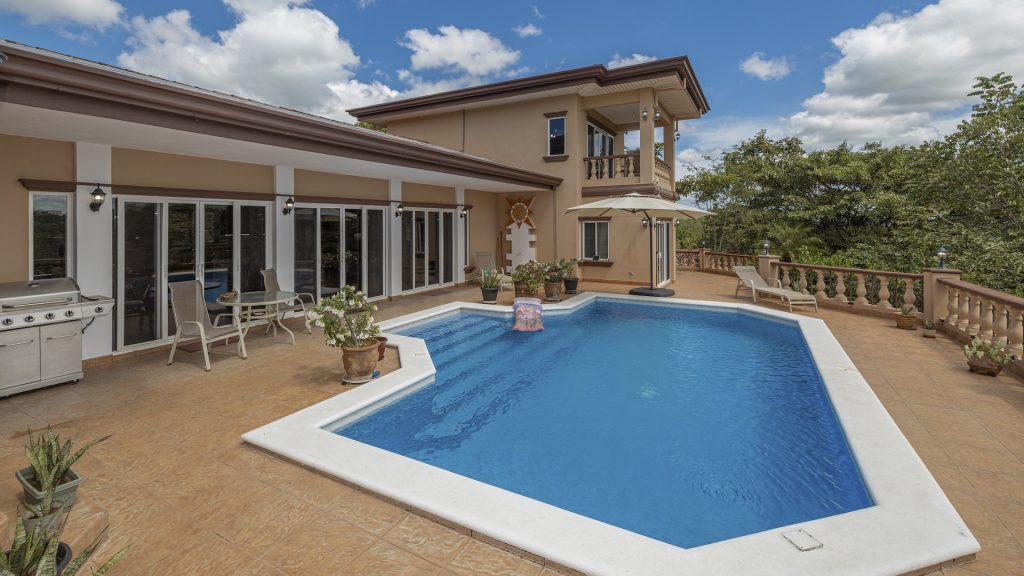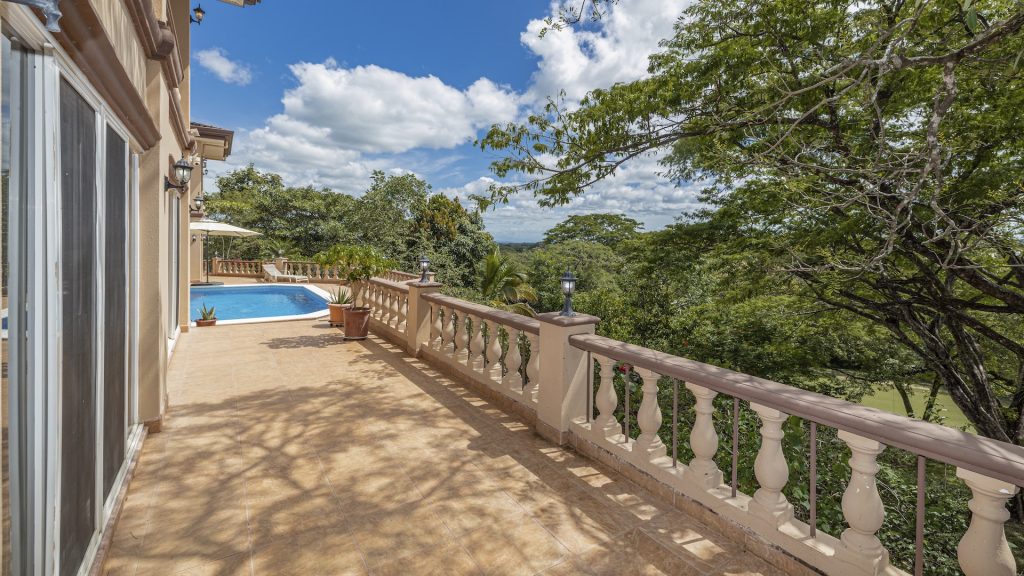 Set along the fairway of the Vista Ridge Golf Course, this tranquil estate home enjoys sweeping views over verdant valleys and distant mountain ranges. Perfectly positioned on an acre and a quarter (5,028 m²), the property is surrounded by mature native trees and lush tropical landscaping designed to attract the region’s vibrant flora and fauna, creating a truly peaceful natural sanctuary.  Step inside the vaulted-ceiling great room, where expansive living and kitchen areas capture stunning views across the large terrace and impressive pool. To one side, a dedicated dining room features floor-to-ceiling windows that frame the outdoor scenery and offer direct access to the pool terrace. The generous outdoor living area includes a covered BBQ pavilion, an outdoor shower, and an oversized terrace that wraps around the amply sized swimming pool—ideal for entertaining or simply relaxing in a serene setting.  Thoughtfully designed for comfort and privacy, the home features four master suites—two on each side of the great room, with one suite upstairs and one downstairs on each wing. All four bedrooms offer direct terrace access, while the two upstairs suites boast luxurious private covered terraces overlooking the forest canopy.  Additional features include Solar Panels, a laundry room, abundant storage, and a spacious attached carport. The home measures 3,000 sq. ft. of interior air-conditioned space and a total of 4,000 sq. ft. including all terraces. Quality finishes such as ceramic tile flooring, granite and marble countertops, and custom cabinetry and doors enhance the home throughout, and it is offered fully furnished for a seamless move-in experience.  Golf enthusiasts will appreciate being able to grab their clubs and step right onto the course from the backyard. Conveniently located just minutes from local restaurants, shopping, and services in Playas del Coco, the property is also just 25 minutes from the Guanacaste International Airport (LIR) and close to medical clinics and full-service hospitals.