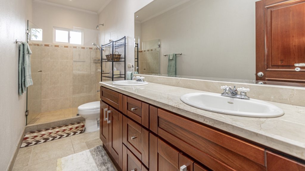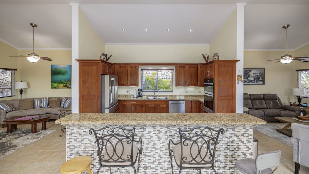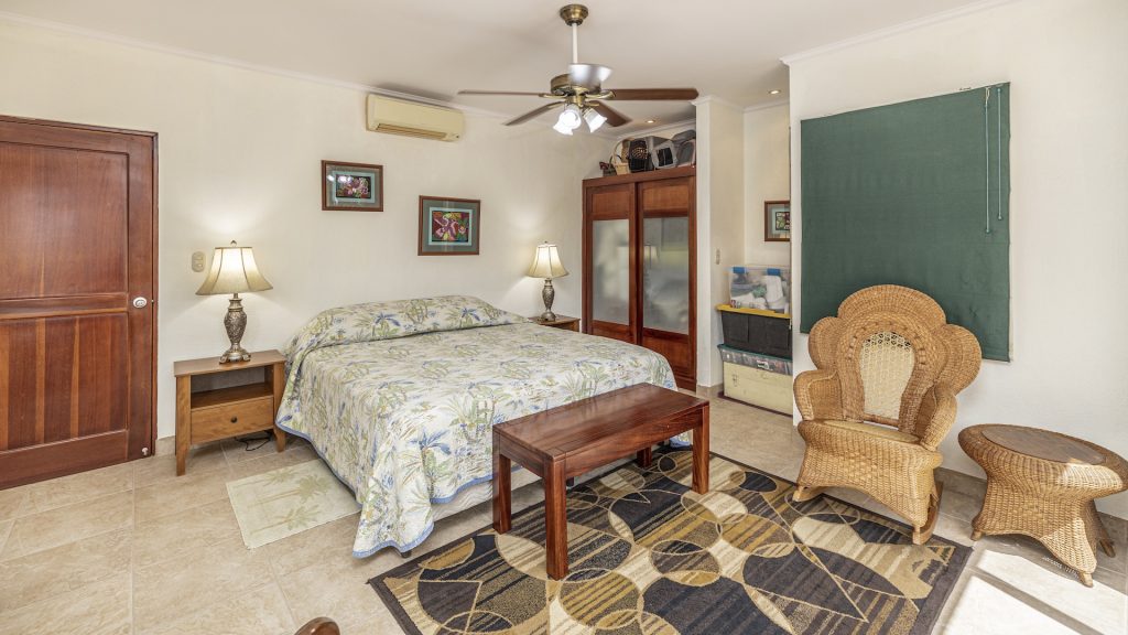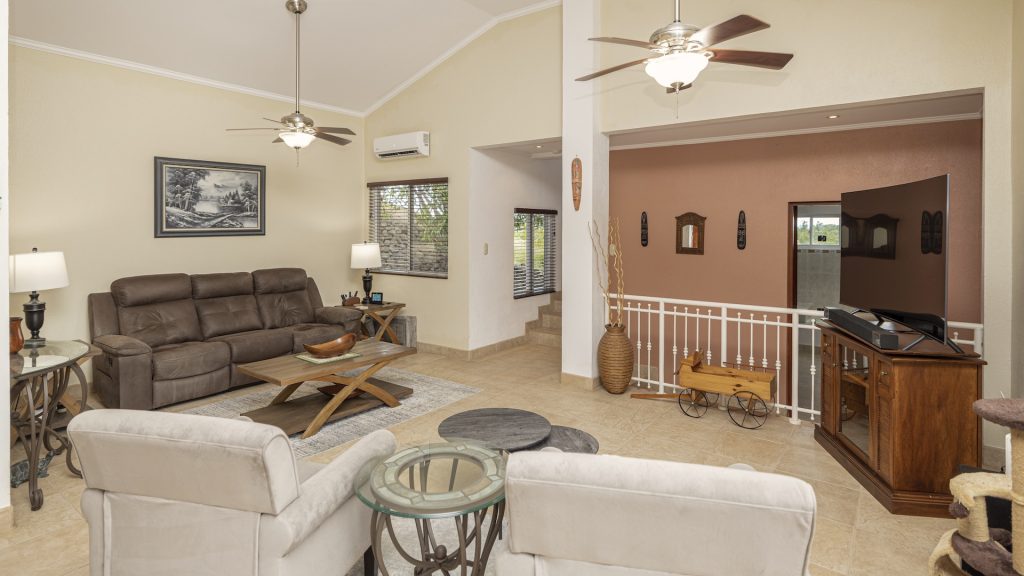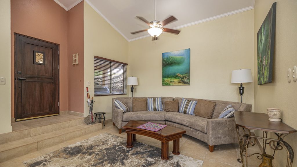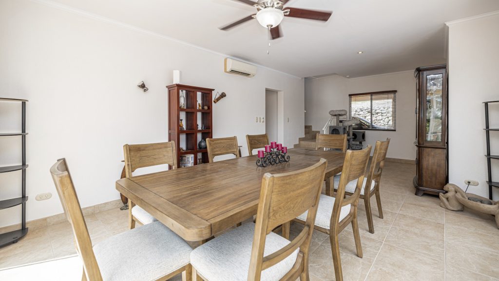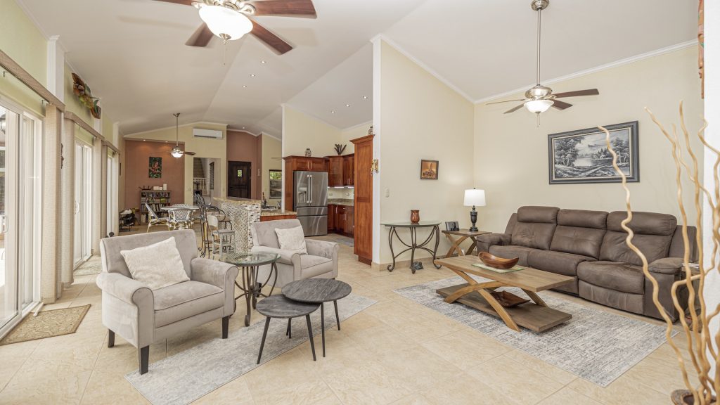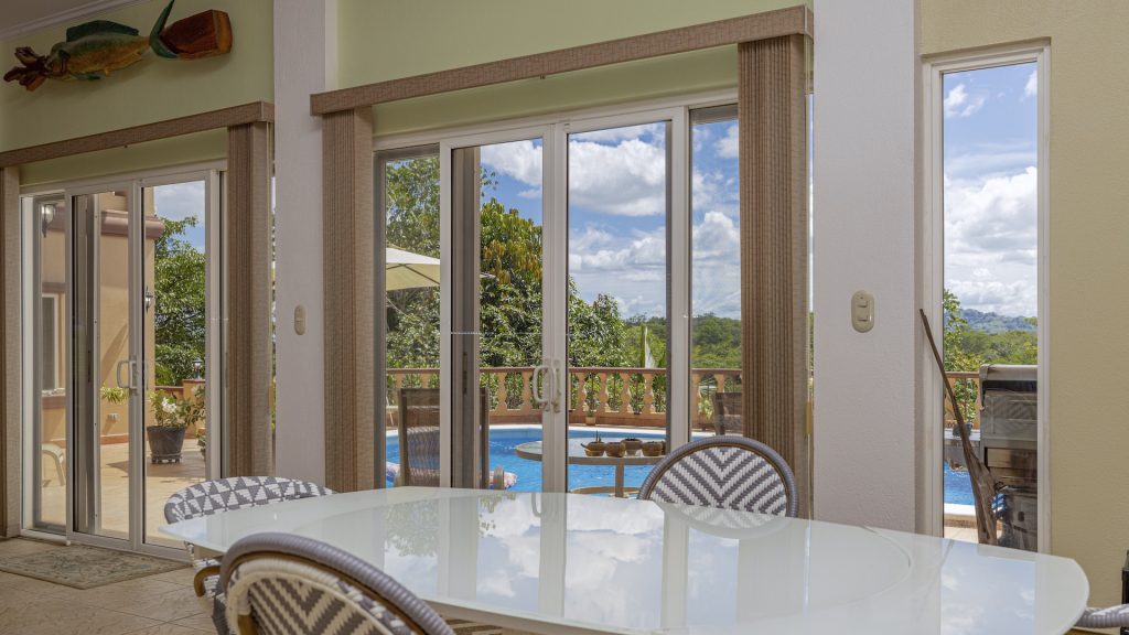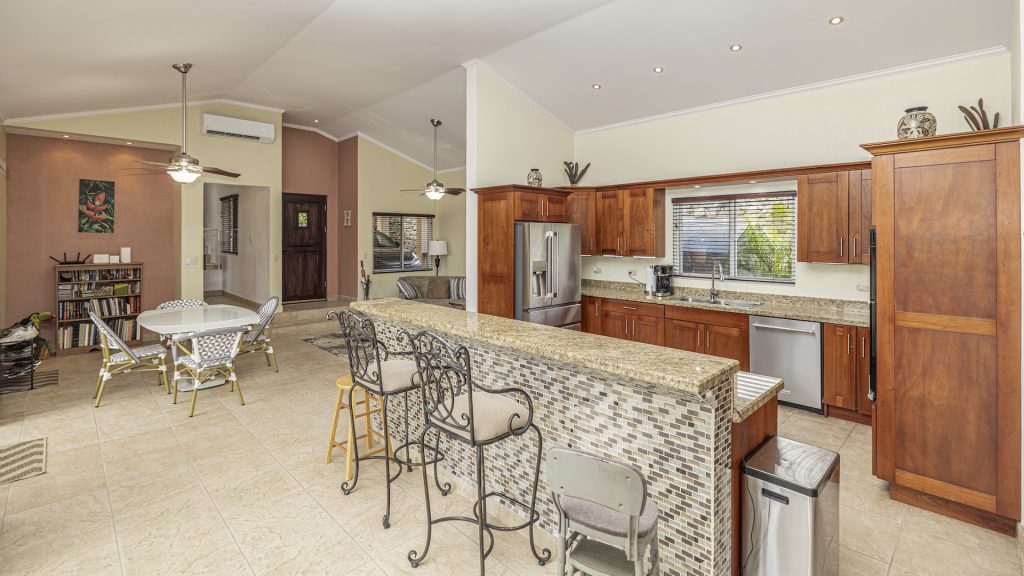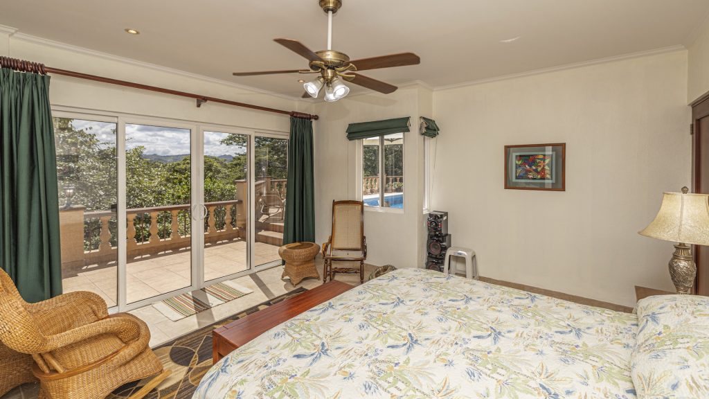 Set along the fairway of the Vista Ridge Golf Course, this tranquil estate home enjoys sweeping views over verdant valleys and distant mountain ranges. Perfectly positioned on an acre and a quarter (5,028 m²), the property is surrounded by mature native trees and lush tropical landscaping designed to attract the region’s vibrant flora and fauna, creating a truly peaceful natural sanctuary.  Step inside the vaulted-ceiling great room, where expansive living and kitchen areas capture stunning views across the large terrace and impressive pool. To one side, a dedicated dining room features floor-to-ceiling windows that frame the outdoor scenery and offer direct access to the pool terrace. The generous outdoor living area includes a covered BBQ pavilion, an outdoor shower, and an oversized terrace that wraps around the amply sized swimming pool—ideal for entertaining or simply relaxing in a serene setting.  Thoughtfully designed for comfort and privacy, the home features four master suites—two on each side of the great room, with one suite upstairs and one downstairs on each wing. All four bedrooms offer direct terrace access, while the two upstairs suites boast luxurious private covered terraces overlooking the forest canopy.  Additional features include Solar Panels, a laundry room, abundant storage, and a spacious attached carport. The home measures 3,000 sq. ft. of interior air-conditioned space and a total of 4,000 sq. ft. including all terraces. Quality finishes such as ceramic tile flooring, granite and marble countertops, and custom cabinetry and doors enhance the home throughout, and it is offered fully furnished for a seamless move-in experience.  Golf enthusiasts will appreciate being able to grab their clubs and step right onto the course from the backyard. Conveniently located just minutes from local restaurants, shopping, and services in Playas del Coco, the property is also just 25 minutes from the Guanacaste International Airport (LIR) and close to medical clinics and full-service hospitals.