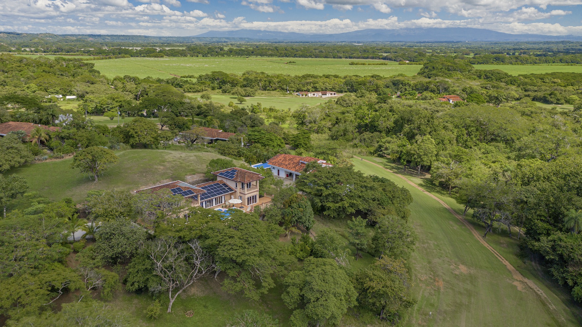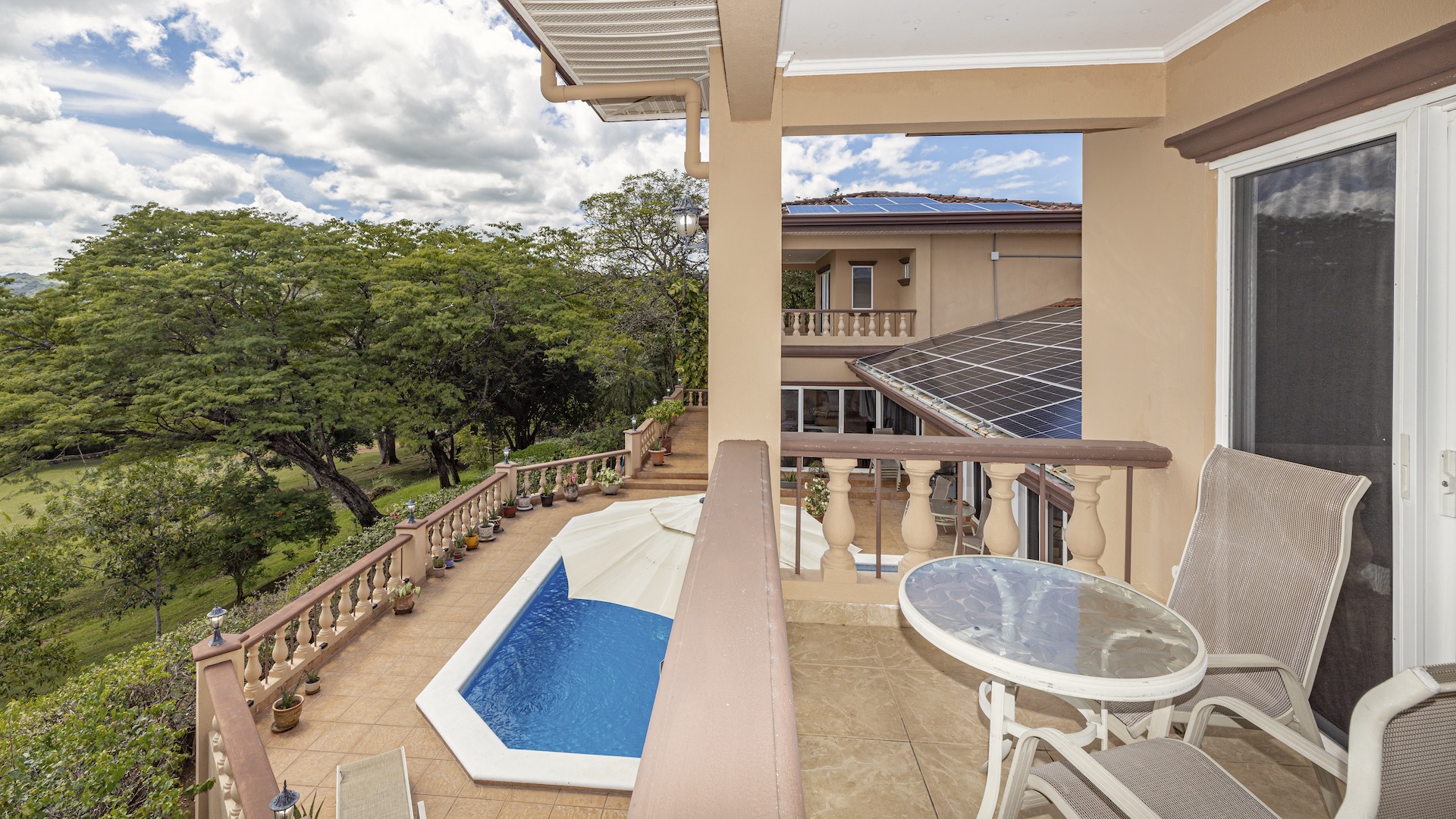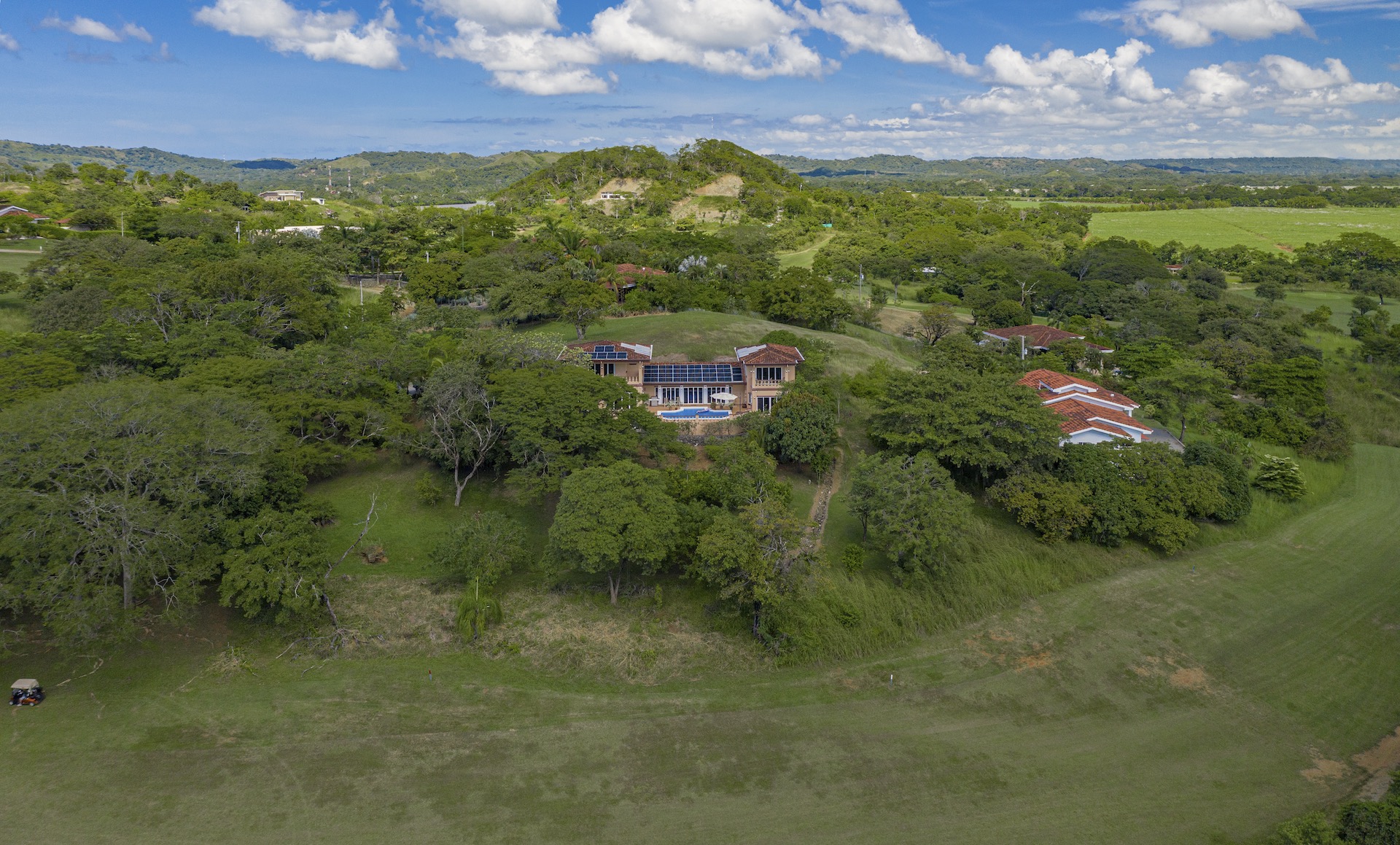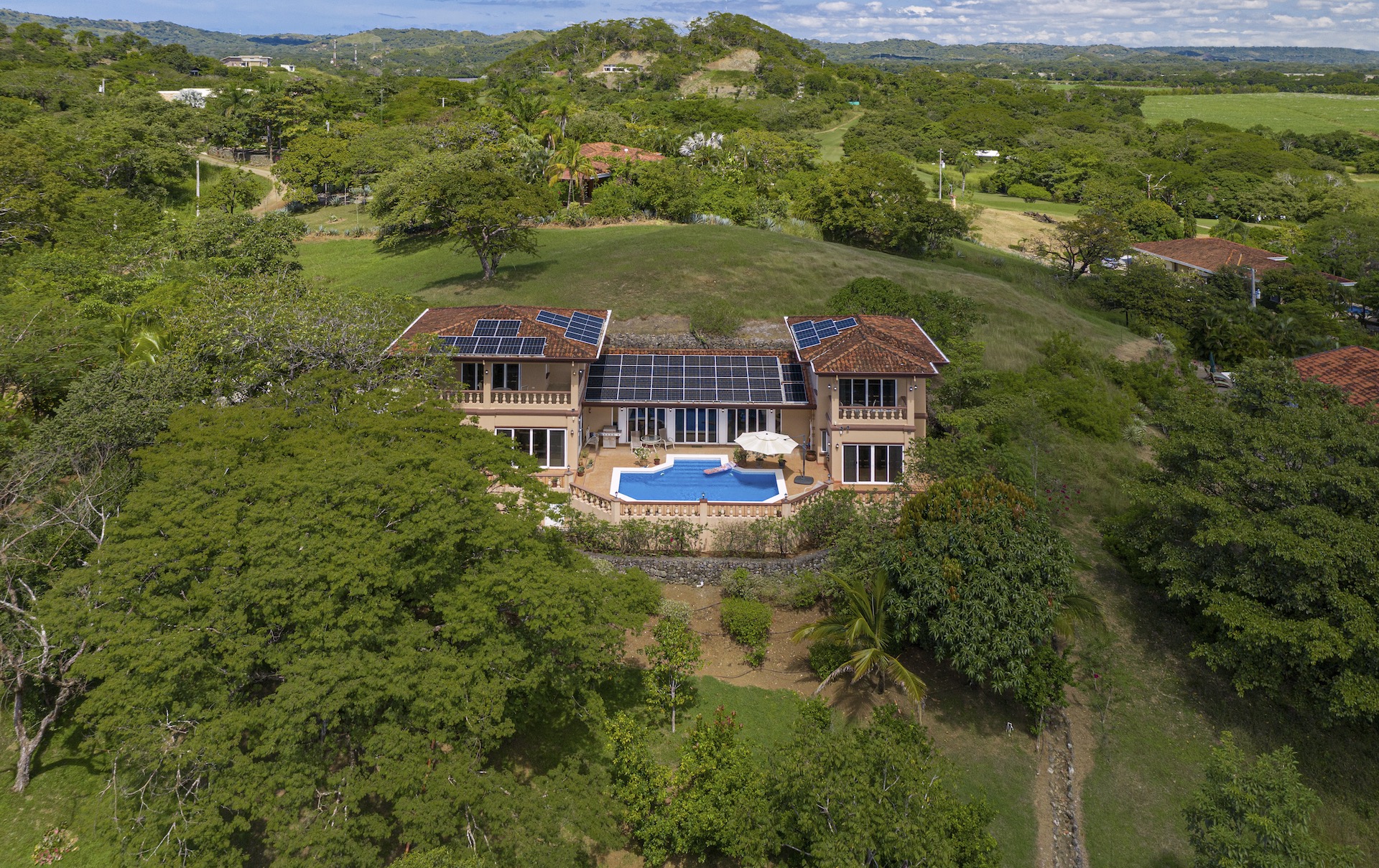 Set along the fairway of the Vista Ridge Golf Course, this tranquil estate home enjoys sweeping views over verdant valleys and distant mountain ranges. Perfectly positioned on an acre and a quarter (5,028 m²), the property is surrounded by mature native trees and lush tropical landscaping designed to attract the region’s vibrant flora and fauna, creating a truly peaceful natural sanctuary.  Step inside the vaulted-ceiling great room, where expansive living and kitchen areas capture stunning views across the large terrace and impressive pool. To one side, a dedicated dining room features floor-to-ceiling windows that frame the outdoor scenery and offer direct access to the pool terrace. The generous outdoor living area includes a covered BBQ pavilion, an outdoor shower, and an oversized terrace that wraps around the amply sized swimming pool—ideal for entertaining or simply relaxing in a serene setting.  Thoughtfully designed for comfort and privacy, the home features four master suites—two on each side of the great room, with one suite upstairs and one downstairs on each wing. All four bedrooms offer direct terrace access, while the two upstairs suites boast luxurious private covered terraces overlooking the forest canopy.  Additional features include Solar Panels, a laundry room, abundant storage, and a spacious attached carport. The home measures 3,000 sq. ft. of interior air-conditioned space and a total of 4,000 sq. ft. including all terraces. Quality finishes such as ceramic tile flooring, granite and marble countertops, and custom cabinetry and doors enhance the home throughout, and it is offered fully furnished for a seamless move-in experience.  Golf enthusiasts will appreciate being able to grab their clubs and step right onto the course from the backyard. Conveniently located just minutes from local restaurants, shopping, and services in Playas del Coco, the property is also just 25 minutes from the Guanacaste International Airport (LIR) and close to medical clinics and full-service hospitals.