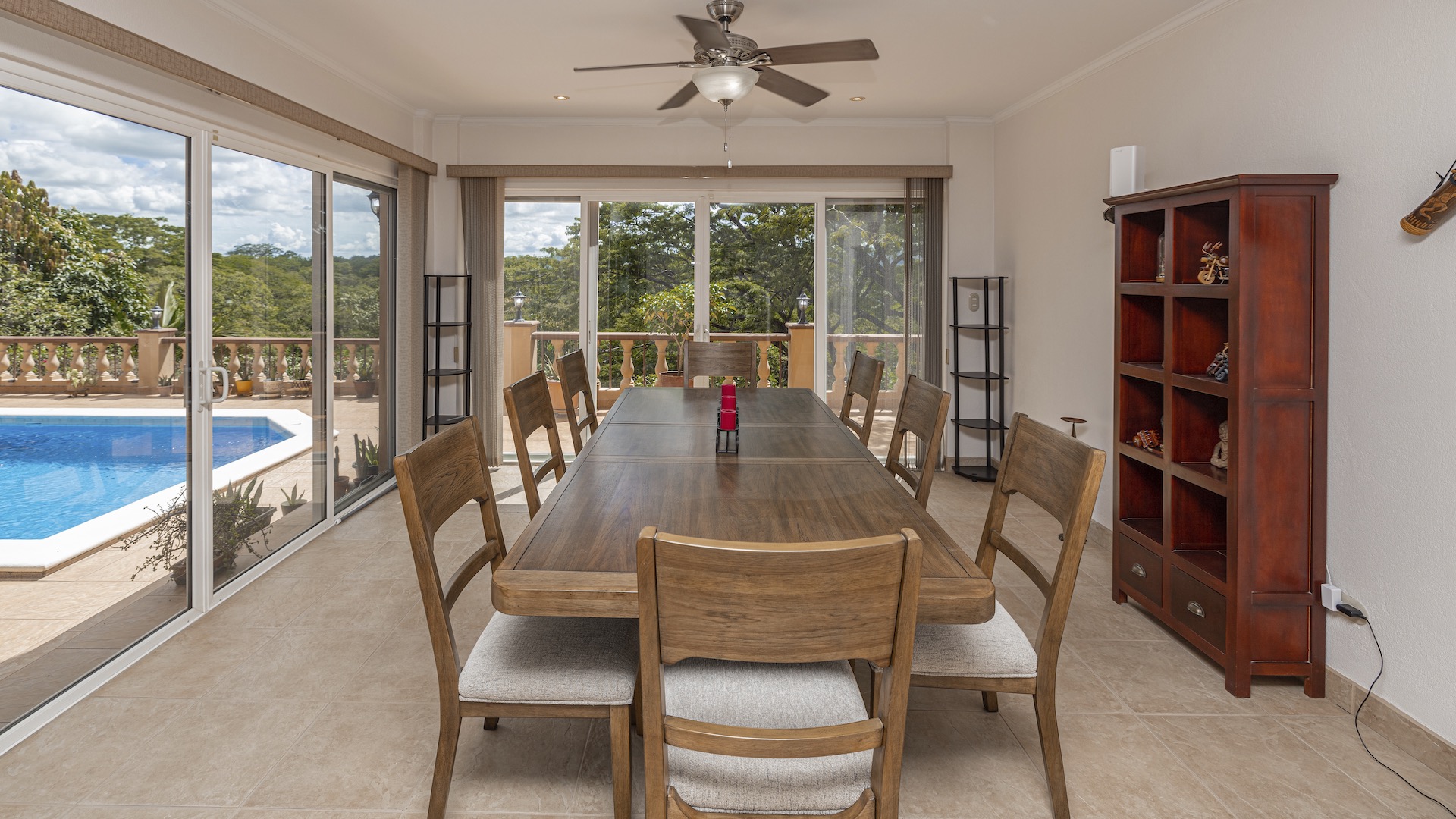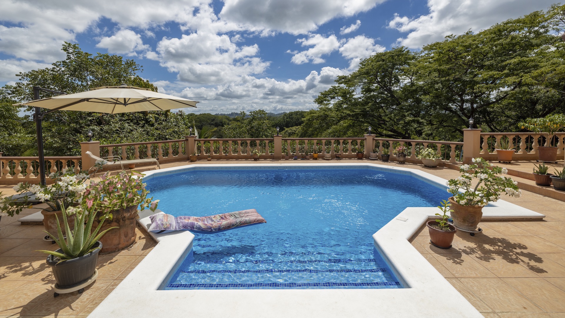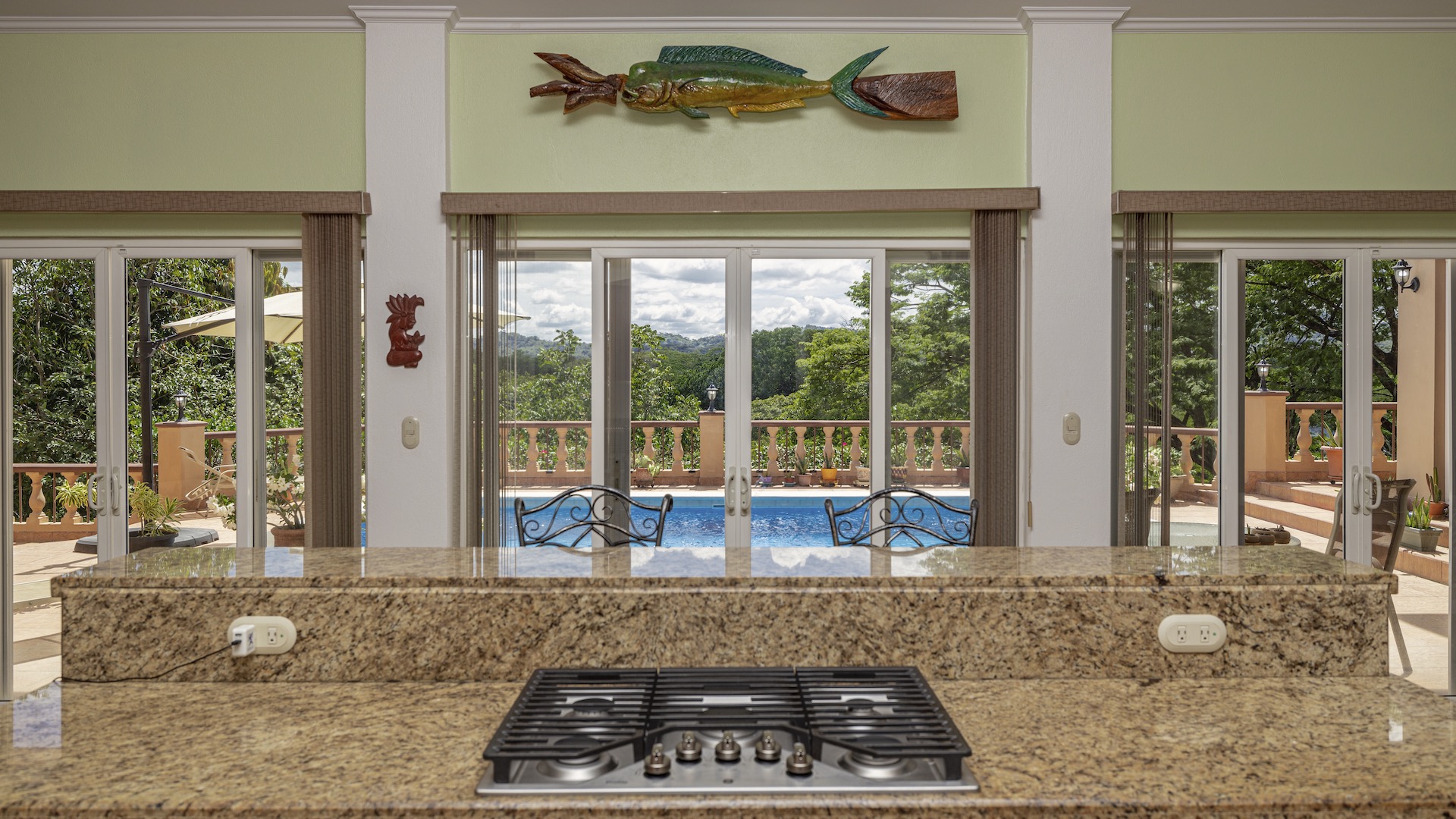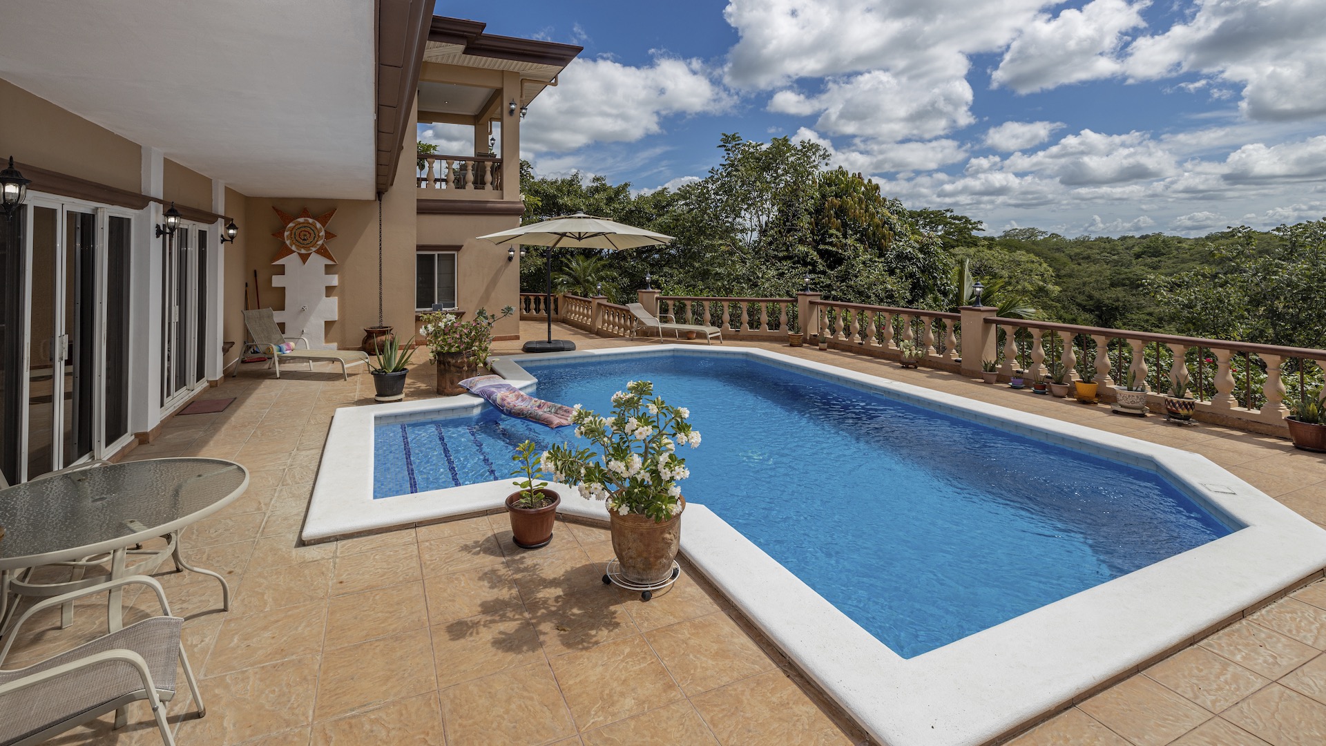 Set along the fairway of the Vista Ridge Golf Course, this tranquil estate home enjoys sweeping views over verdant valleys and distant mountain ranges. Perfectly positioned on an acre and a quarter (5,028 m²), the property is surrounded by mature native trees and lush tropical landscaping designed to attract the region’s vibrant flora and fauna, creating a truly peaceful natural sanctuary.  Step inside the vaulted-ceiling great room, where expansive living and kitchen areas capture stunning views across the large terrace and impressive pool. To one side, a dedicated dining room features floor-to-ceiling windows that frame the outdoor scenery and offer direct access to the pool terrace. The generous outdoor living area includes a covered BBQ pavilion, an outdoor shower, and an oversized terrace that wraps around the amply sized swimming pool—ideal for entertaining or simply relaxing in a serene setting.  Thoughtfully designed for comfort and privacy, the home features four master suites—two on each side of the great room, with one suite upstairs and one downstairs on each wing. All four bedrooms offer direct terrace access, while the two upstairs suites boast luxurious private covered terraces overlooking the forest canopy.  Additional features include Solar Panels, a laundry room, abundant storage, and a spacious attached carport. The home measures 3,000 sq. ft. of interior air-conditioned space and a total of 4,000 sq. ft. including all terraces. Quality finishes such as ceramic tile flooring, granite and marble countertops, and custom cabinetry and doors enhance the home throughout, and it is offered fully furnished for a seamless move-in experience.  Golf enthusiasts will appreciate being able to grab their clubs and step right onto the course from the backyard. Conveniently located just minutes from local restaurants, shopping, and services in Playas del Coco, the property is also just 25 minutes from the Guanacaste International Airport (LIR) and close to medical clinics and full-service hospitals.