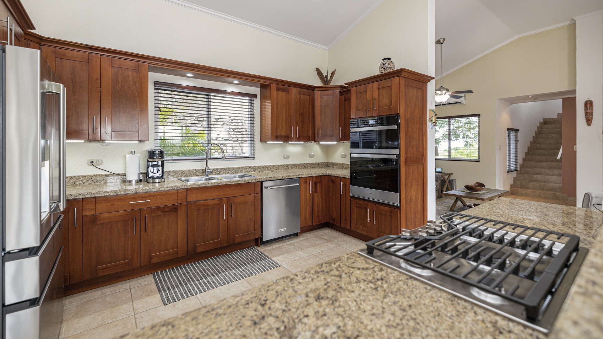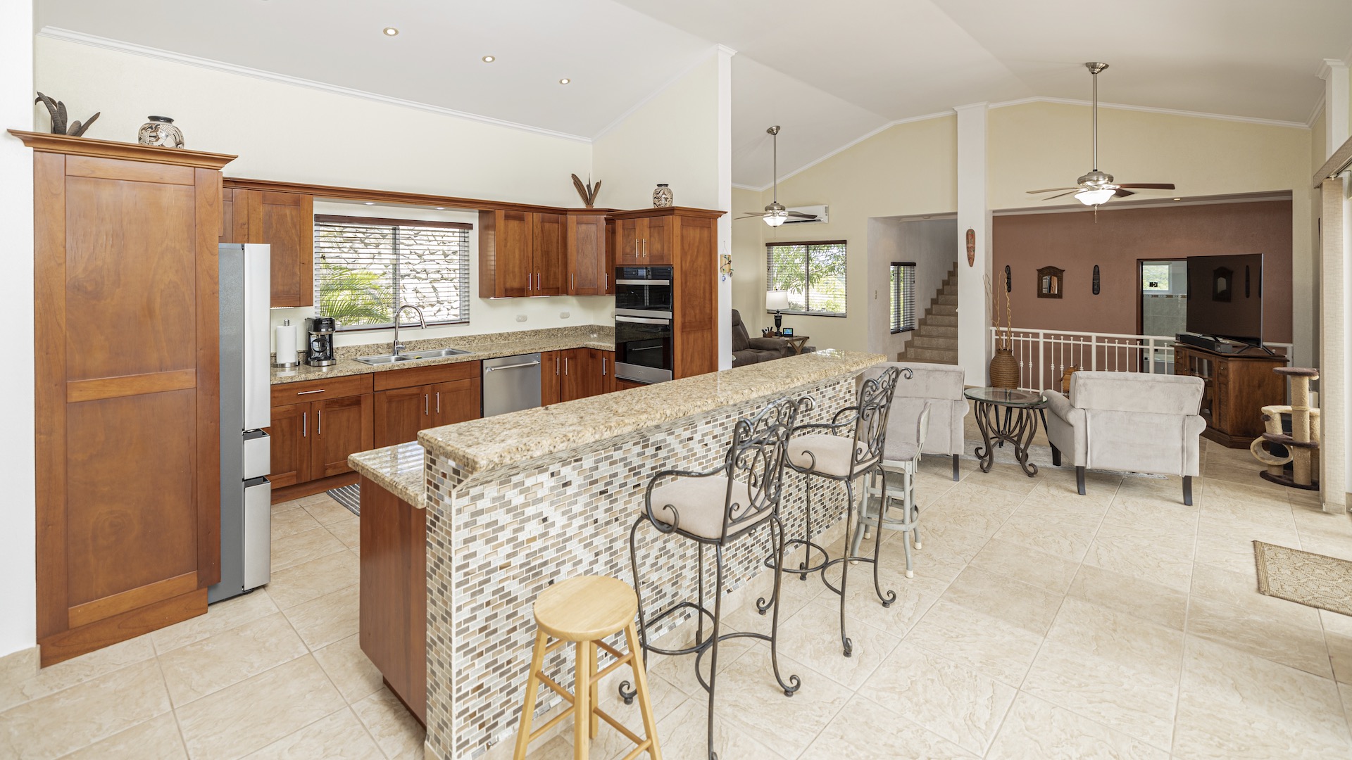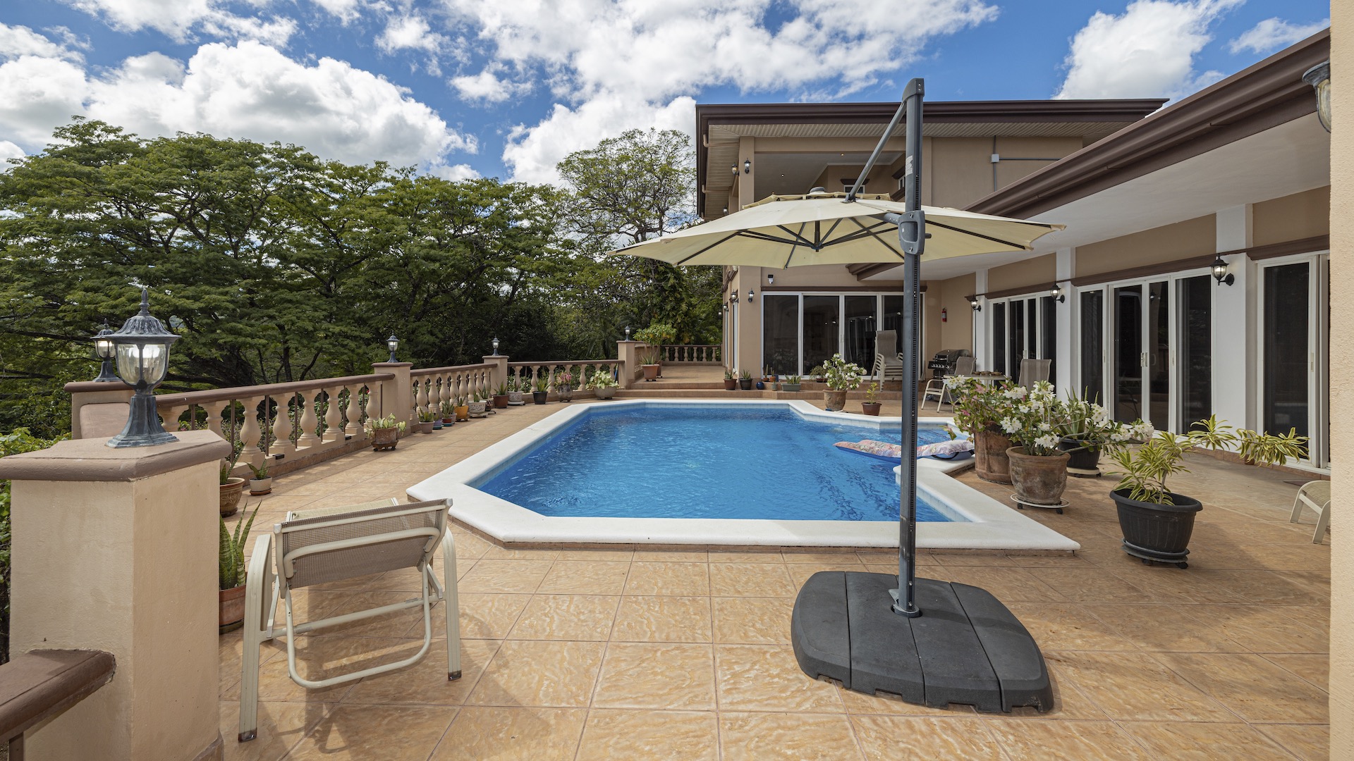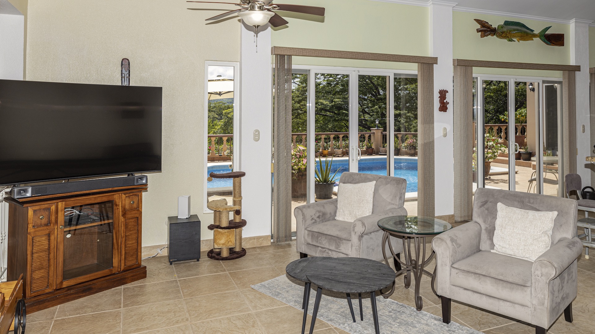 Set along the fairway of the Vista Ridge Golf Course, this tranquil estate home enjoys sweeping views over verdant valleys and distant mountain ranges. Perfectly positioned on an acre and a quarter (5,028 m²), the property is surrounded by mature native trees and lush tropical landscaping designed to attract the region’s vibrant flora and fauna, creating a truly peaceful natural sanctuary.  Step inside the vaulted-ceiling great room, where expansive living and kitchen areas capture stunning views across the large terrace and impressive pool. To one side, a dedicated dining room features floor-to-ceiling windows that frame the outdoor scenery and offer direct access to the pool terrace. The generous outdoor living area includes a covered BBQ pavilion, an outdoor shower, and an oversized terrace that wraps around the amply sized swimming pool—ideal for entertaining or simply relaxing in a serene setting.  Thoughtfully designed for comfort and privacy, the home features four master suites—two on each side of the great room, with one suite upstairs and one downstairs on each wing. All four bedrooms offer direct terrace access, while the two upstairs suites boast luxurious private covered terraces overlooking the forest canopy.  Additional features include Solar Panels, a laundry room, abundant storage, and a spacious attached carport. The home measures 3,000 sq. ft. of interior air-conditioned space and a total of 4,000 sq. ft. including all terraces. Quality finishes such as ceramic tile flooring, granite and marble countertops, and custom cabinetry and doors enhance the home throughout, and it is offered fully furnished for a seamless move-in experience.  Golf enthusiasts will appreciate being able to grab their clubs and step right onto the course from the backyard. Conveniently located just minutes from local restaurants, shopping, and services in Playas del Coco, the property is also just 25 minutes from the Guanacaste International Airport (LIR) and close to medical clinics and full-service hospitals.